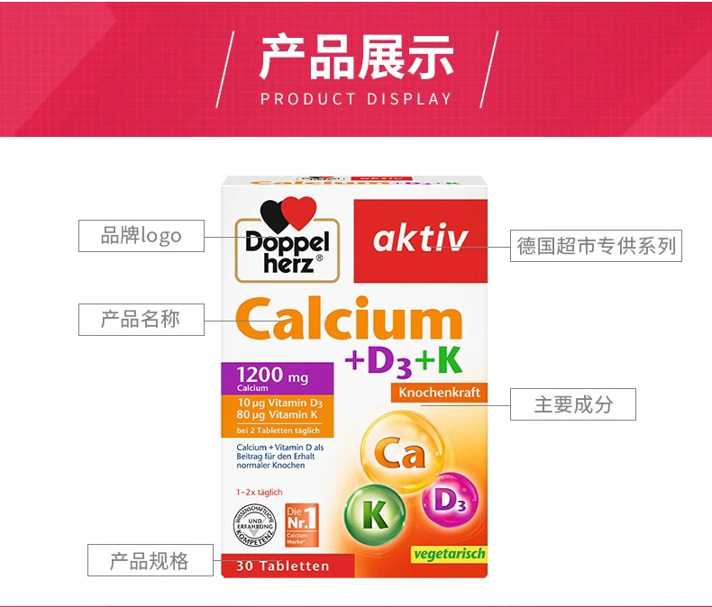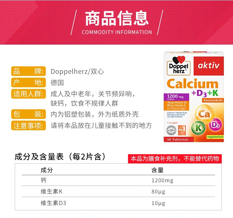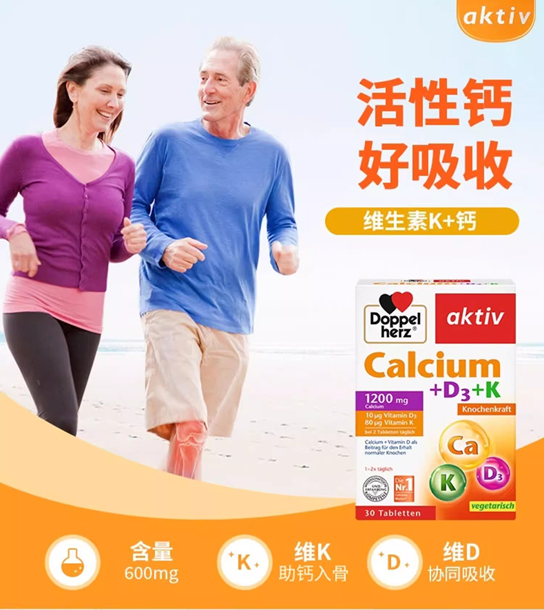 【德国双心】进口钙片维生素K+D3成年壮骨钙片 2-3-4-6盒