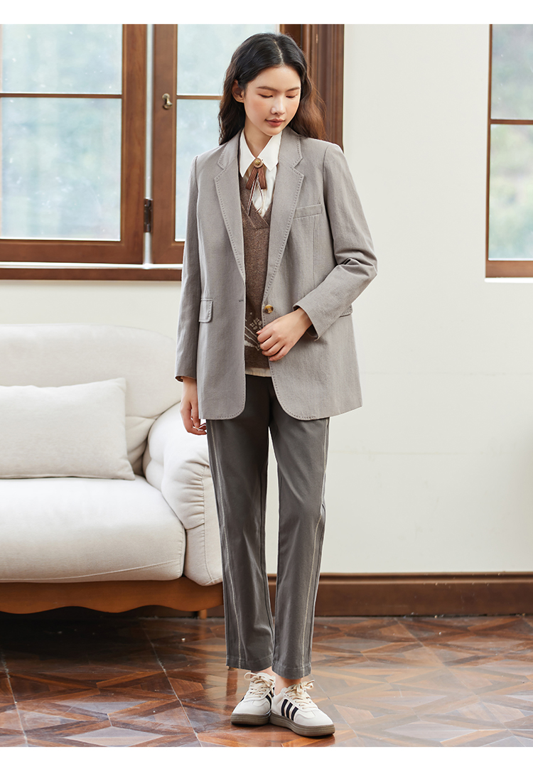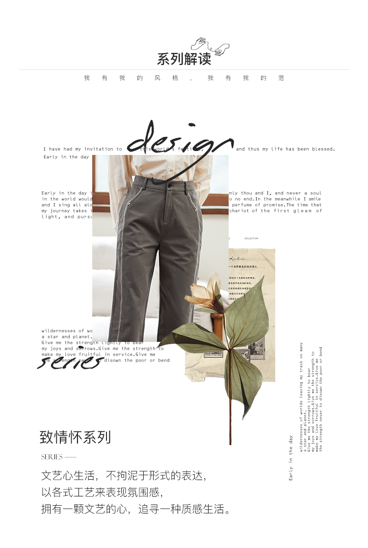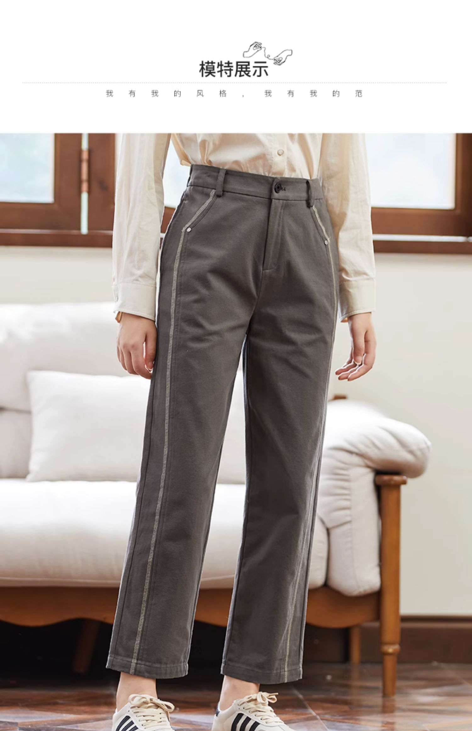 famecoco范可儿全棉松紧腰女士休闲裤秋款撞色直筒休闲通勤长裤F225GA007
