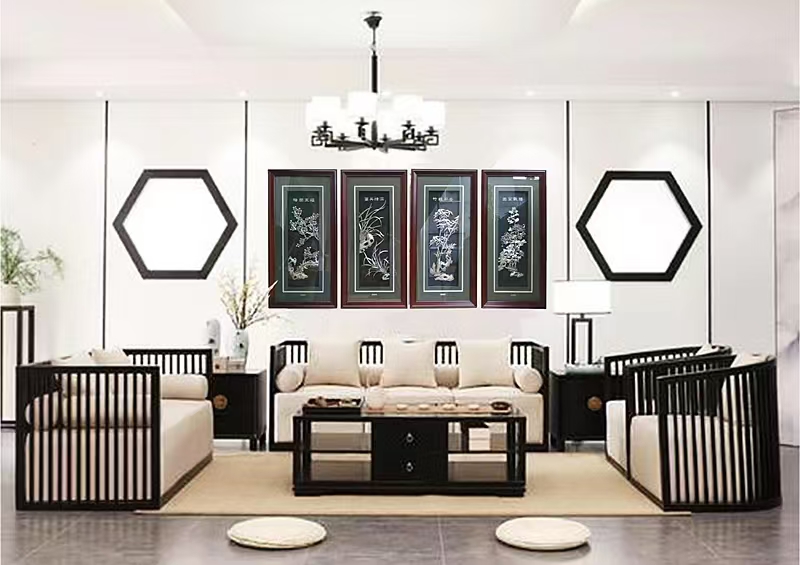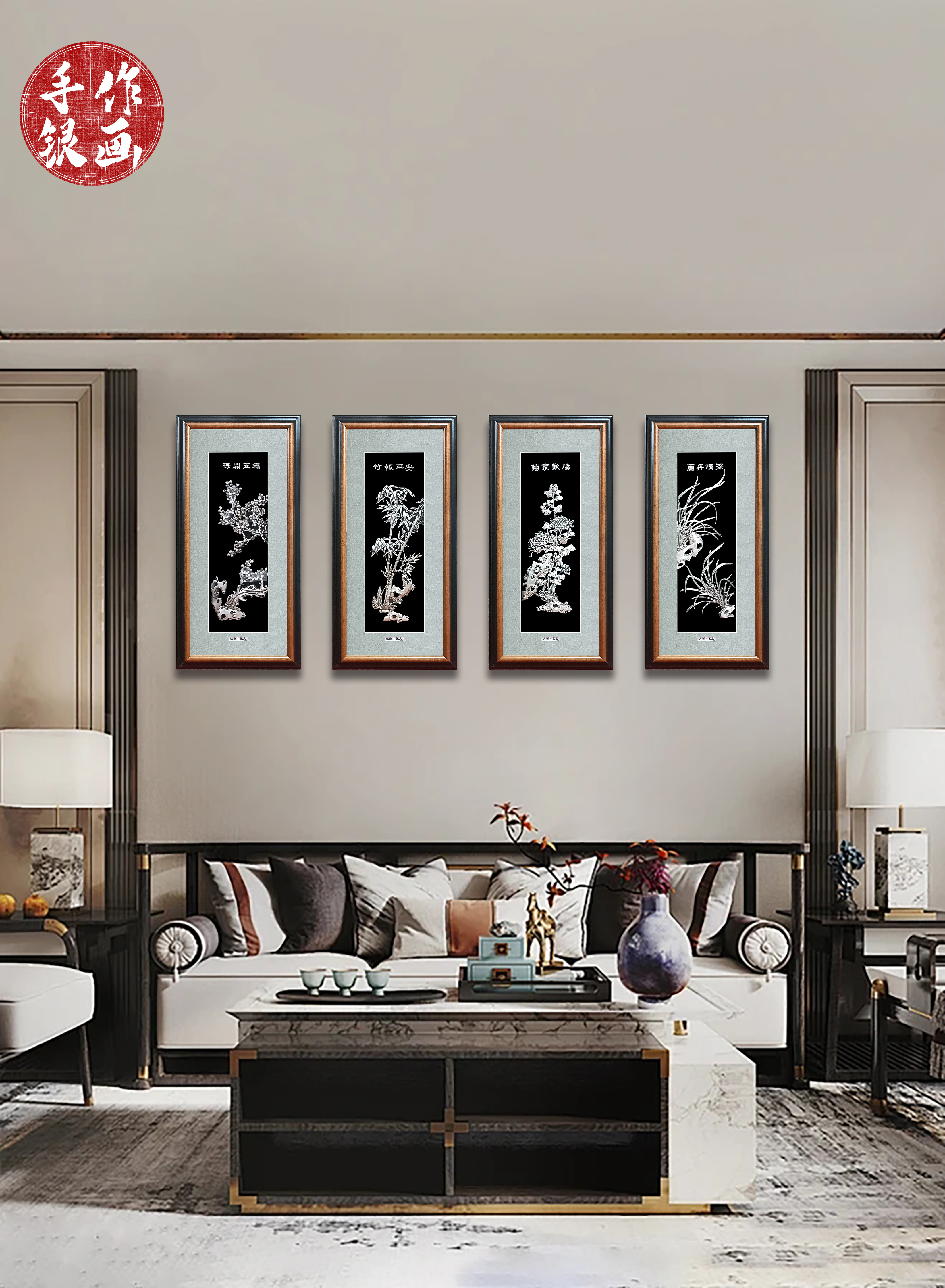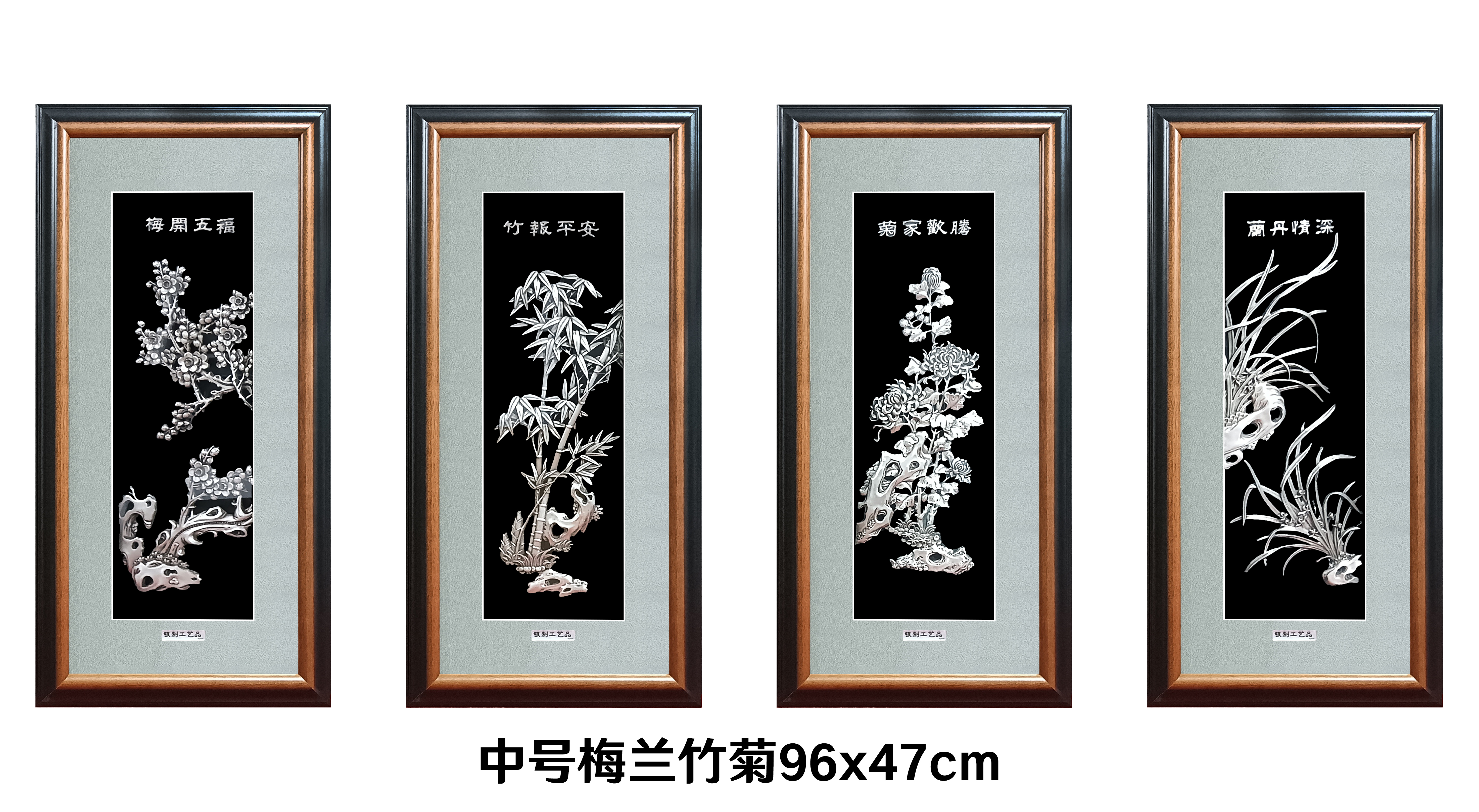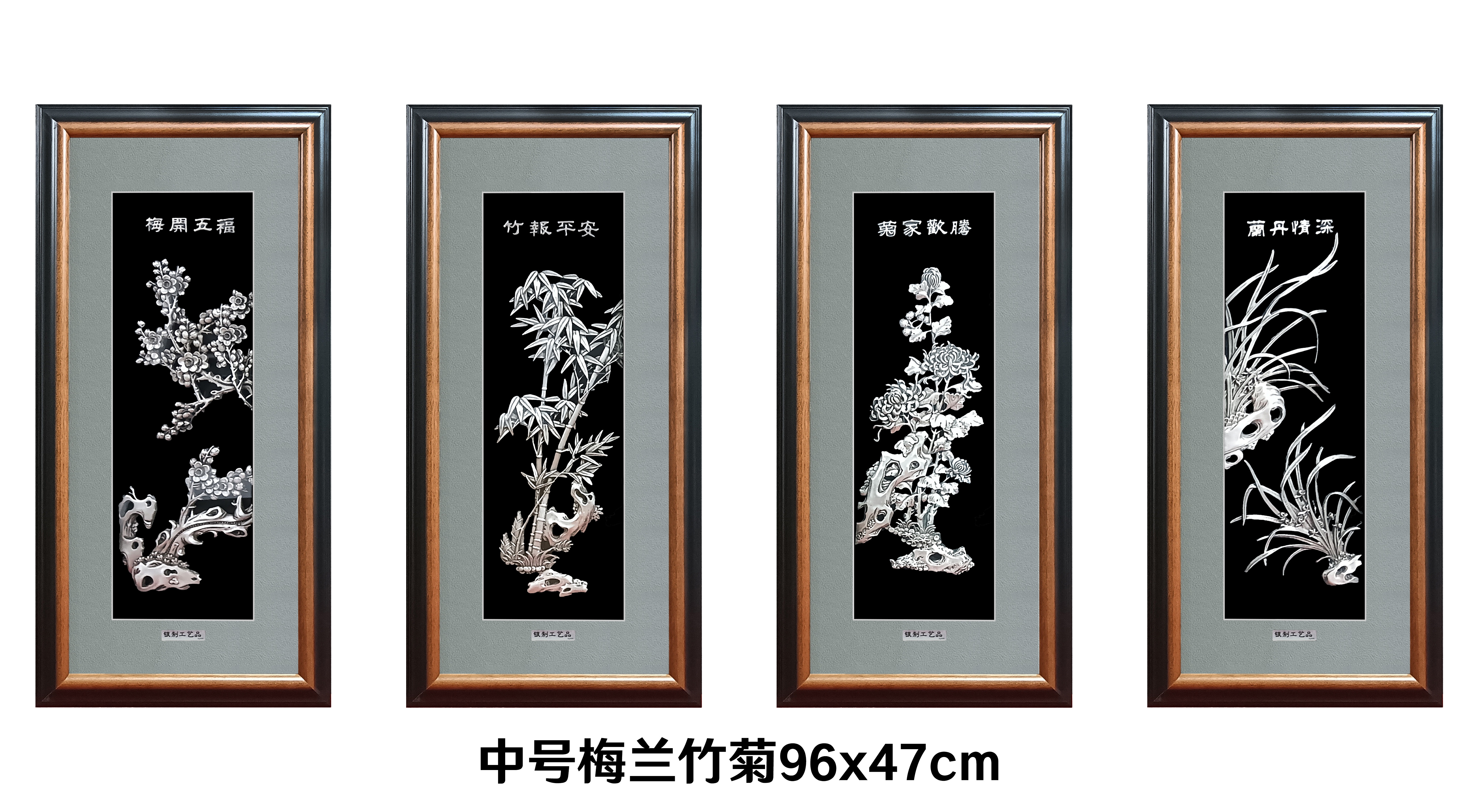 【寓意】:作品以“四君子”为灵感制作。梅花清雅怡人,兰花秀逸翩翩,墨竹清韵悠悠,菊花冷秀。观之可陶冶情操,修身养性。