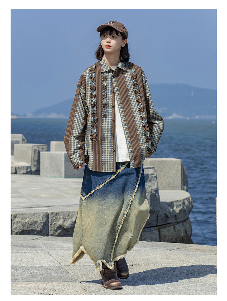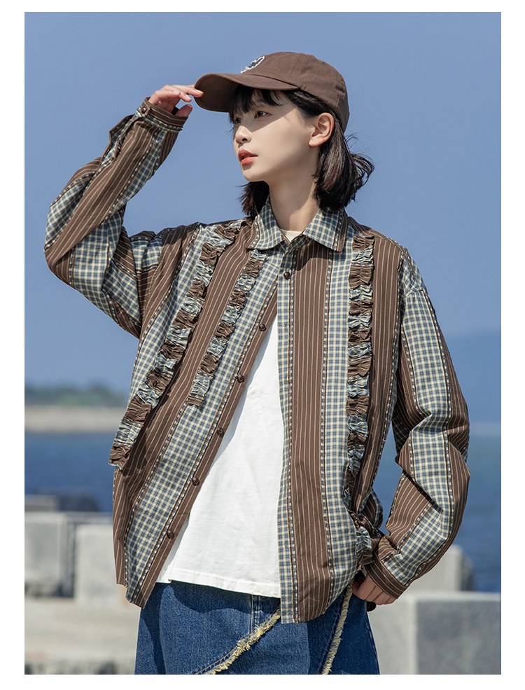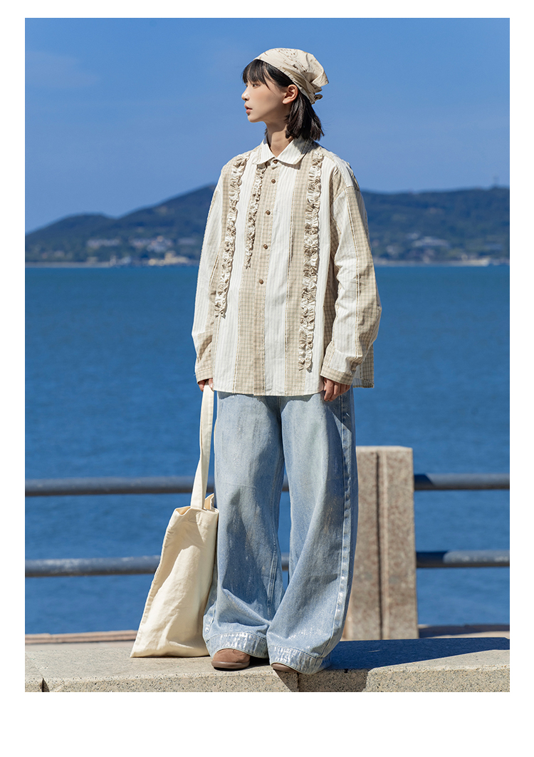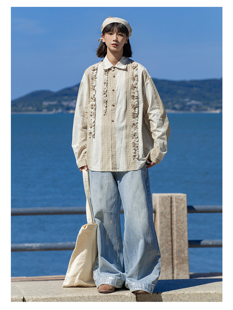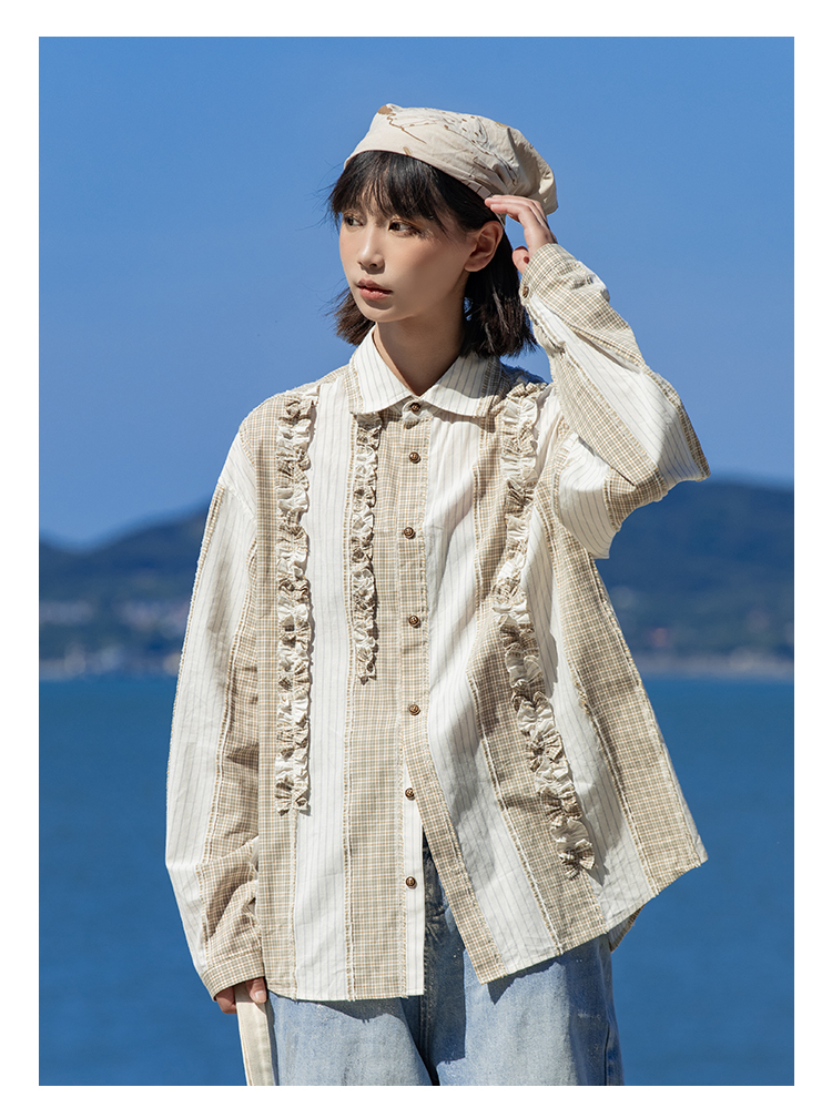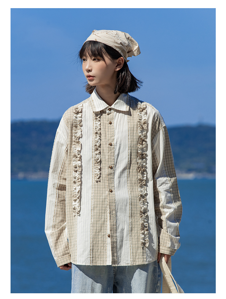 早乙女惠子saotome/STMCS243157/不规则条格木耳边长袖衬衫