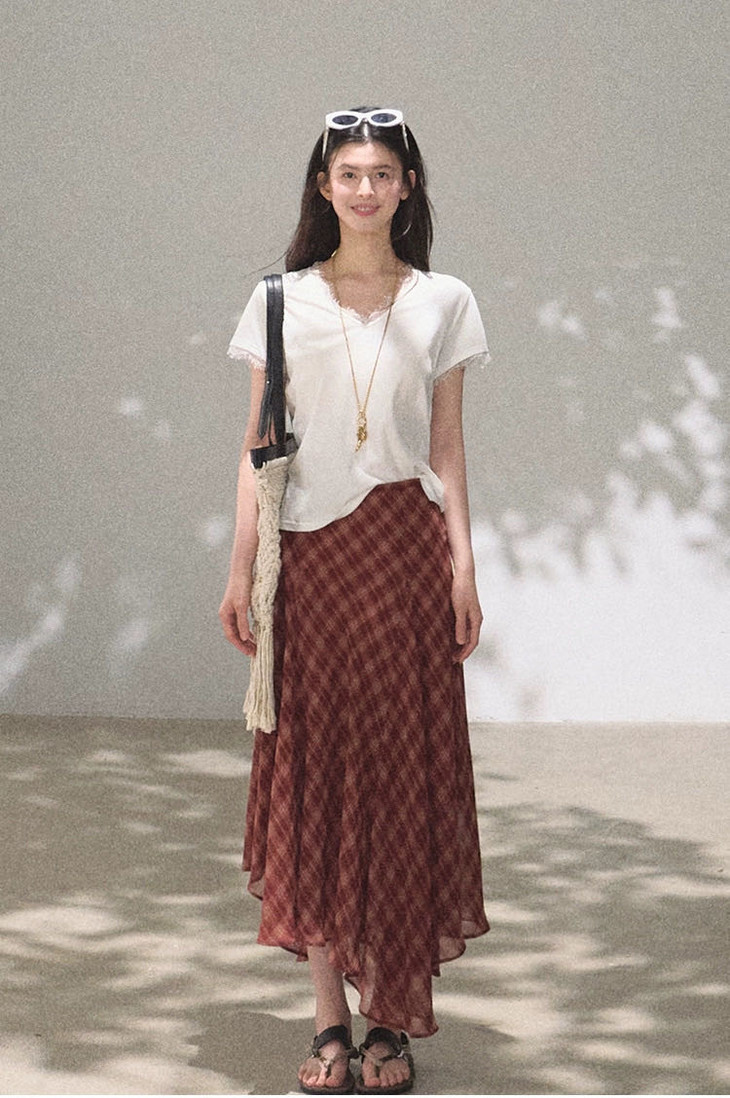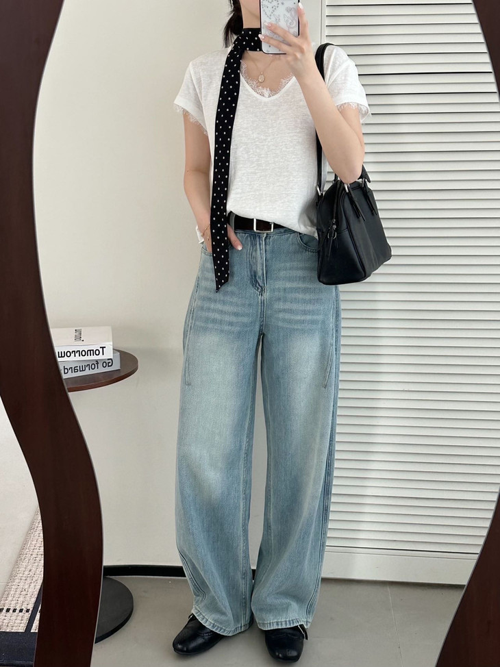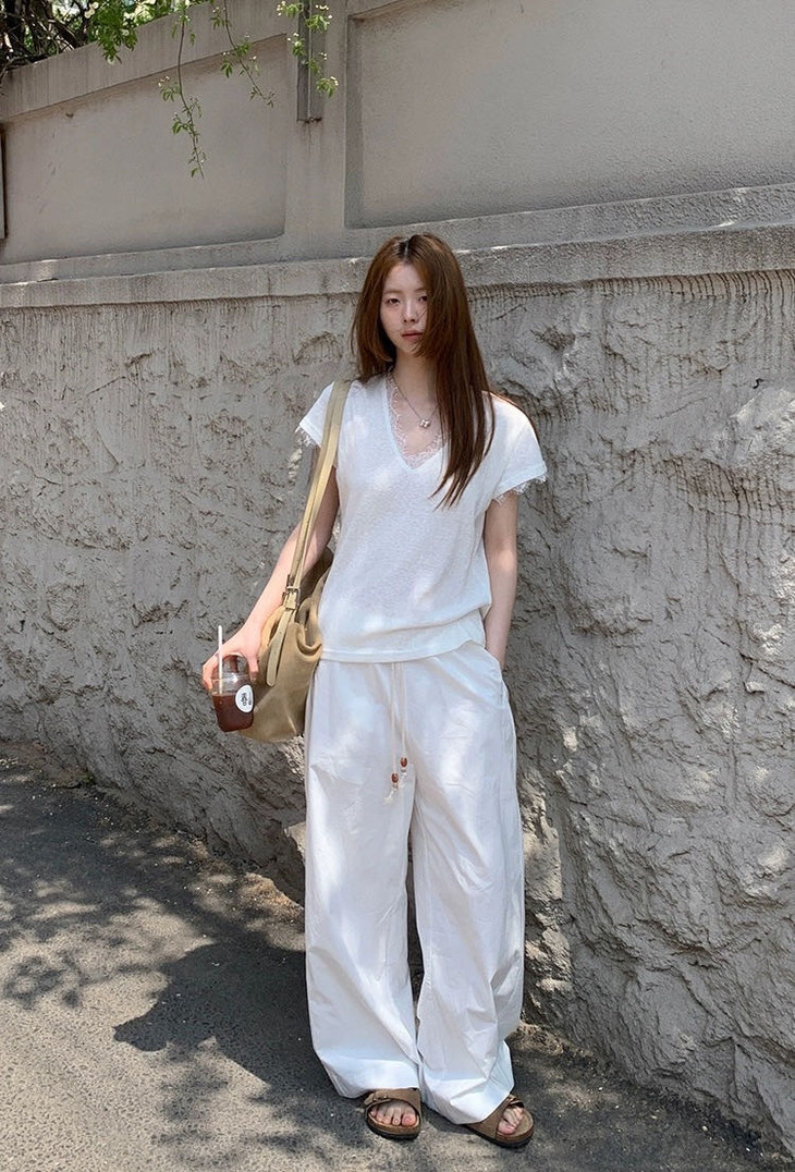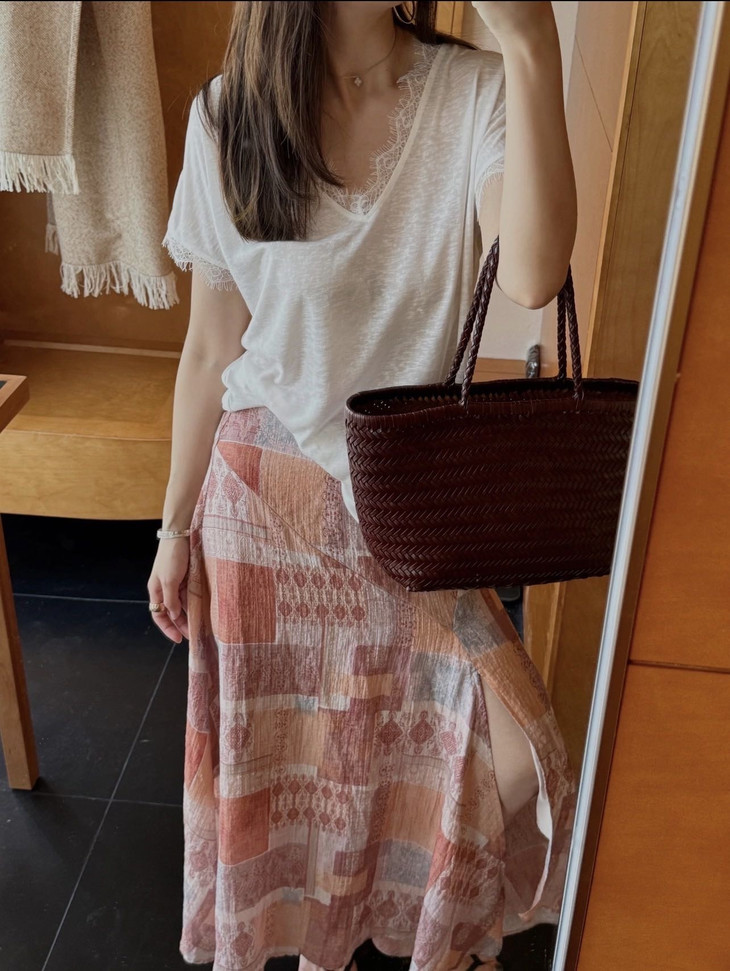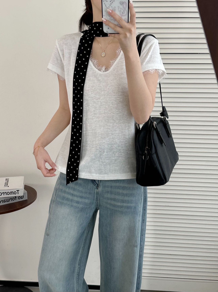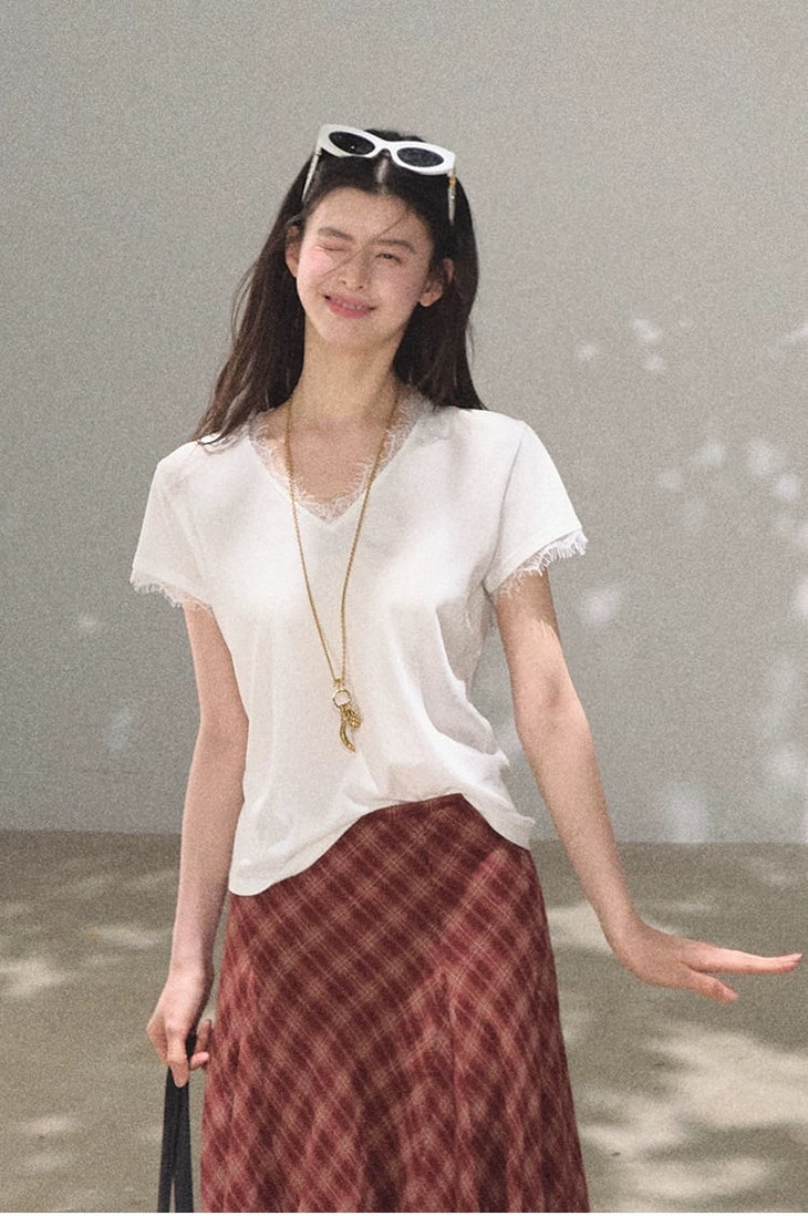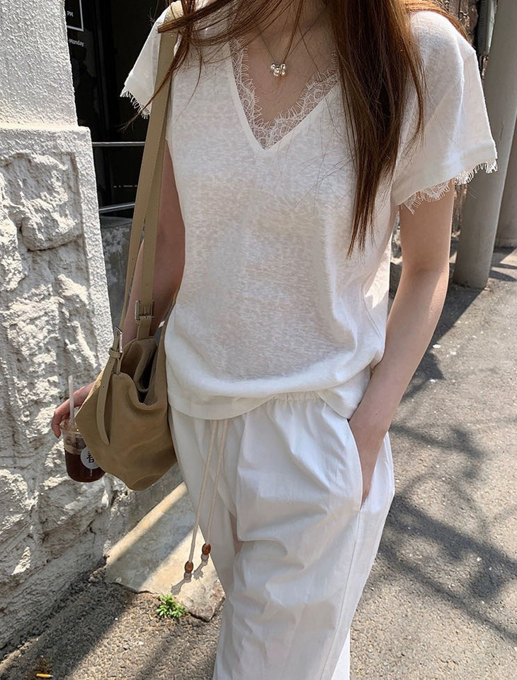 夏日炎炎,是时候为自己准备一款时尚又凉爽的T恤了! 这款T巧妙地融合了袖口与领口的蕾丝边边装饰 增添了几分浪漫与柔美,无论是日常出行还是约会聚会~都能轻松驾驭! 面料自带肌理感,不仅丰富了视觉层次 更提升了整体的品质感,穿着起来极为舒适 特别值得一提的是其V领设计,巧妙拉长颈部线条,修饰脸型! 版型面料太正了,剪裁得体,无论是从哪个角度看都是一件集美观与实穿性于一体的上衣! 真的是墙烈推荐,轻松搭配各种下装‼️