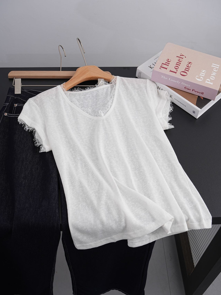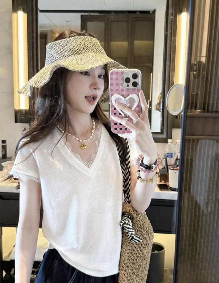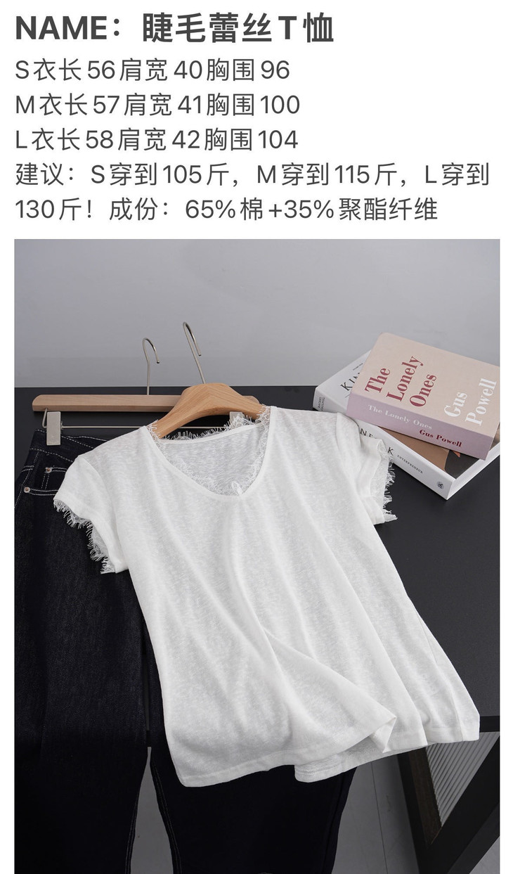 💕温柔狙击‼️【睫毛蕾丝T恤】这件蕾丝边T恤,🌱把浪漫穿在了身上! 🌈V领设计轻松get天鹅颈,气质这块拿捏的死死的!👋进口雪花棉自带肌理感,肉眼可见的舒适度~