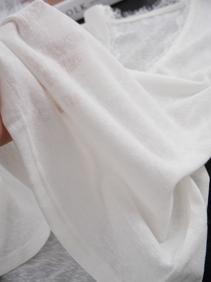 以下团长实拍: 这款T巧妙地融合了袖口与领口的蕾丝边边装饰增添了几分浪漫与柔美~ 无论是日常出行还是约会聚会 都能轻松驾驭,展现你的独特魅力! 采用进口雪花棉面料,触感柔软细腻,让人一穿上便爱不释手~ 面料自带肌理感,不仅丰富了视觉层次 更提升了整体的品质感,穿着起来极为舒适 V领设计,巧妙拉长颈部线条,修饰脸型 让整体造型更加优雅大方! 经典白色,干净利落,这件真的没有理由不留!
