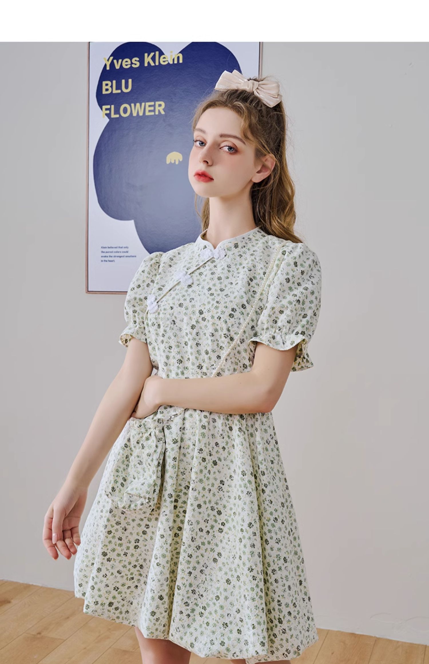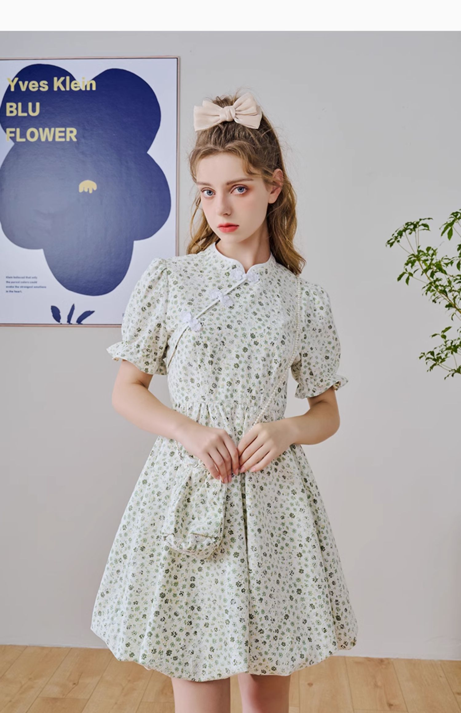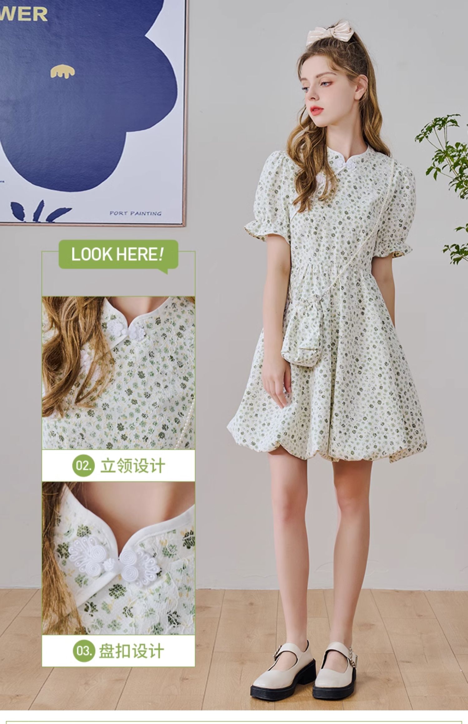 mc2碎花连衣裙带小包中式立领盘扣设计小个子连衣裙