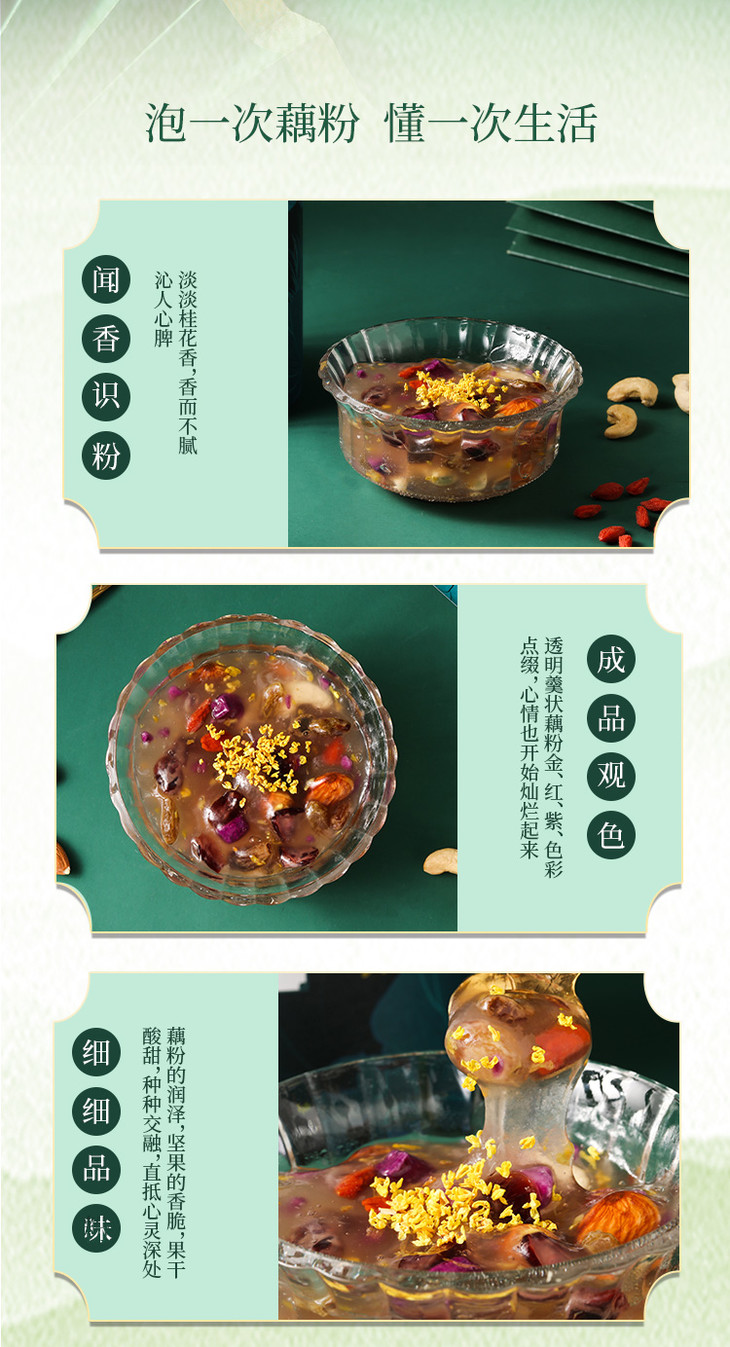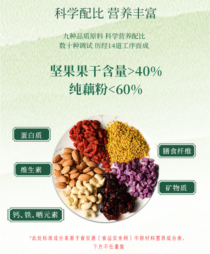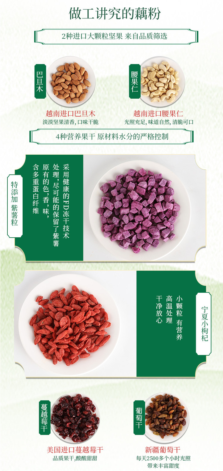 配料/成分:藕粉,冰糖,葡萄干,蔓越莓,腰果仁,巴旦木,冻干紫薯,枸杞,桂花(坚果果仁>40%)