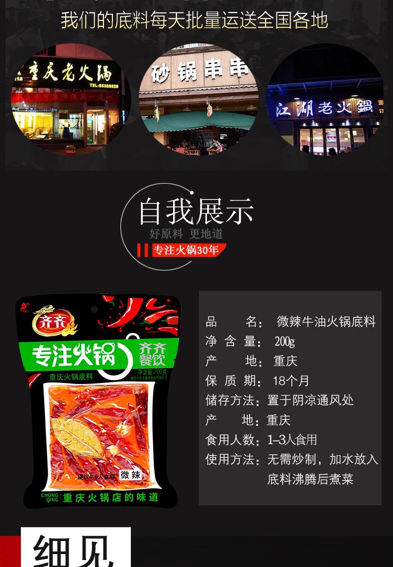 重庆特产【齐齐火锅底料】微辣特辣精品牛油老火锅手工制作调料