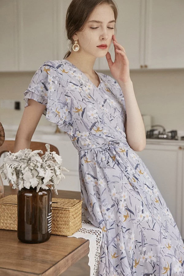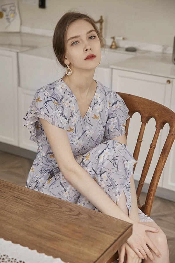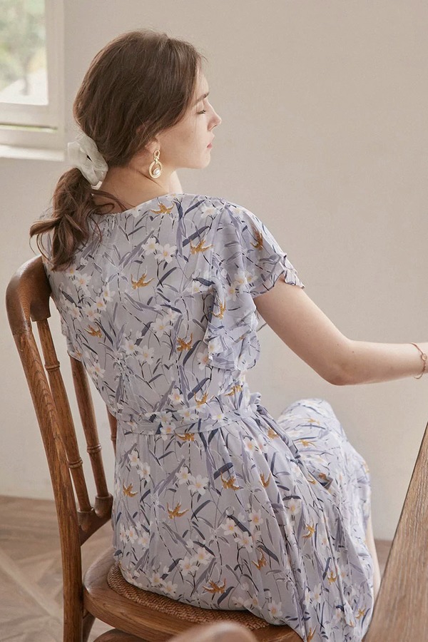 SOUREPOSE V领荷叶袖碎花连衣裙 12477
