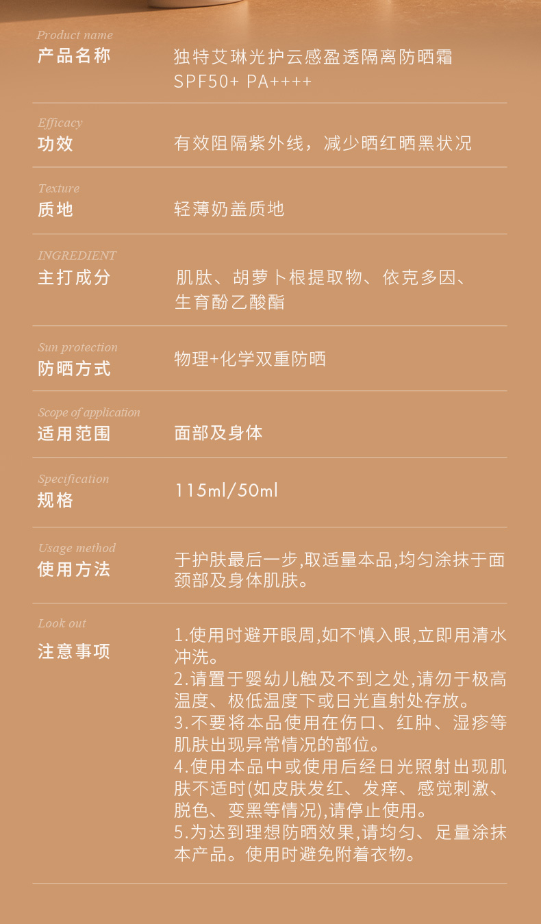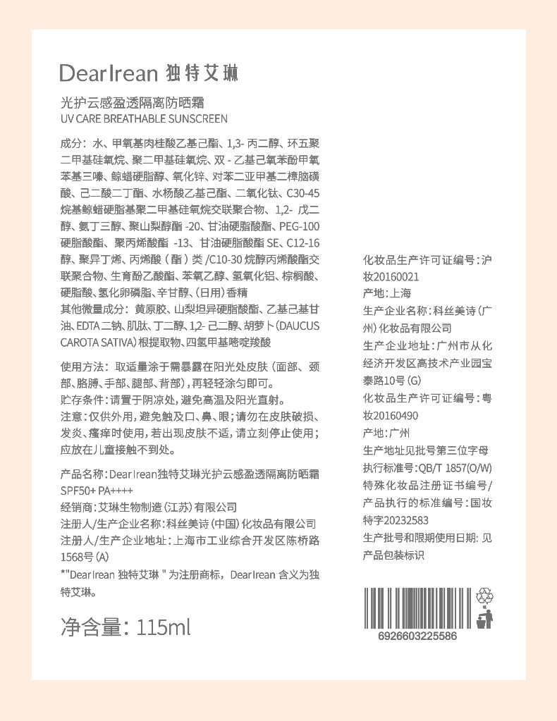 【U先试用】DearIrean 独特艾琳水感防晒素颜霜SPF30PA++5ml*4片尝鲜装(确认收货后3天内赠送20元无门槛对应正装回购优惠券,每个ID限参与1次)