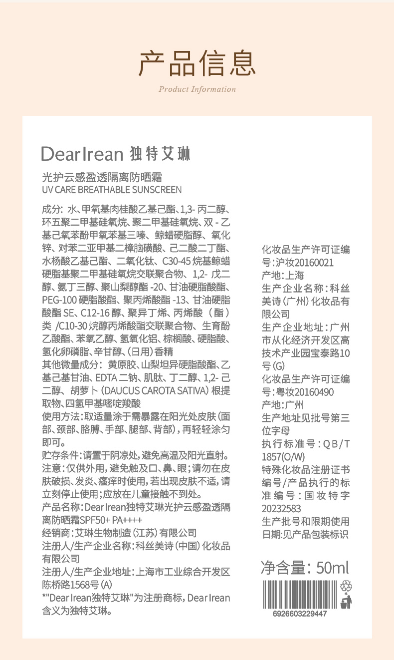 - DearIrean 独特艾琳,高定香氛生活品牌,拥有体•研究所,品牌致力于将高定香氛带入生活,同时倡导“以香之名,带给生活美好方式”的品牌理念,传递精致女性的爱、独立、自信。