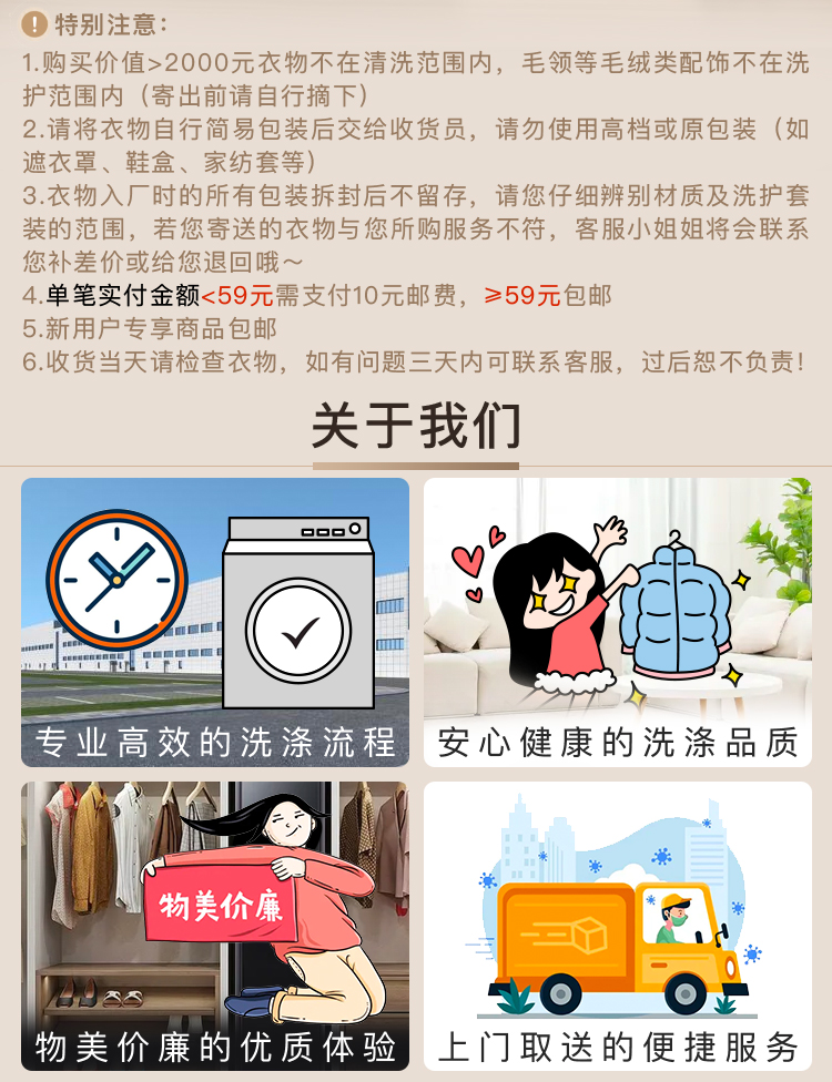 5、衣物清洗时效为3-5天,不包含物流时间。
