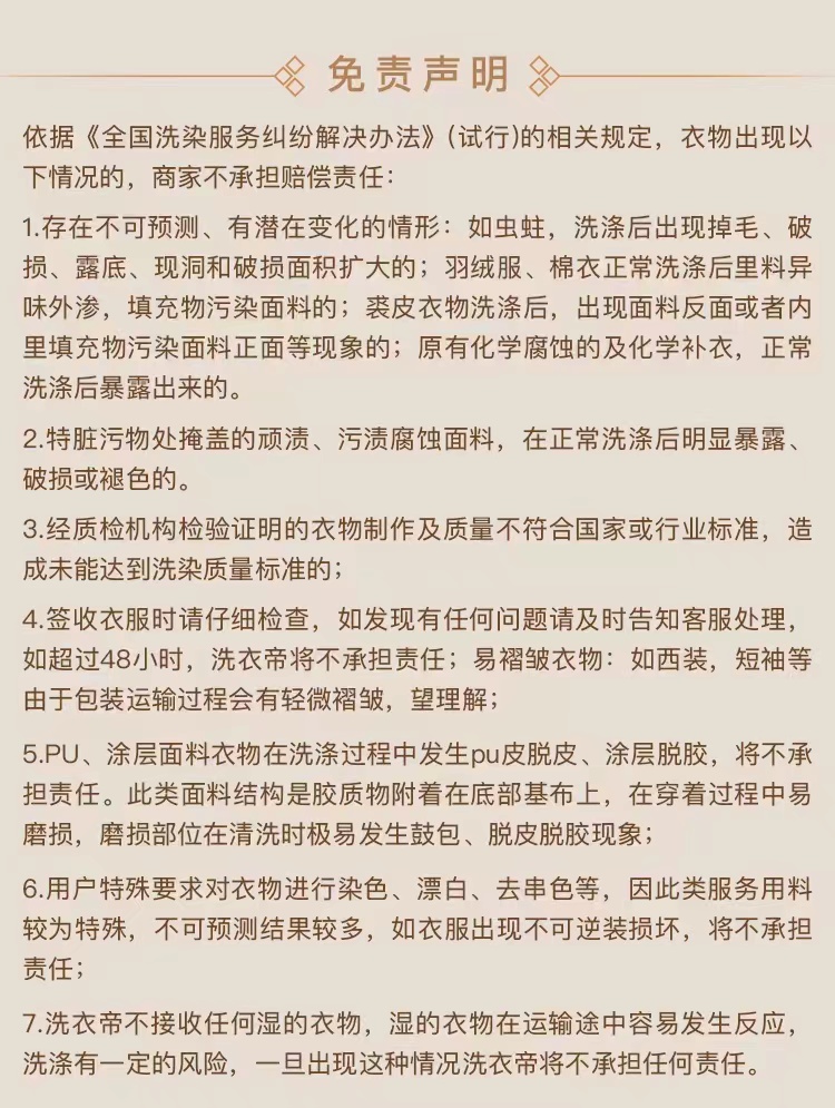 4、如果在衣物清洗过程中遇到难以去除的污渍会进行淡化处理,但不保证可以完全去除,若遇到该情况会挂牌通知用户;