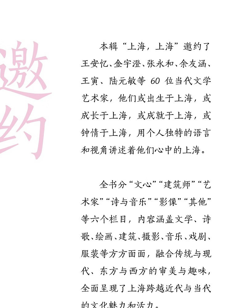 1. 本辑“上海,上海”邀约了60位当代文学艺术家,他们或出生于上海,或成长于上海,或成就于上海,或钟情于上海,他们用个人独特的语言和视角讲述着他们心中的上海,内容涵盖文学、诗歌、绘画、建筑、摄影、音乐、戏剧、服装等方方面面,融合传统与现代、东方与西方的审美与趣味,全面呈现了上海跨越近代与当代的文化魅力和活力。