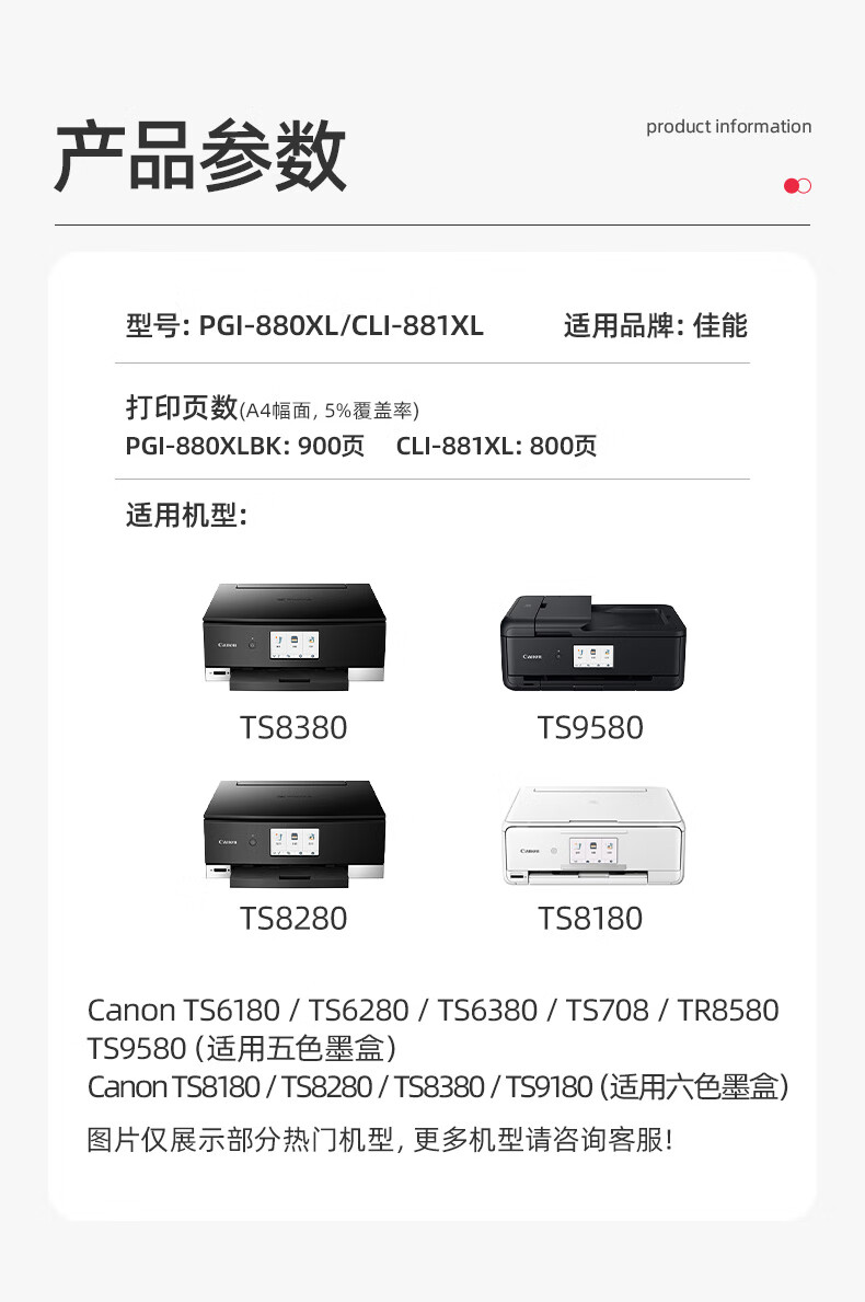 绘威PGI-880XL墨盒可加墨 适用佳能TS8380 TS9580 TS8180 9180 6180 8280 TR8580 708t打印机墨盒CLI-881 六色套装