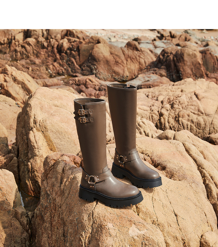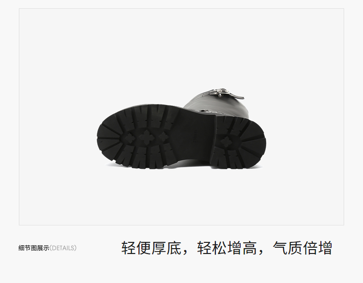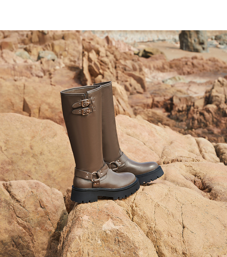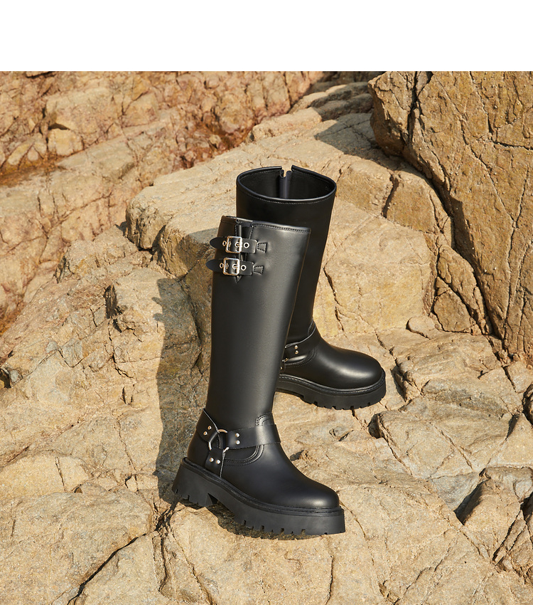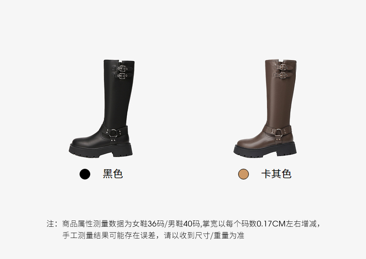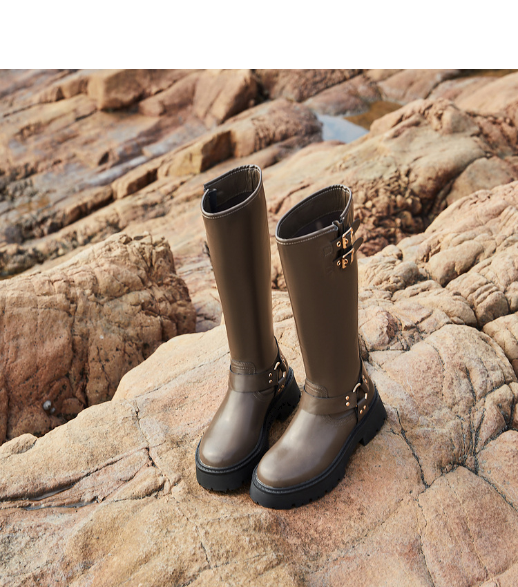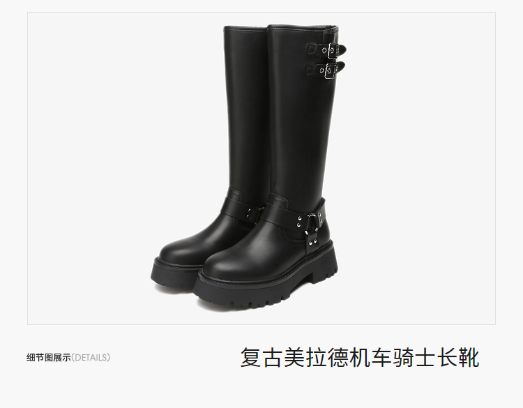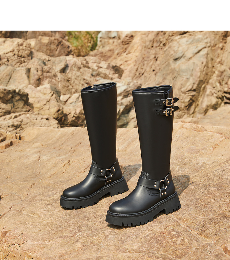 西遇厚底机车靴女新款秋冬美式西部牛仔长筒骑士靴小个子长靴D0034377