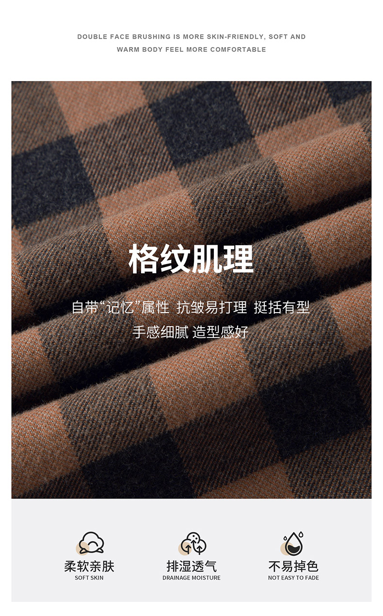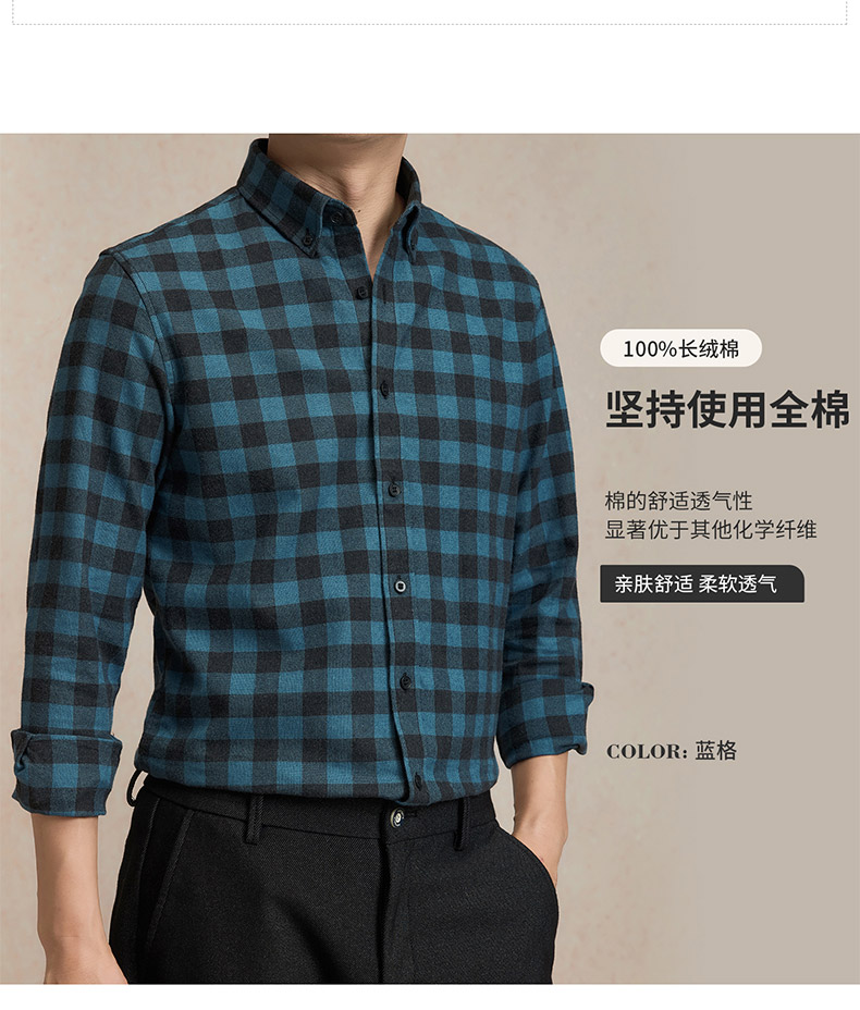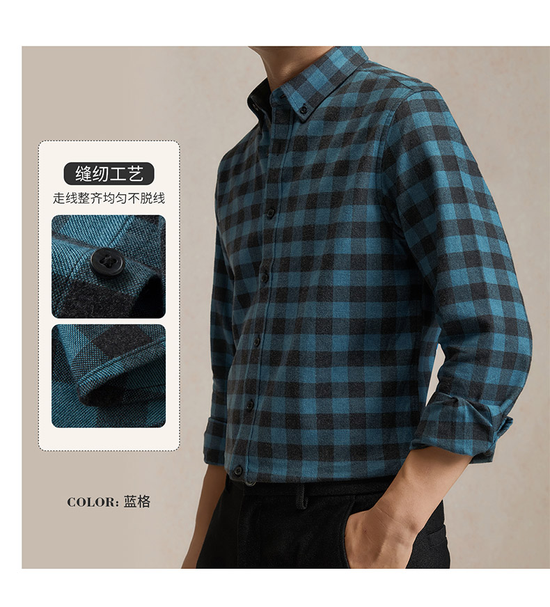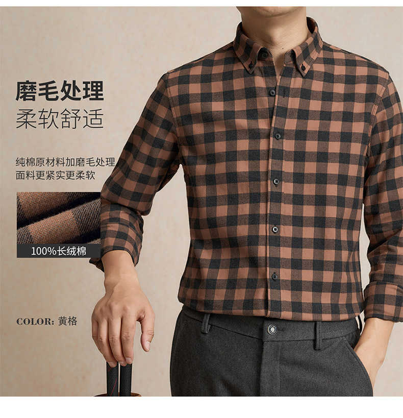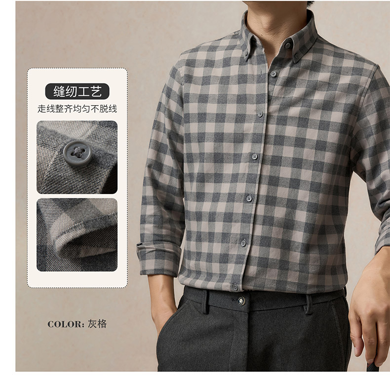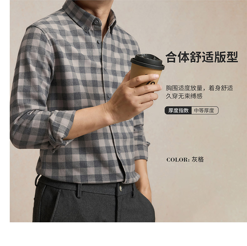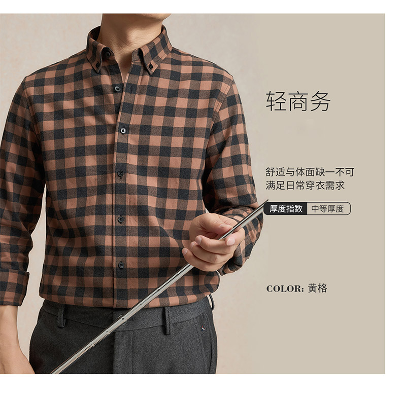 【全棉】罗蒙秋冬格子长袖衬衫男士纯棉厚款舒适亲肤百搭休闲男士长袖衬衣