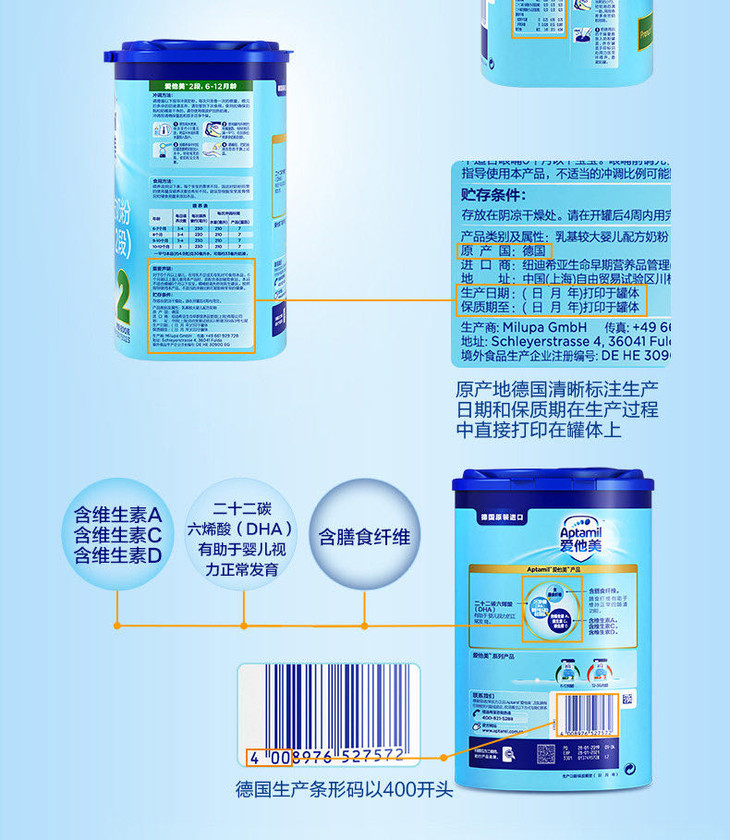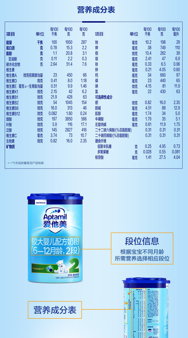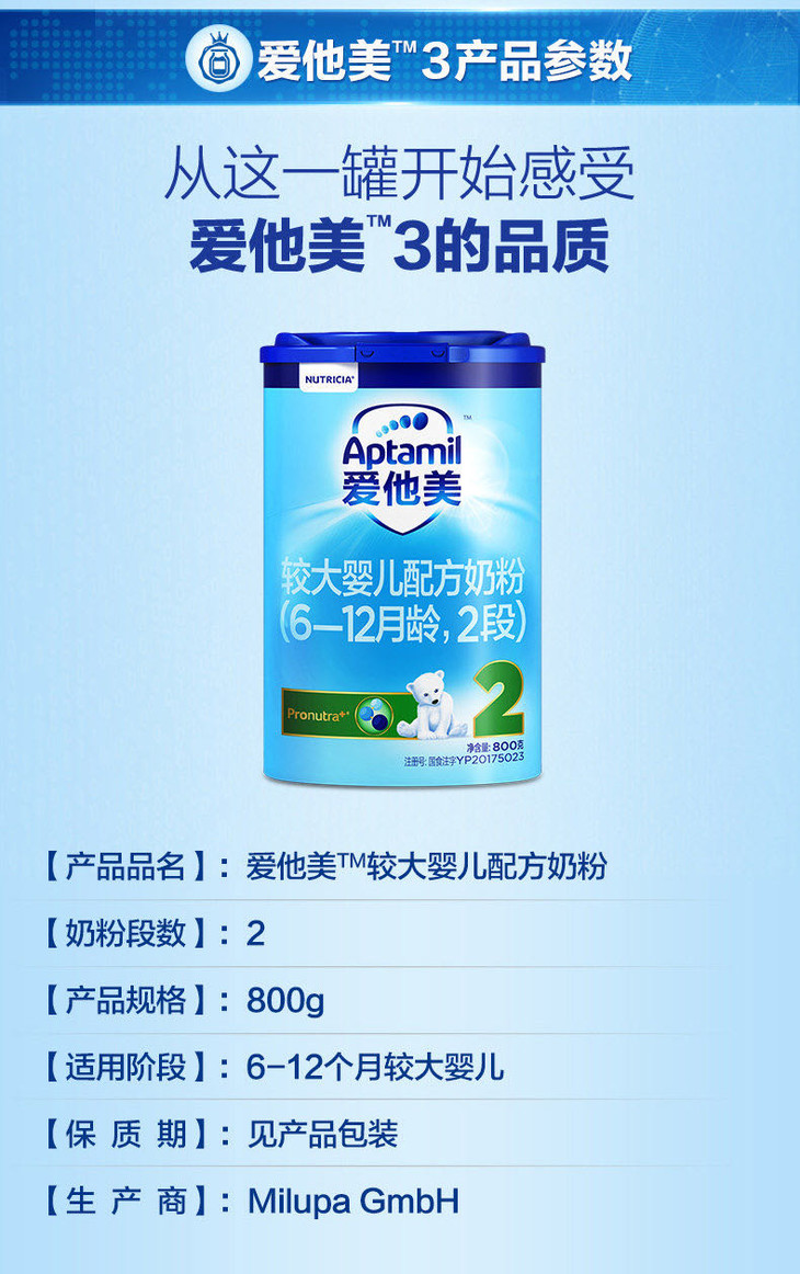 (新旧版随机)爱他美较大婴儿配方奶粉2段(6-12月)800g