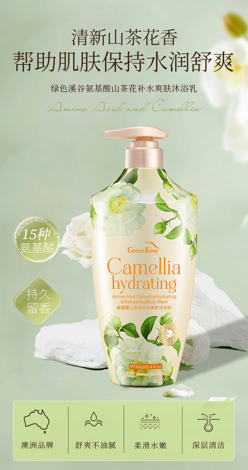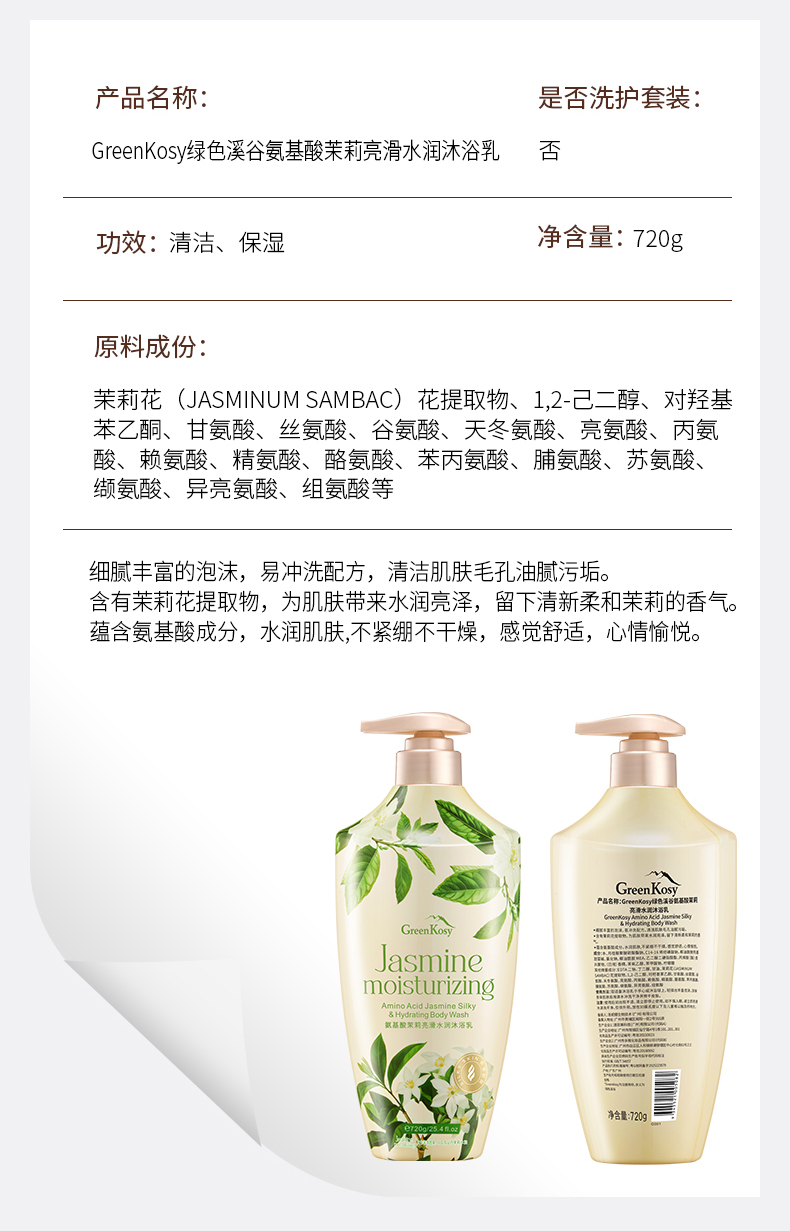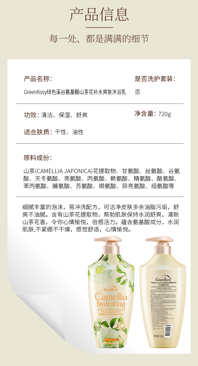 【品名】绿色溪谷氨基酸山茶花补水爽肤沐浴乳/氨基酸茉莉亮滑水润沐浴乳 【规格】720g/瓶 【发货时效】48-72小时,周末节假日顺延 |