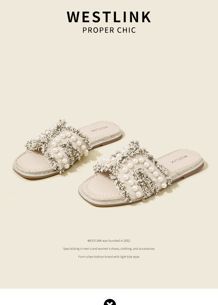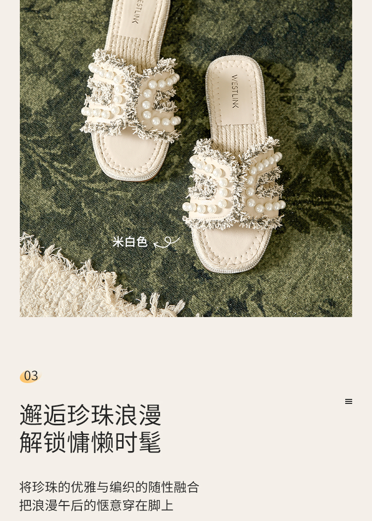 西遇法式凉拖鞋女外穿夏季新款珍珠小香风草编平底凉鞋一字拖D1056734