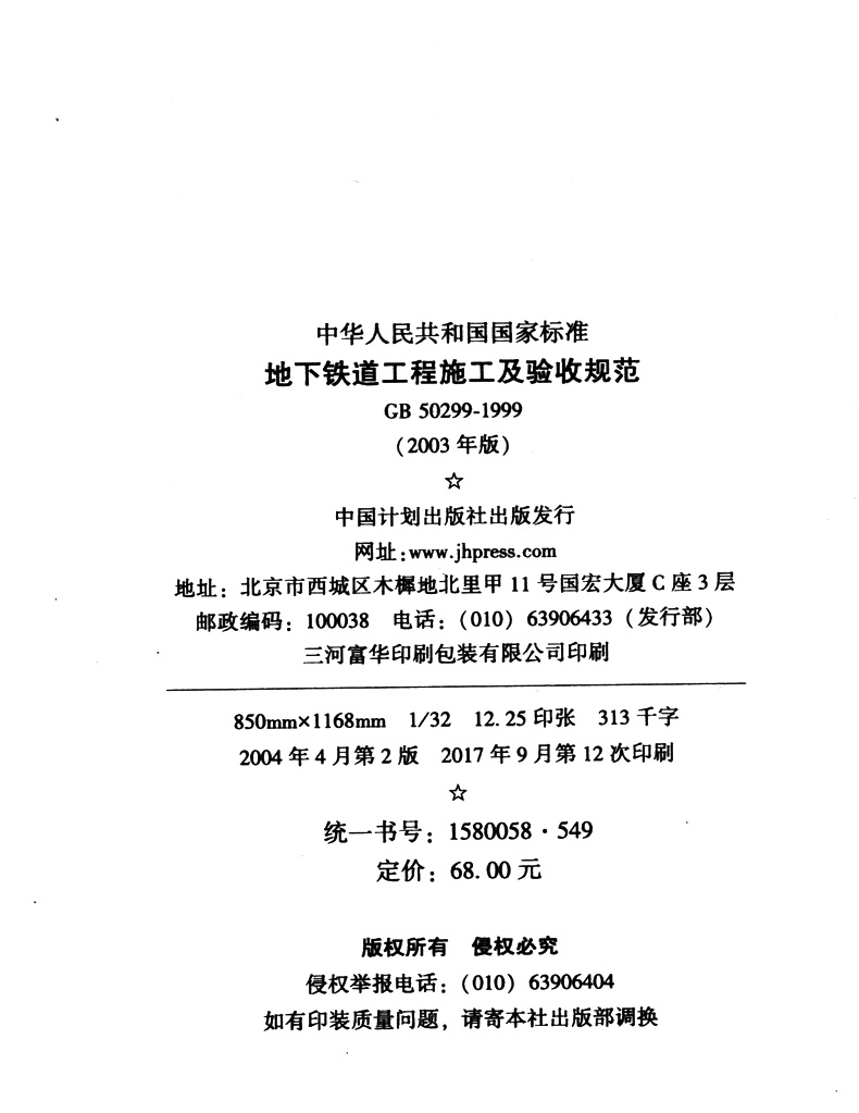 书名:(有新版)GB50299-1999 地下铁道工程施工及验收规范(2003年版)