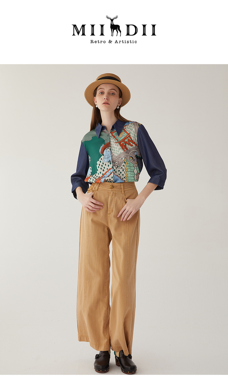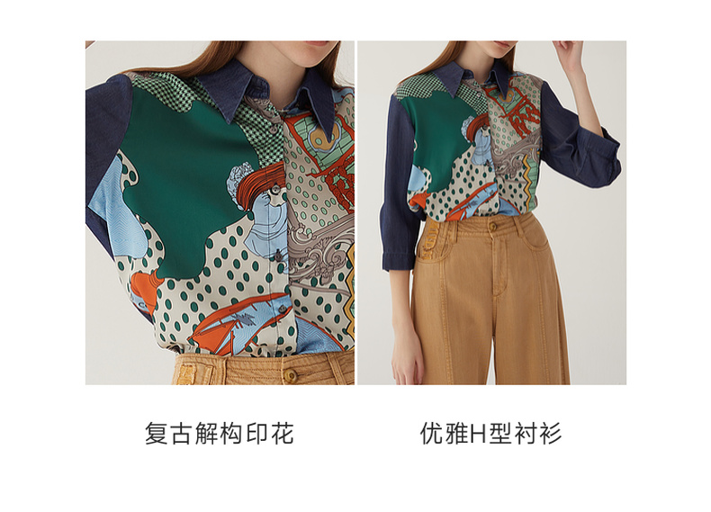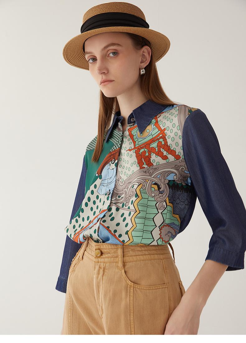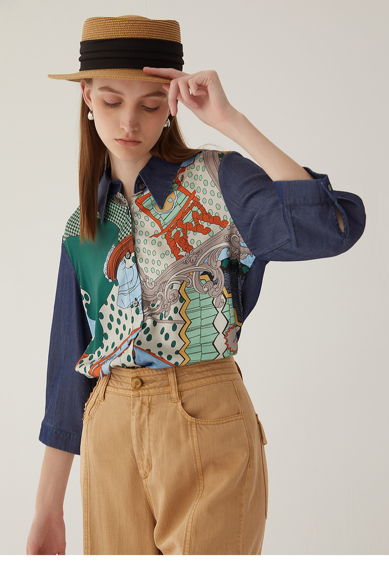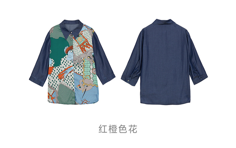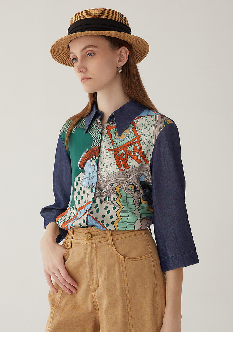 谜底牛仔拼接衬衫分袖女2024夏季新款复古印花亲肤衬衣246MC7072