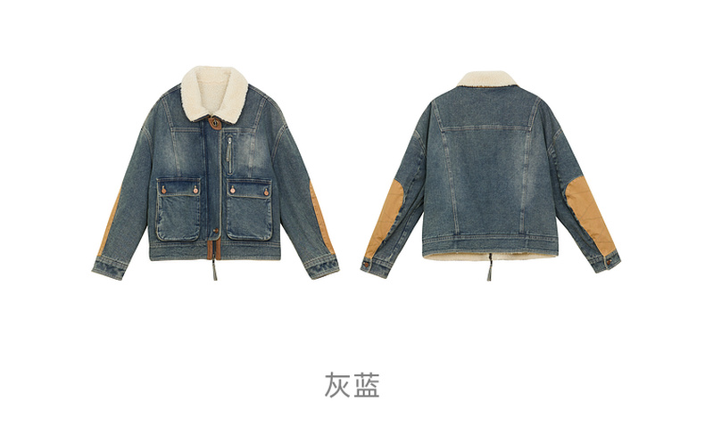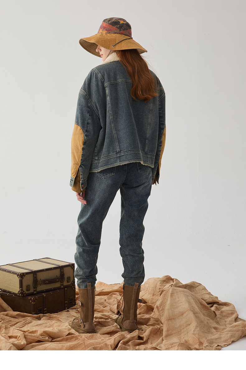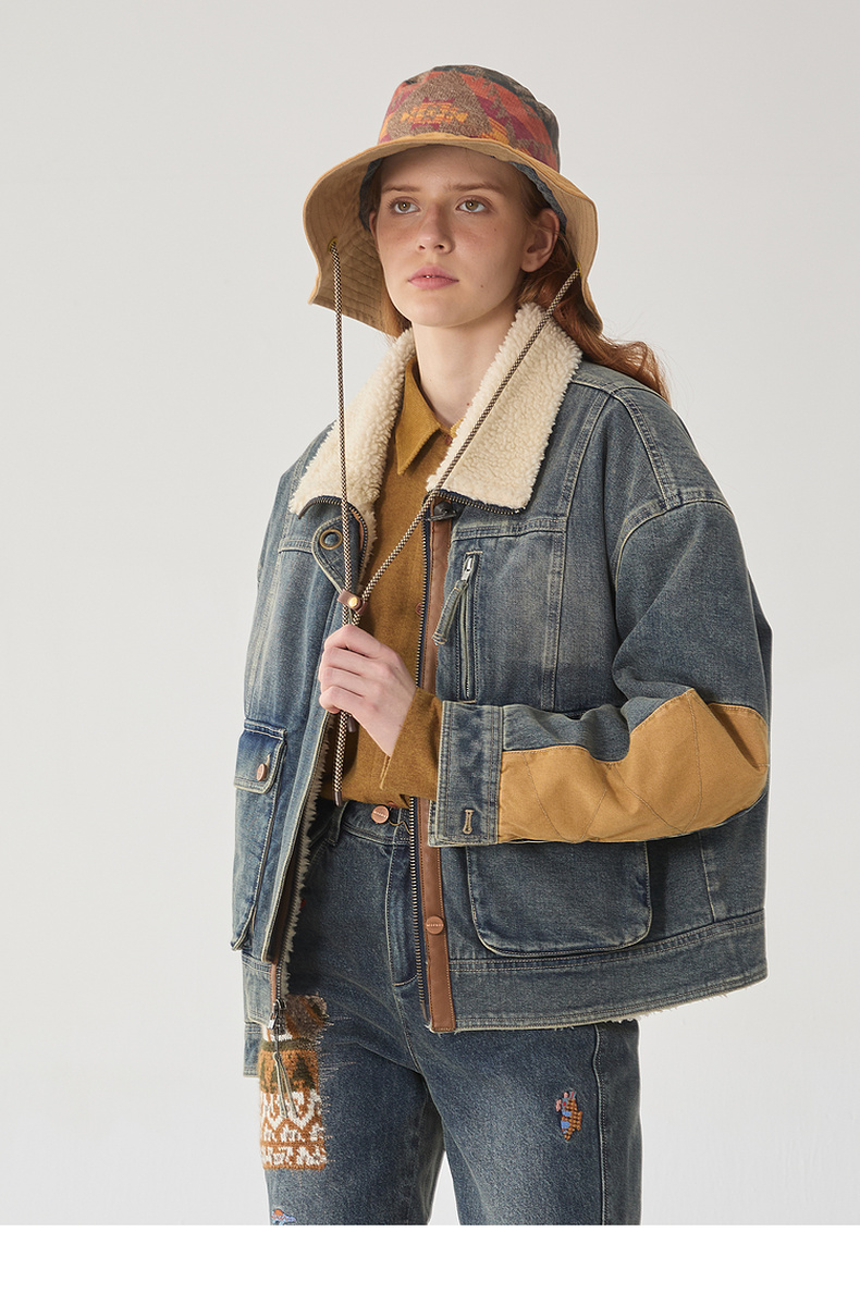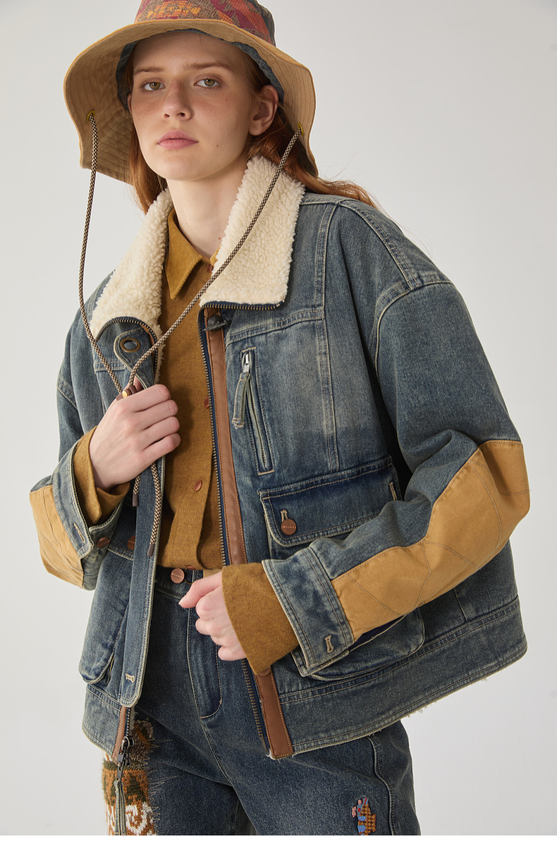谜底加厚牛仔外套女2024冬款复古机车风毛毛拼接夹克244MW1682