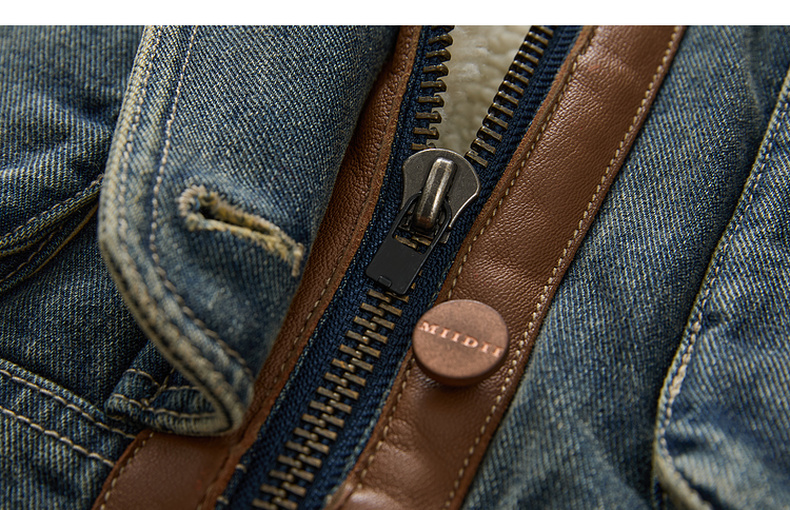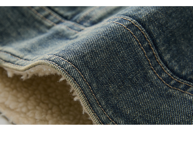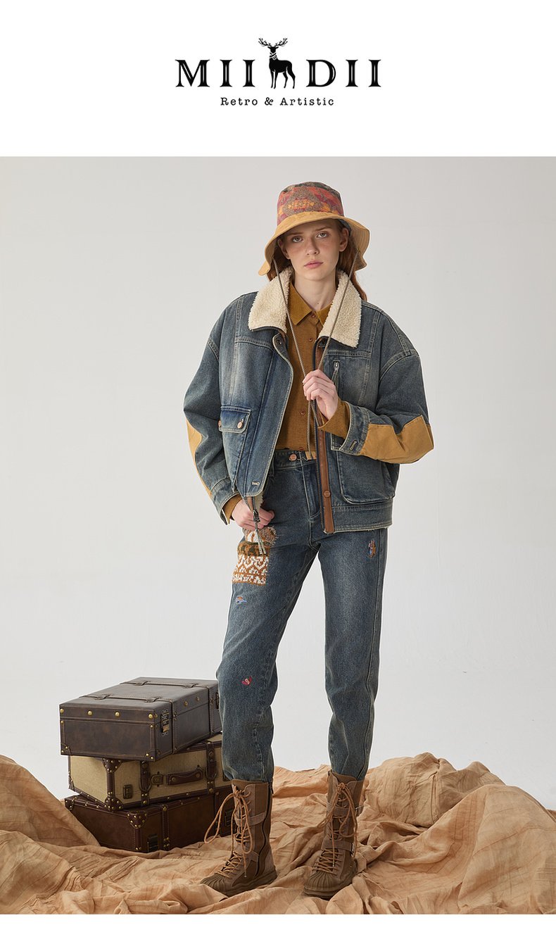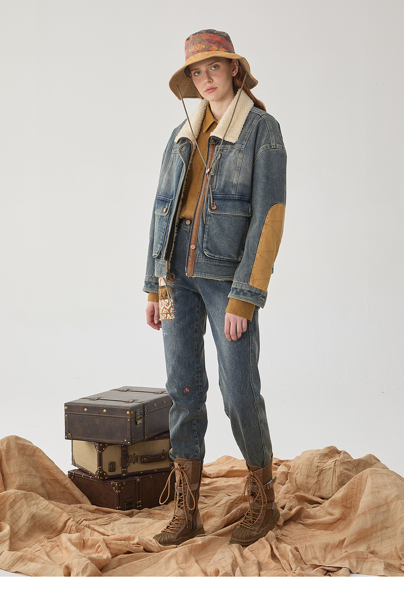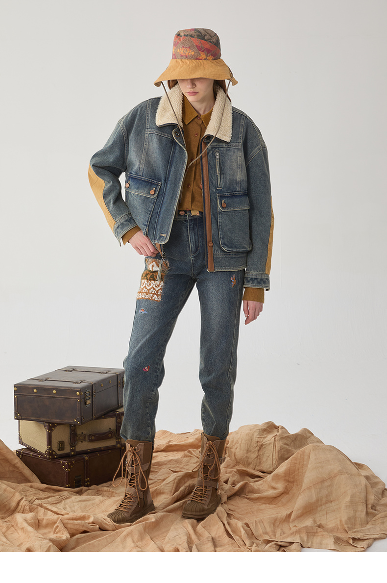谜底加厚牛仔外套女2024冬款复古机车风毛毛拼接夹克244MW1682