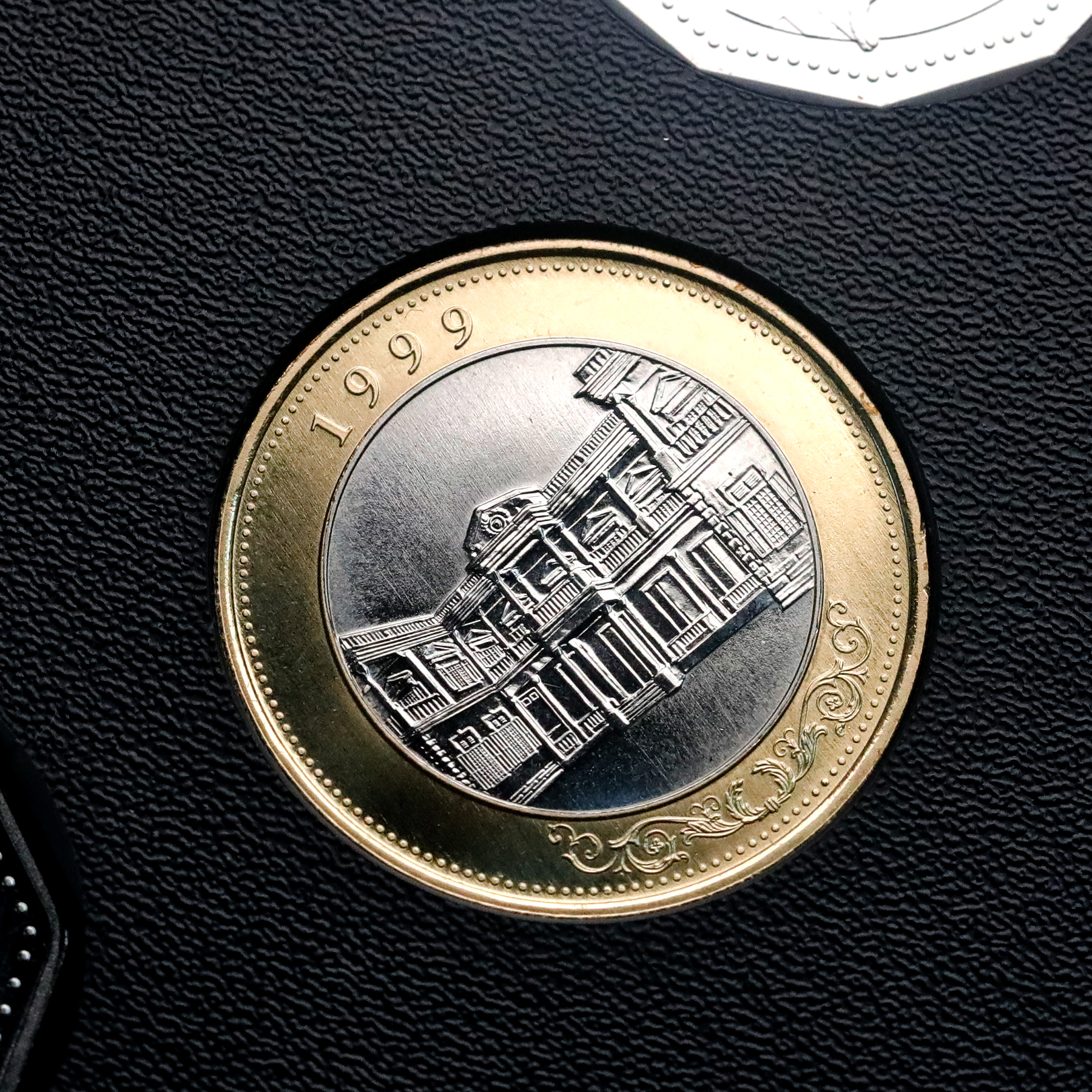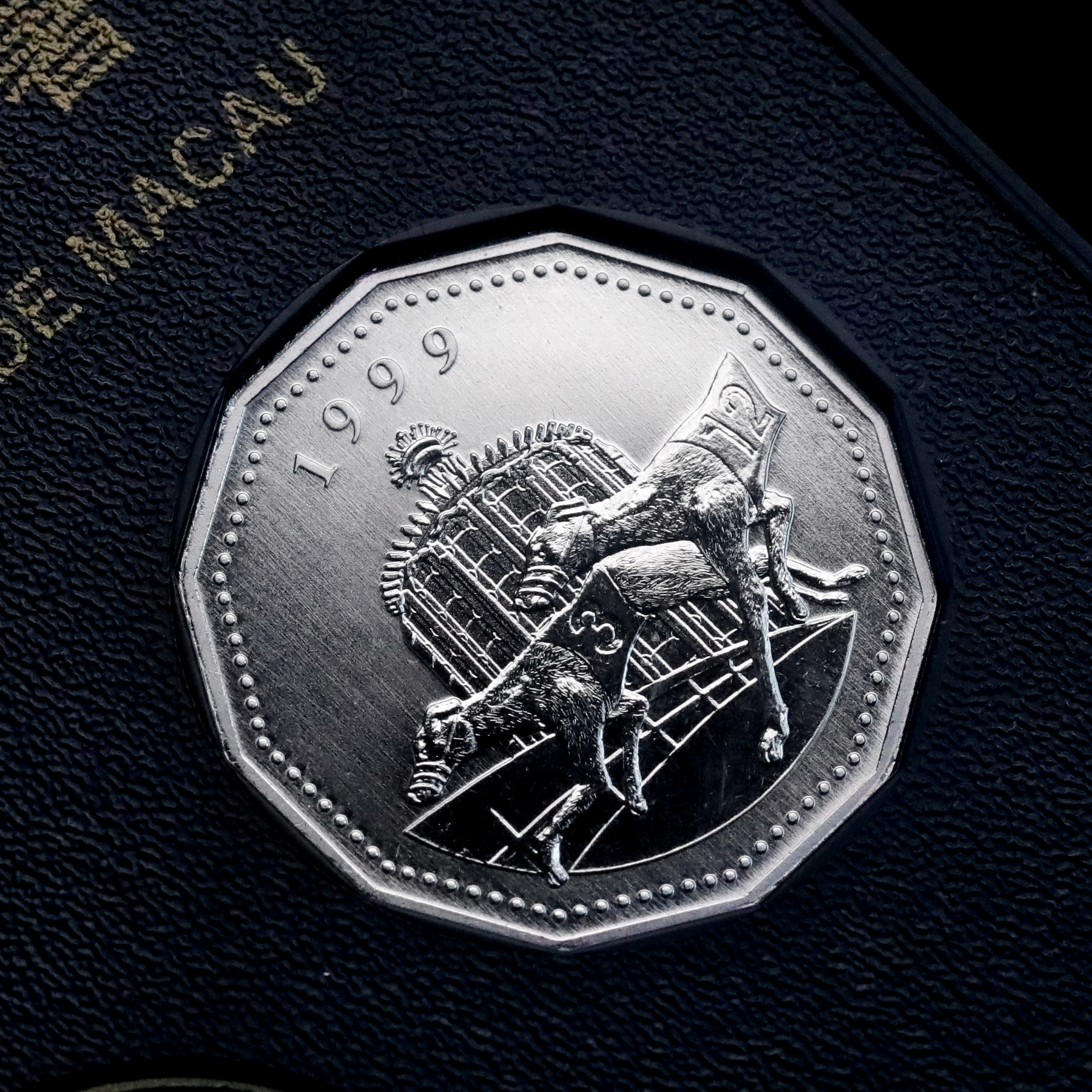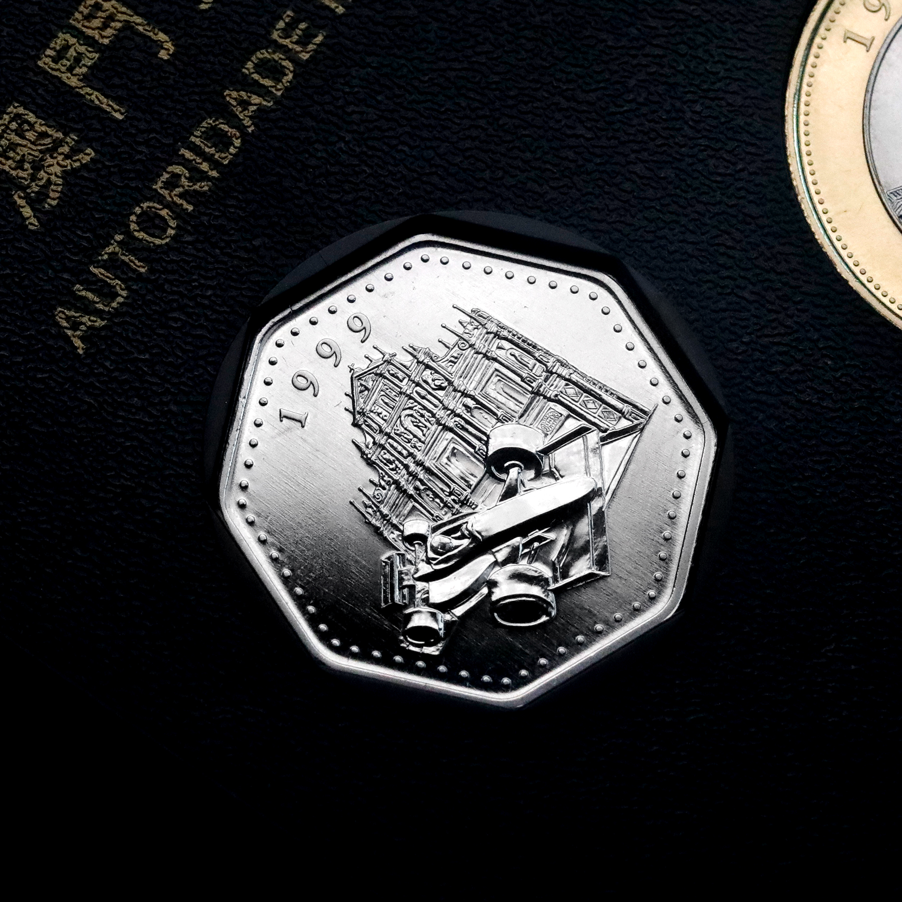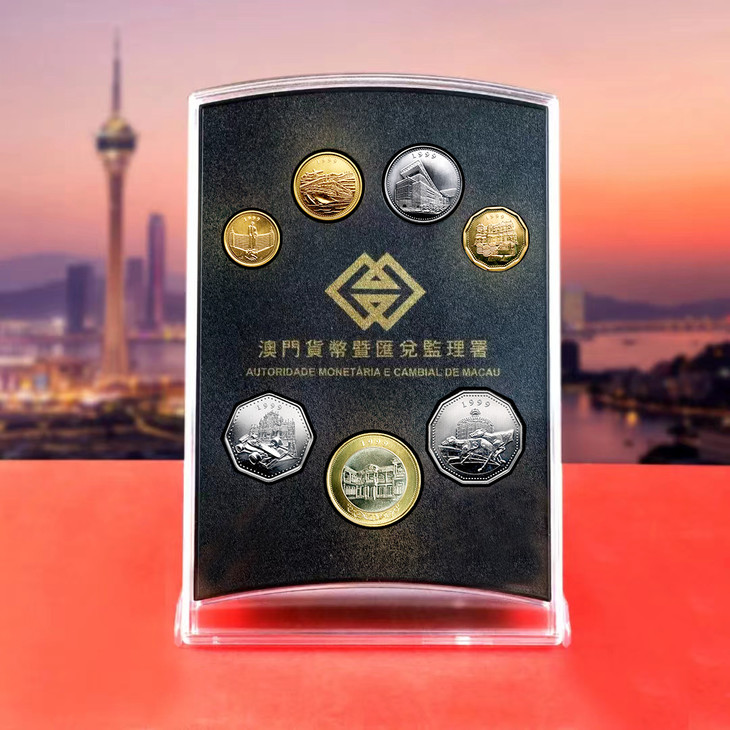 为了纪念1999年澳门回归祖国,同年,澳门政府特别许可发行了一套澳门回归珍藏精制硬币套装,全套7枚,由加拿大皇家造币厂铸造,限量发行28万8888套。