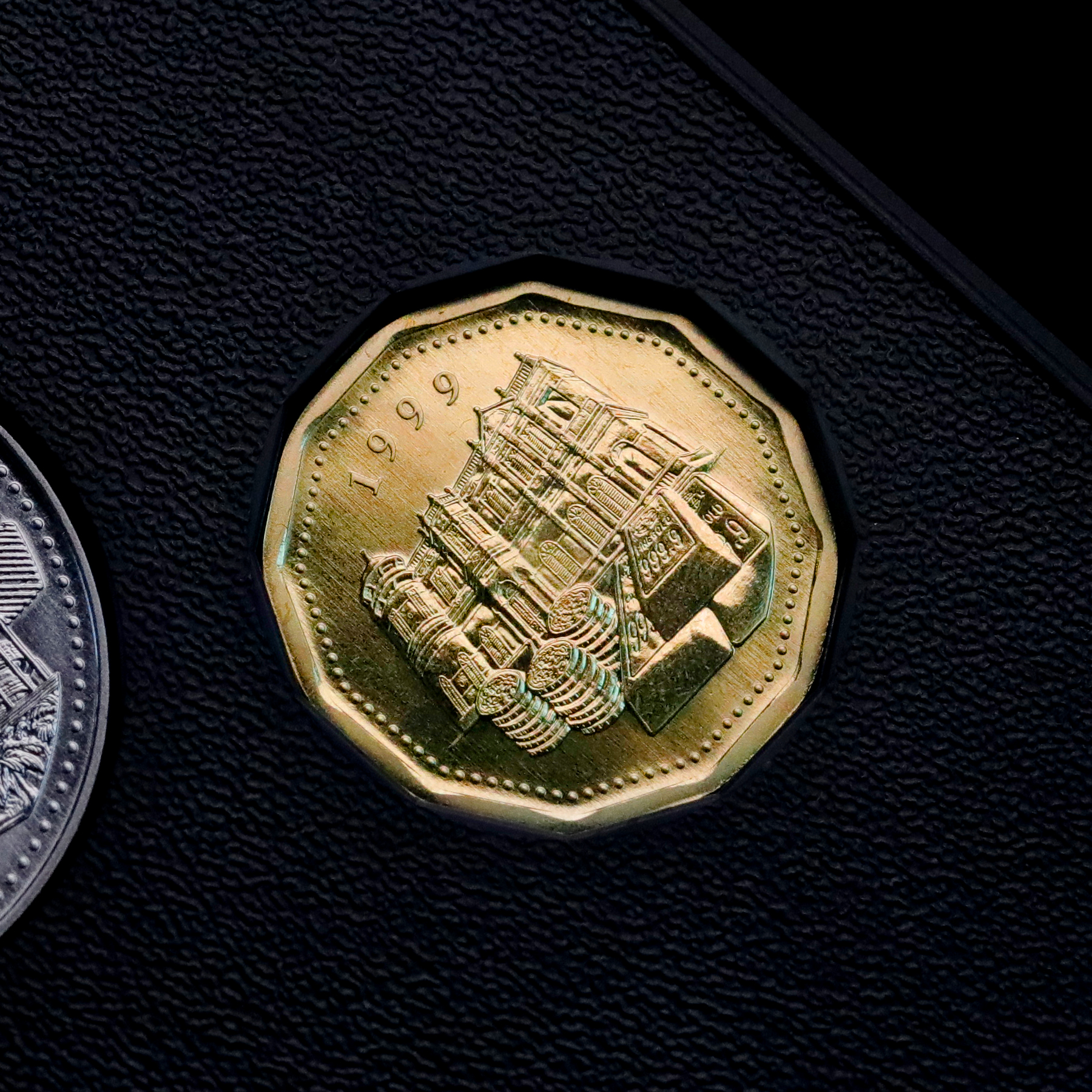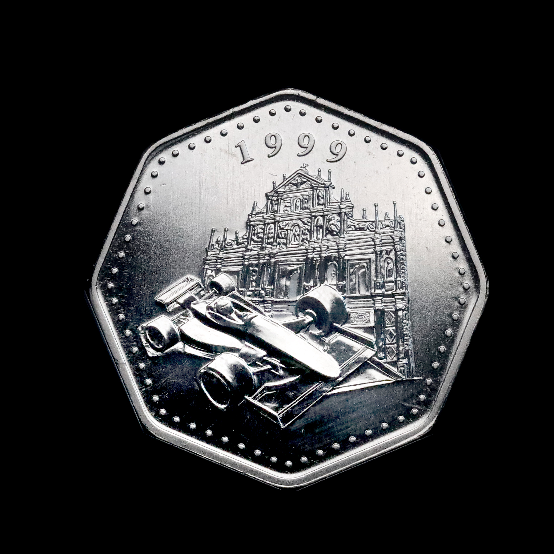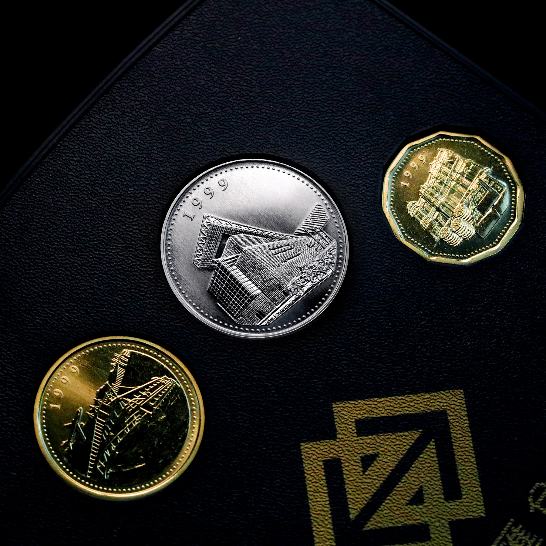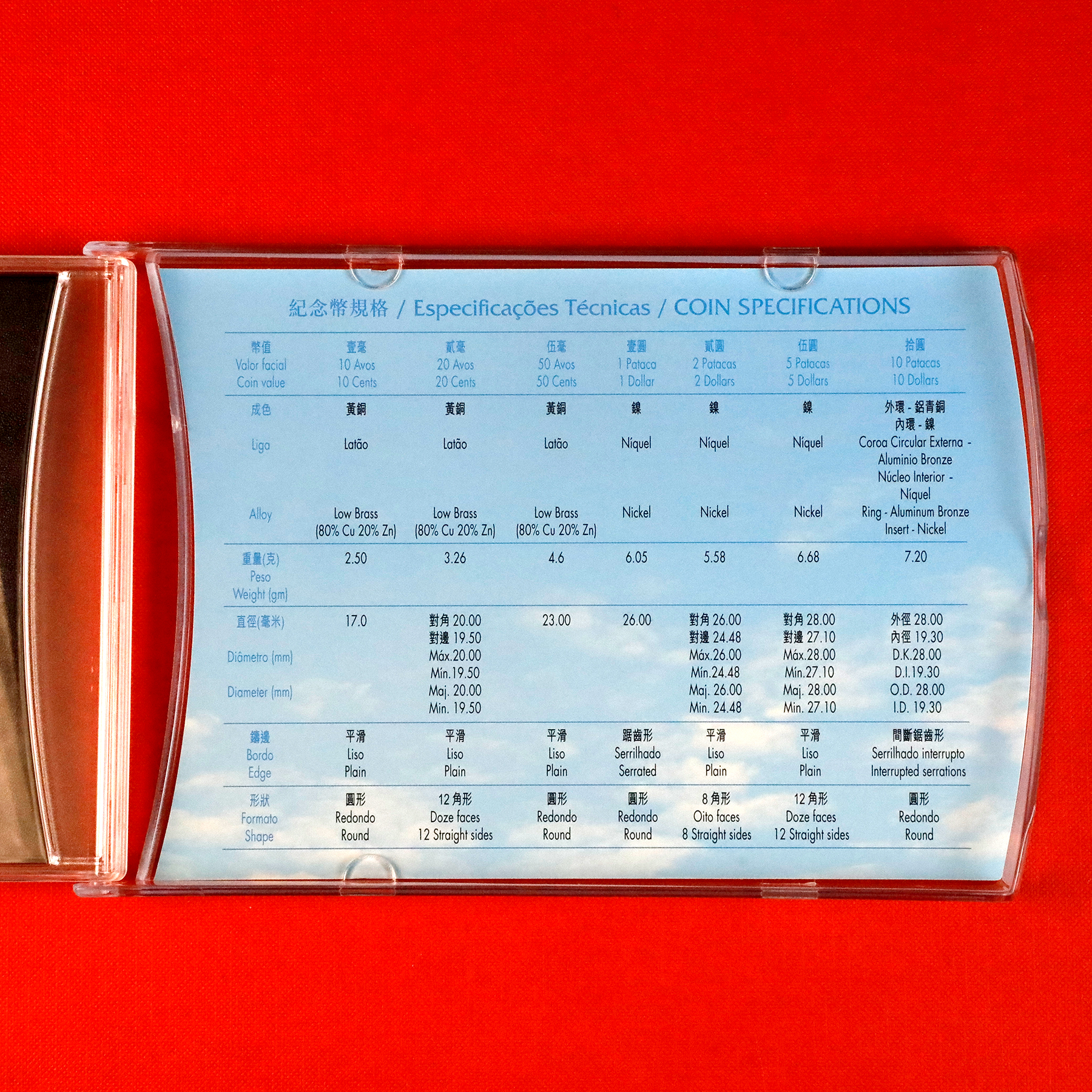 为了纪念1999年澳门回归祖国,同年,澳门政府特别许可发行了一套澳门回归珍藏精制硬币套装,全套7枚,由加拿大皇家造币厂铸造,限量发行28万8888套。