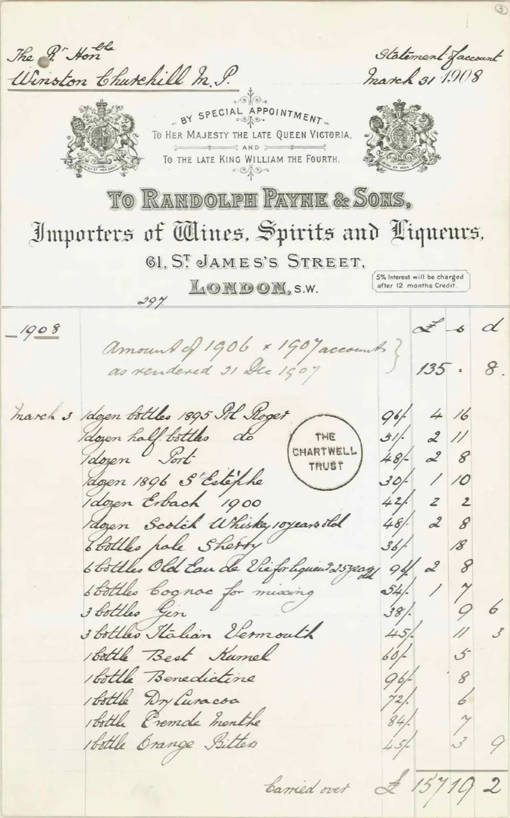 宝禄爵始创于1849年,是目前为数不多的一直为家族所有的香槟酒庄之一,如今已经传至第五代克里斯汀·比利(Christian de Billy)手中,酒庄的葡萄园大多位于 Epernay 境内及其周边。宝禄爵擅长酿造酒体丰腴、深沉、醇厚的香槟,正如让-保罗·考夫曼(Jean-Paul Kauffmann)在《香槟之旅》(Voyage en Champagne )中所写的那样,Pol Roger 是绅士们的香槟,有着伟大香槟酒所特有的活力与精致,又自带一种沉静、典雅,微微严肃却又十分有力量。和宝禄爵缘分特别深厚的名人,当属知名的英国首相丘吉尔。这位看起来有点古怪、以幽默与睿智文明,备受英国人民爱戴的二战时领袖,不爱红葡萄酒也不爱白葡萄酒,却总要在午饭和晚饭后各来一瓶375ml的香槟。据说他一生至少买了 25000 瓶香槟,气得他太太 Clementine 留下了“不准再买香槟了!”的字条。这样一位阅瓶无数的狂热的香槟爱好者,曾公开表示宝禄爵香槟酒窖的地址44 Avenue de Champagne是“世界巨好喝的地点”。在生命晚年的10年中,他足足买了 500 箱宝禄爵,足见他对这家香槟的钟情程度。丘吉尔初次在 Randolph Payne&Sons 公司购买1895宝禄爵的发票宝禄爵酒庄是香槟地区先驱进行“现代化”变革的酒庄之一。大约从上世纪30年代起就逐渐放弃使用木桶,而开始使用混凝土罐发酵,后来又使用不锈钢罐,以保证更好的控温,获得更纯净稳定的品质。与此同时,酒庄也是至今仍然坚持使用非常罕有且昂贵的人工转瓶方式来生产香槟的生产商之一。酒厂有4位经验丰富的转瓶师,专门每天两人一组认真完成15000瓶左右的转瓶工作。转瓶过程中会根据瓶中酒的状况来判断转动的角度、方向以及如何进行晃动操作,是一项技术含量很高的手艺活。这体现了宝禄爵对传统理念的尊重,也恰恰是宝禄爵香槟保持高品质的关键。酒庄庄主直到今天,还会亲自参与到手工贴酒标这种看起来不太像老板会亲自参与的工作中来,十足的老牌范儿。Pol Roger的第15代掌门人Hubert de Billy先生在1975年丘吉尔逝世的十周年之际,酒庄为了纪念这位老友,特别推出了以他名字命名的酒款——丘吉尔爵士特酿年份香槟(Cuvée Sir Winston Churchill)。并于1984年,陈年近10年后上市。这是酒庄目前的旗舰酒款,使用特选葡萄园中精挑细选的黑皮诺和霞多丽制成,仅在特别出色的年份才会制作,还原丘吉尔在世时挚爱的风格——强健,饱满,成熟,充满魅力。