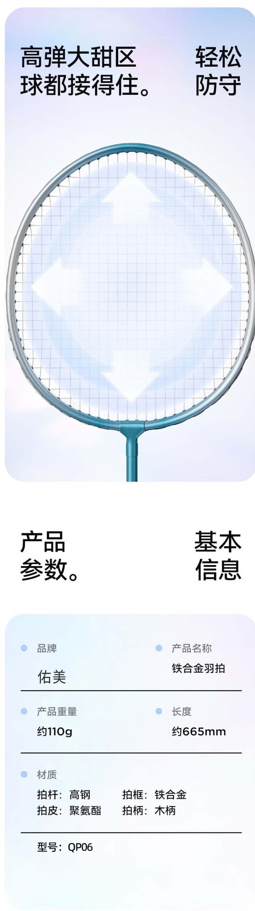 佑美 羽毛球拍蓝色QP06 流体型破风框快速回弹不易变形弹性中杆 100118084017