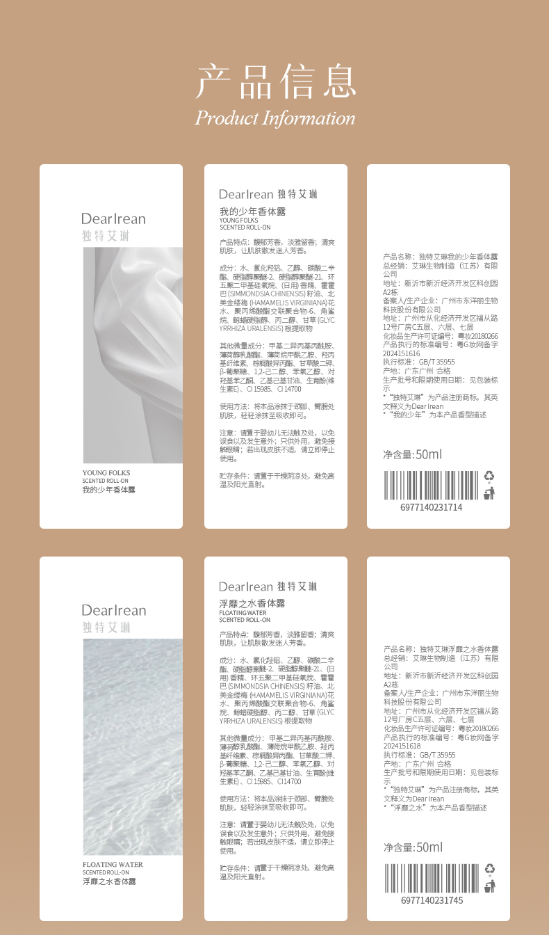 - DearIrean 独特艾琳,高定香氛生活品牌,拥有体•研究所,品牌致力于将高定香氛带入生活,同时倡导“以香之名,带给生活美好方式”的品牌理念,传递精致女性的爱、独立、自信。