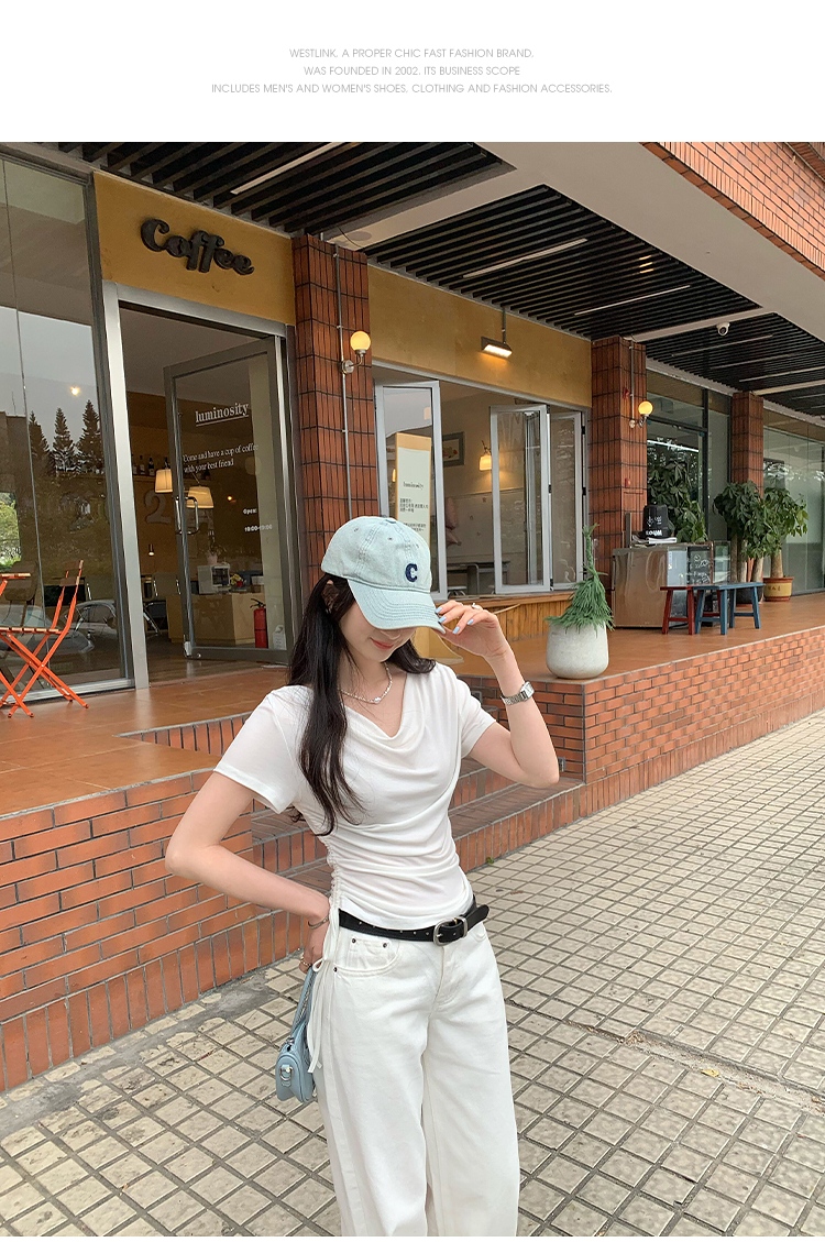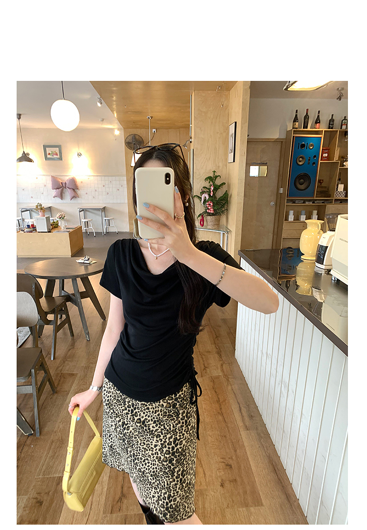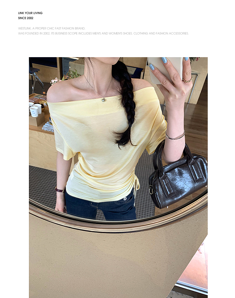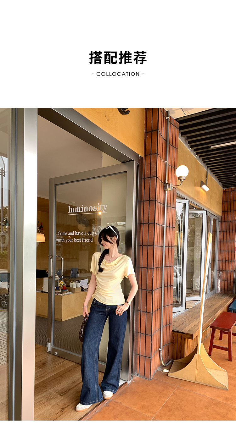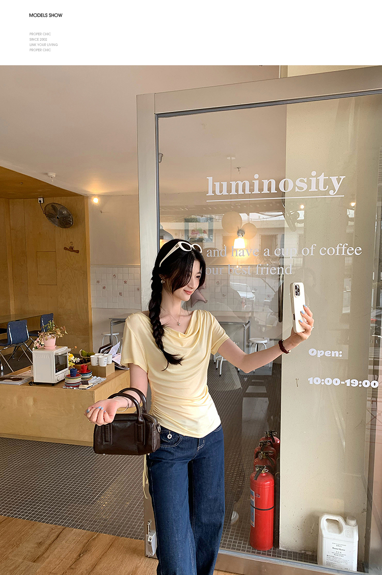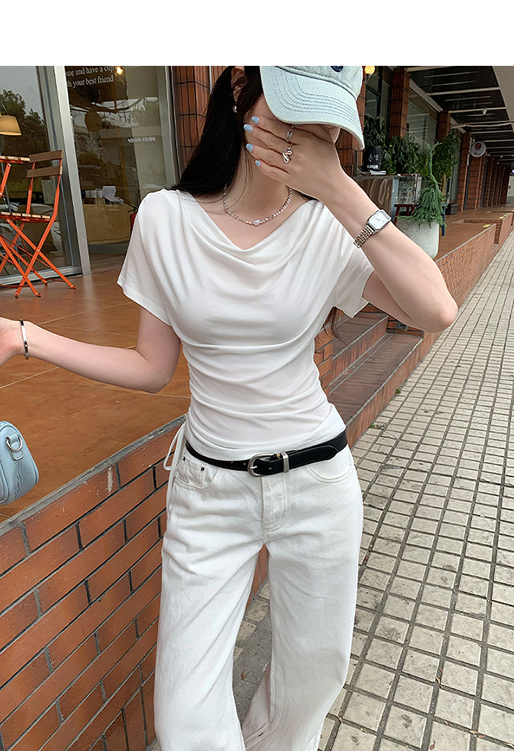西遇法式荡领短袖T恤女2026年夏季新款莱赛尔天丝纯欲褶皱上衣SS060236