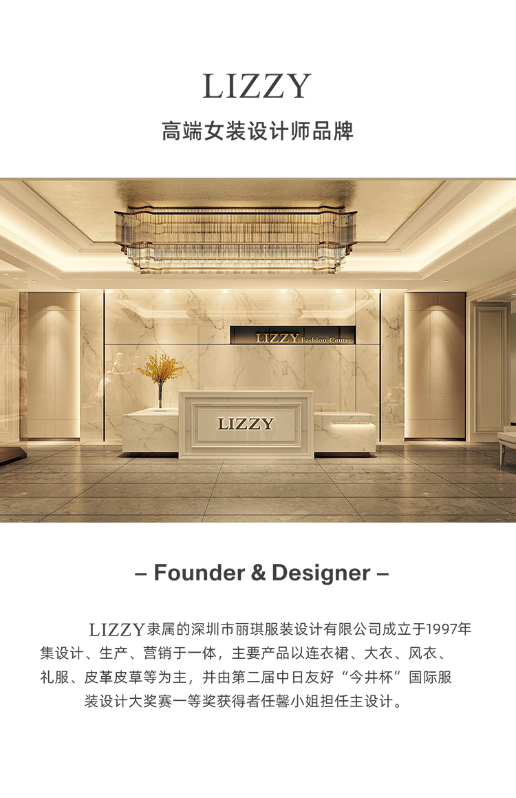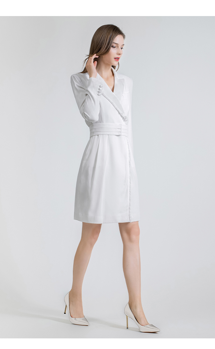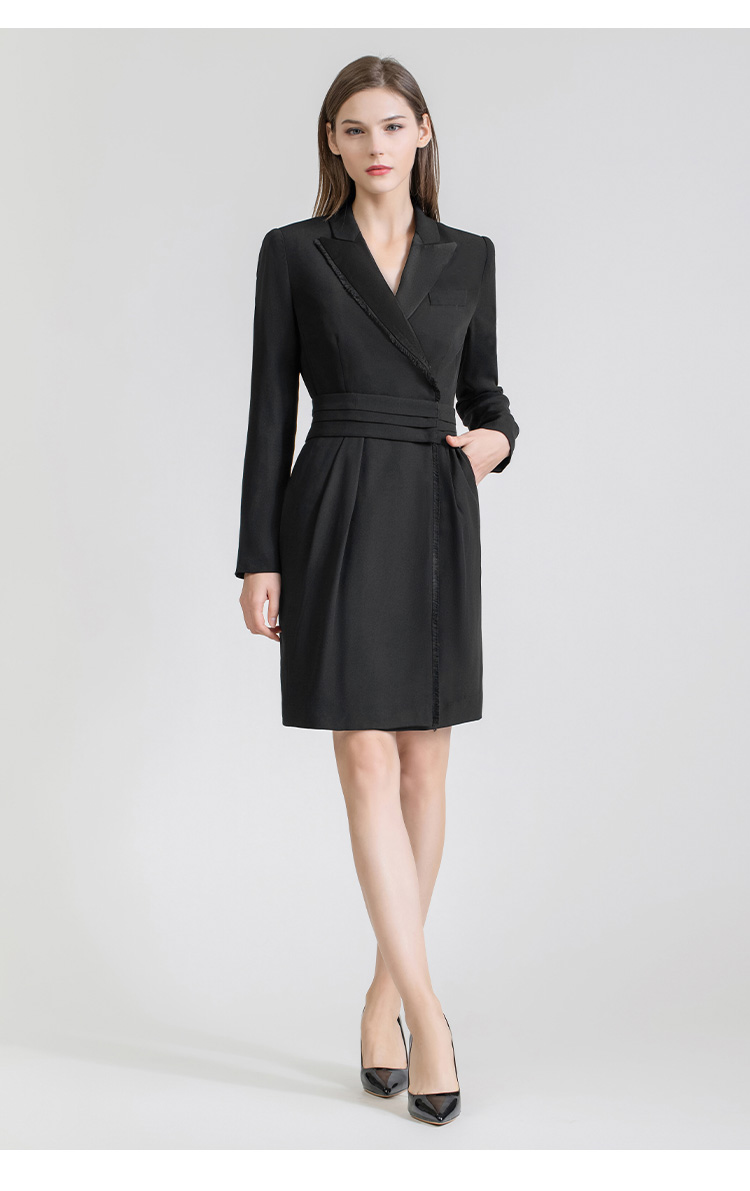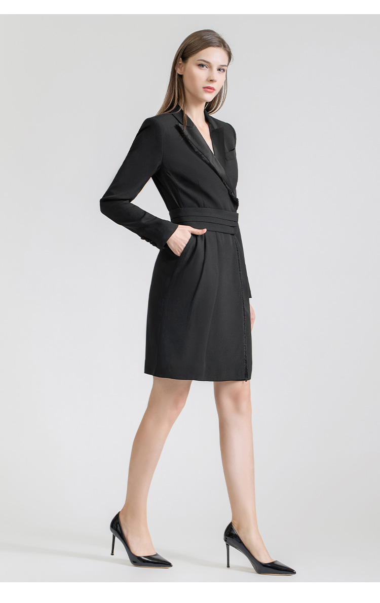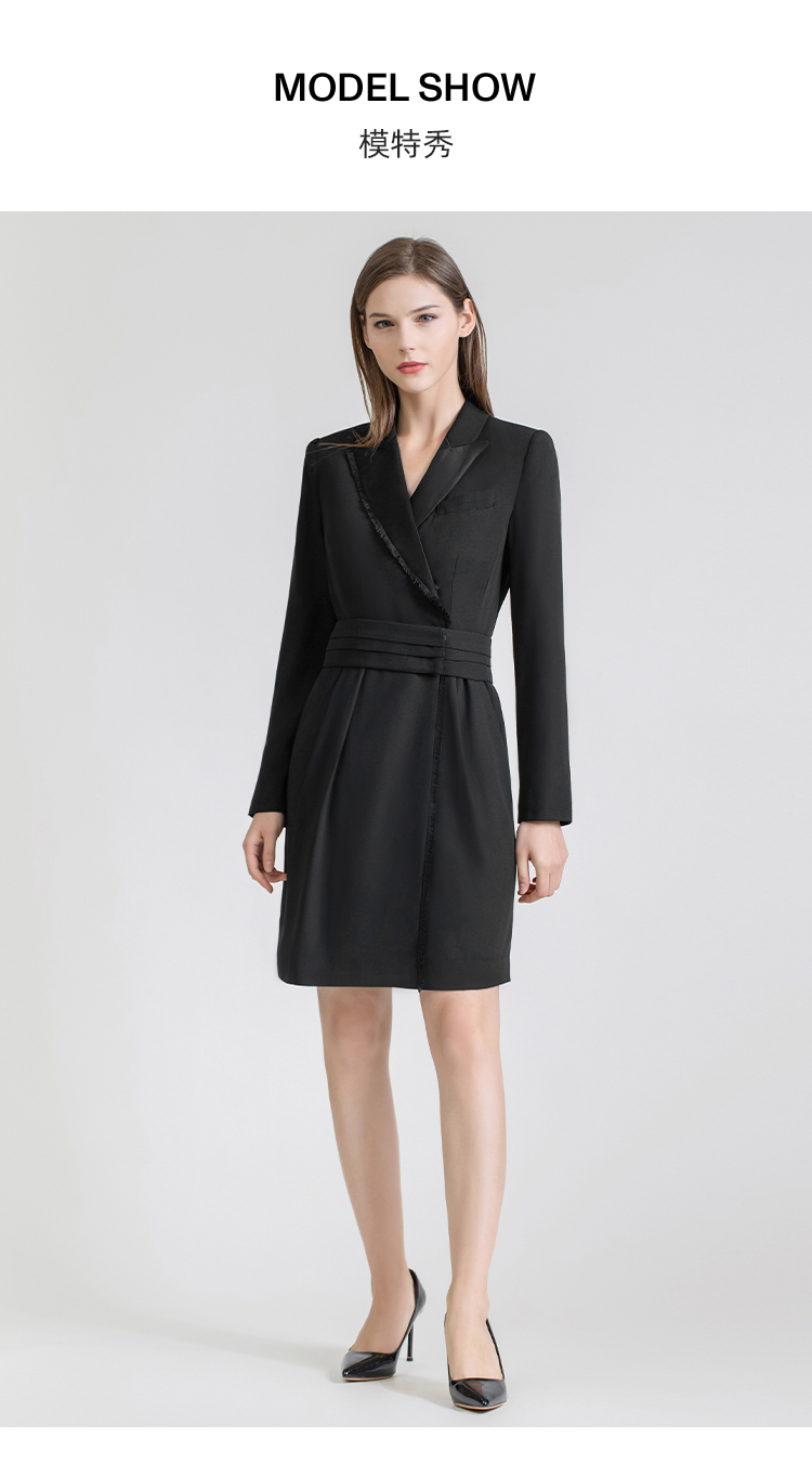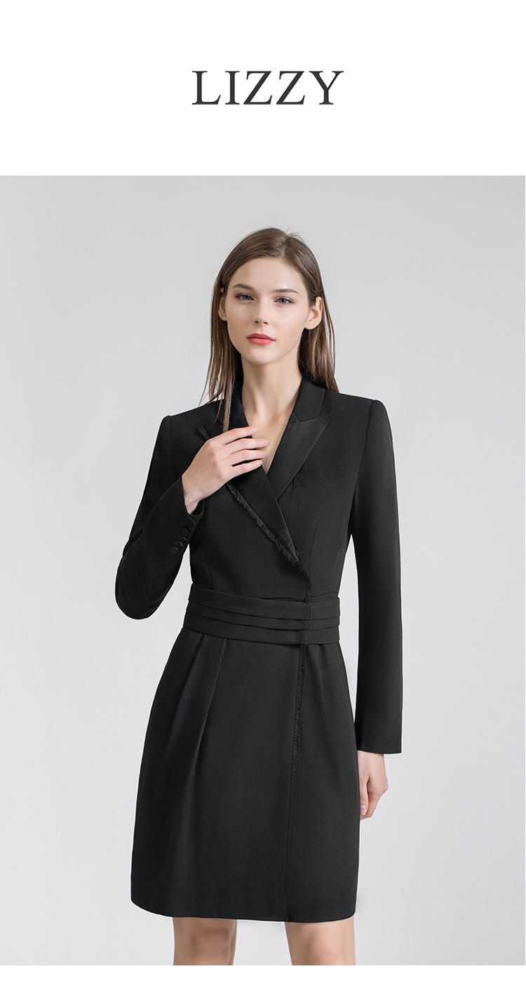 LIZZY 气质知性OL范缎面西装领不对称手工流苏边连衣裙(配腰带)7413