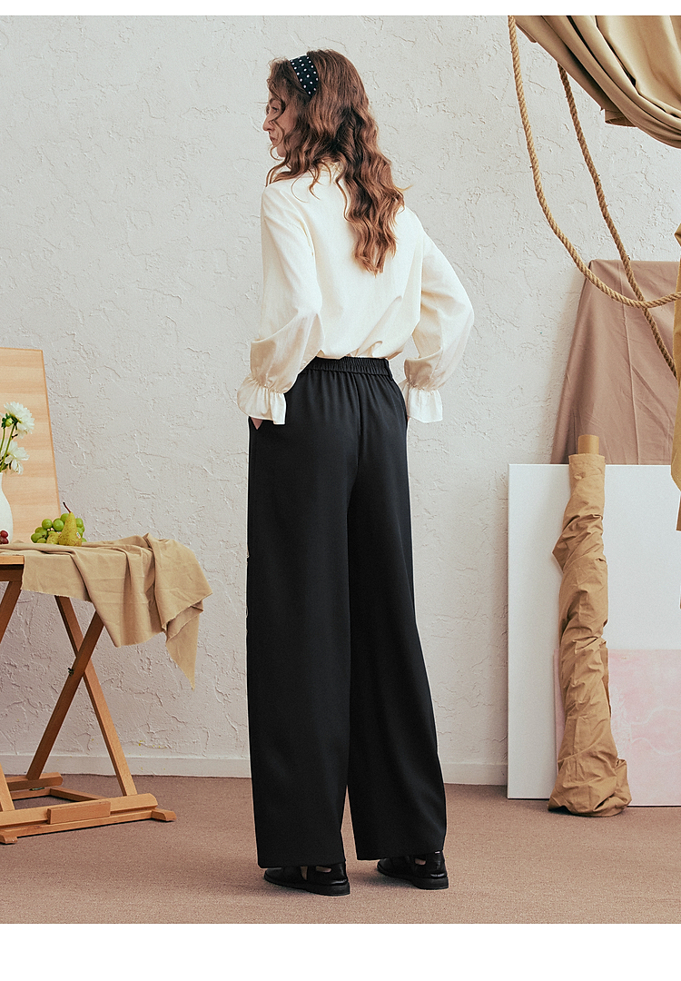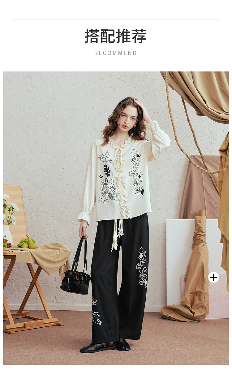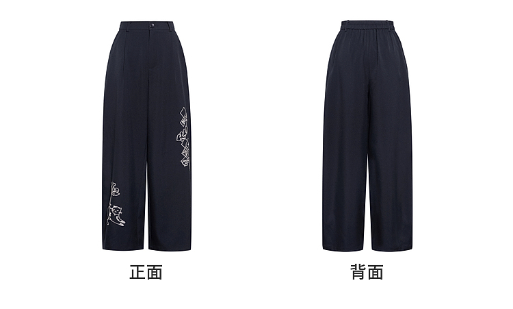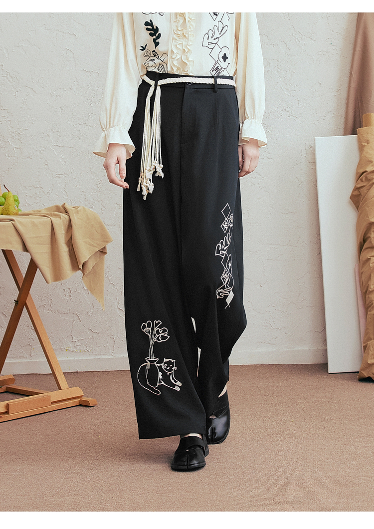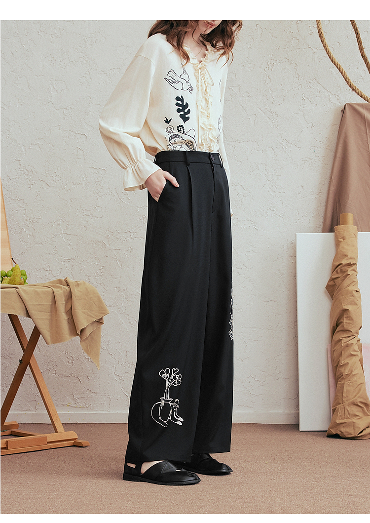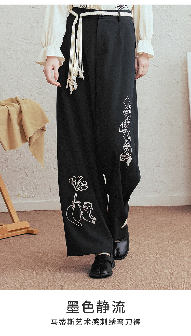两三事 墨色静流 2026春季新款复古刺绣阔腿裤女宽松休闲裤