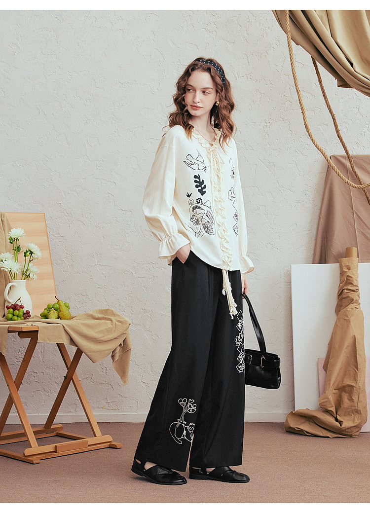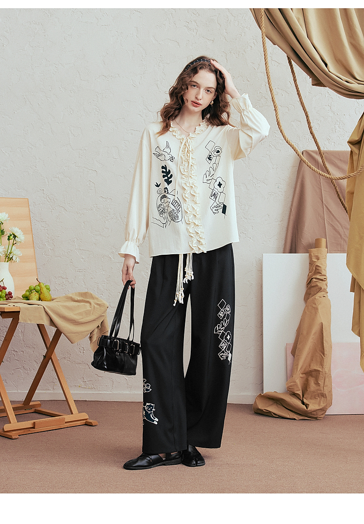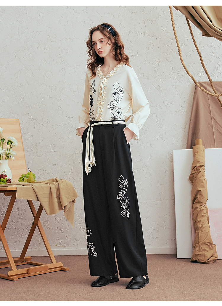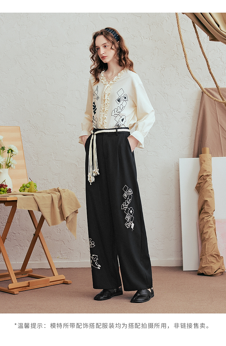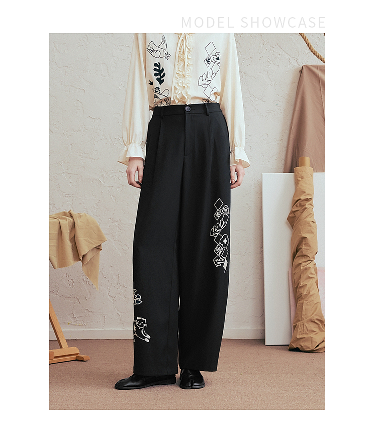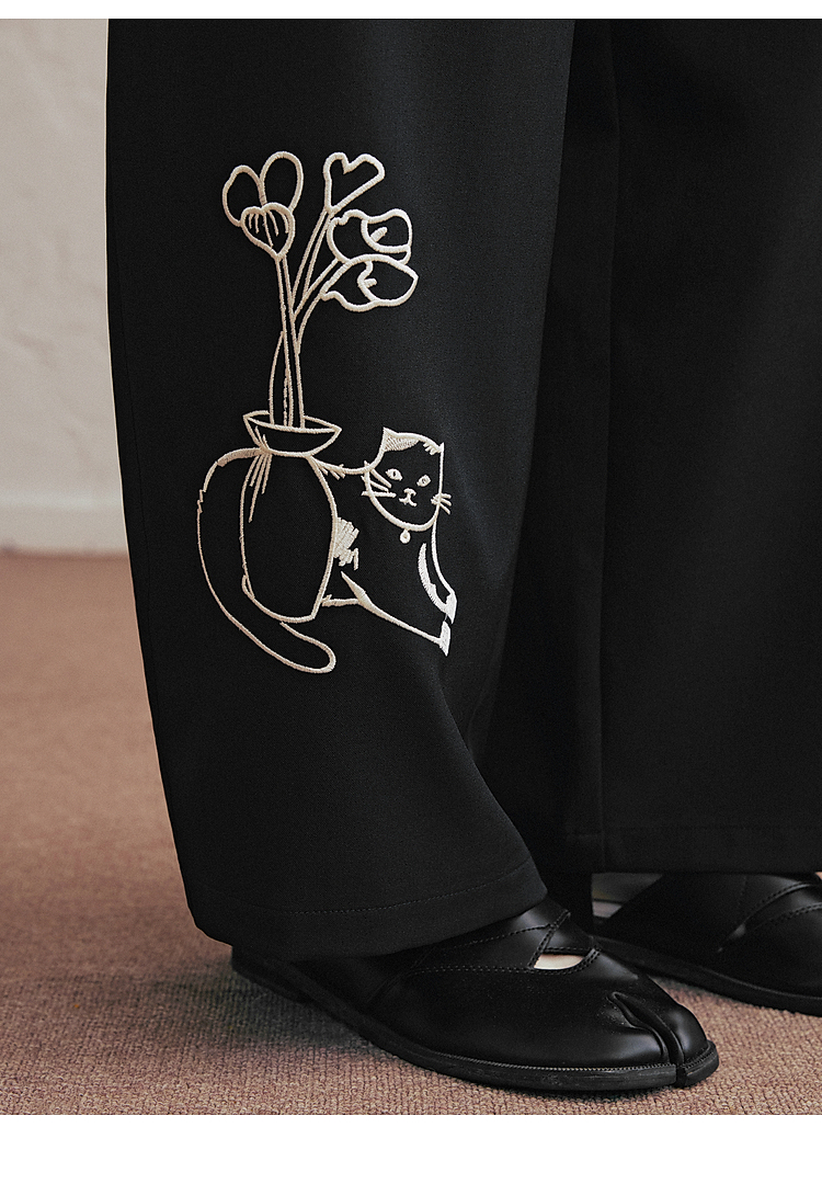 两三事 低空飞行 2025夏季新款复古印花刺绣直筒休闲裤女宽松