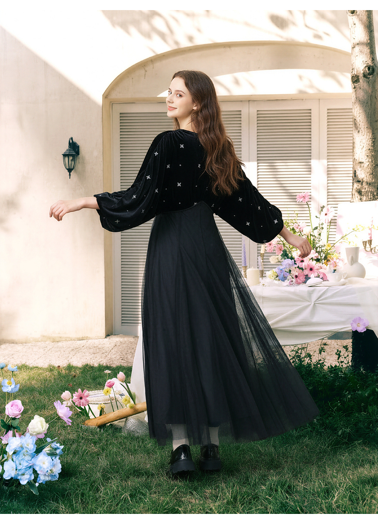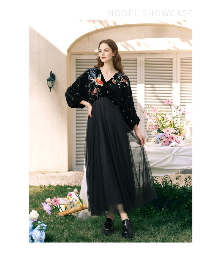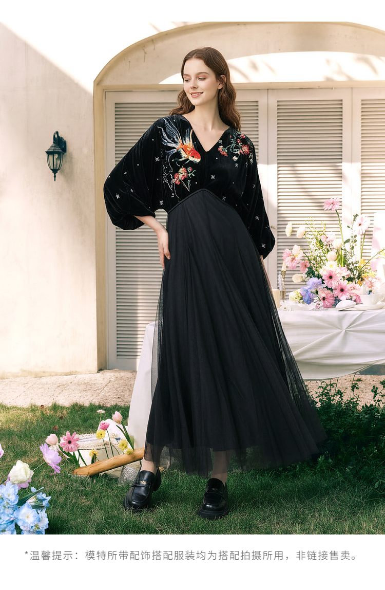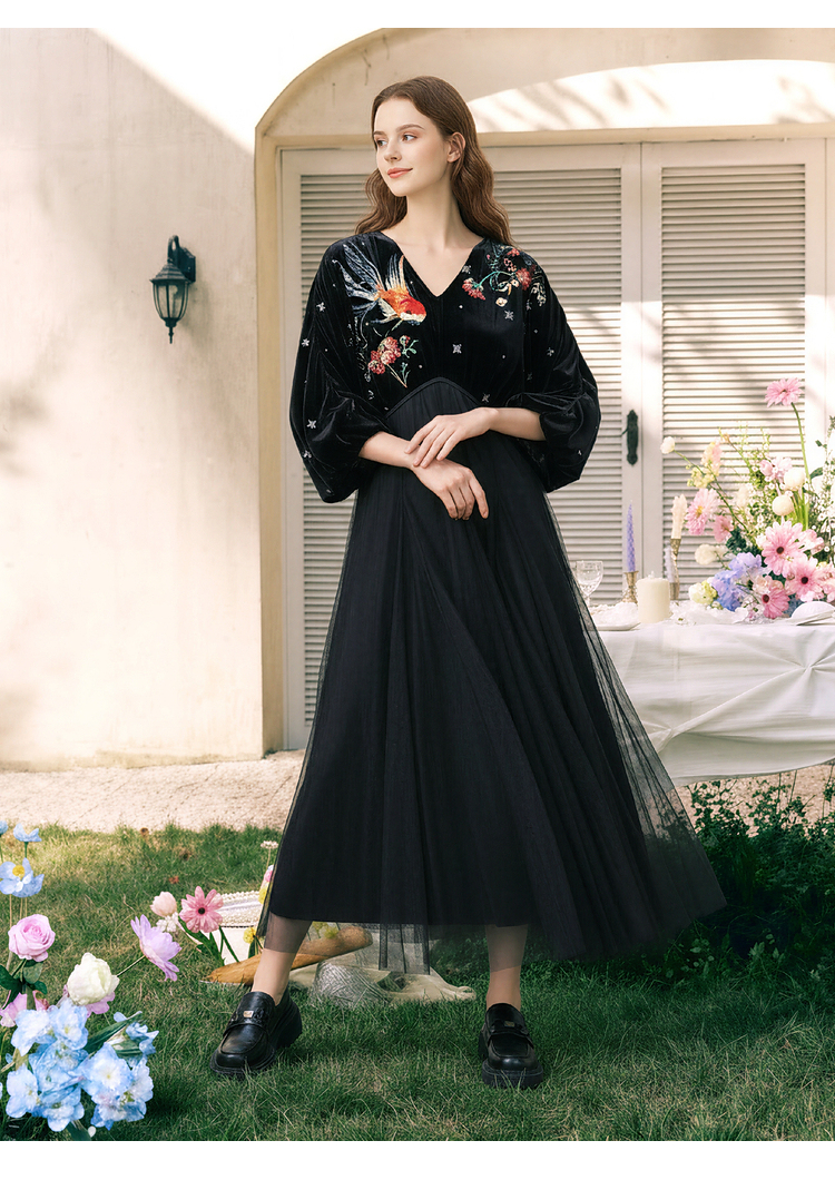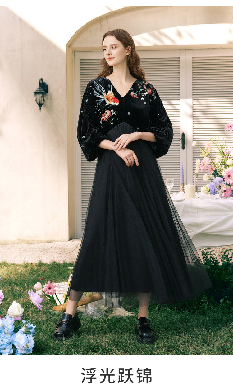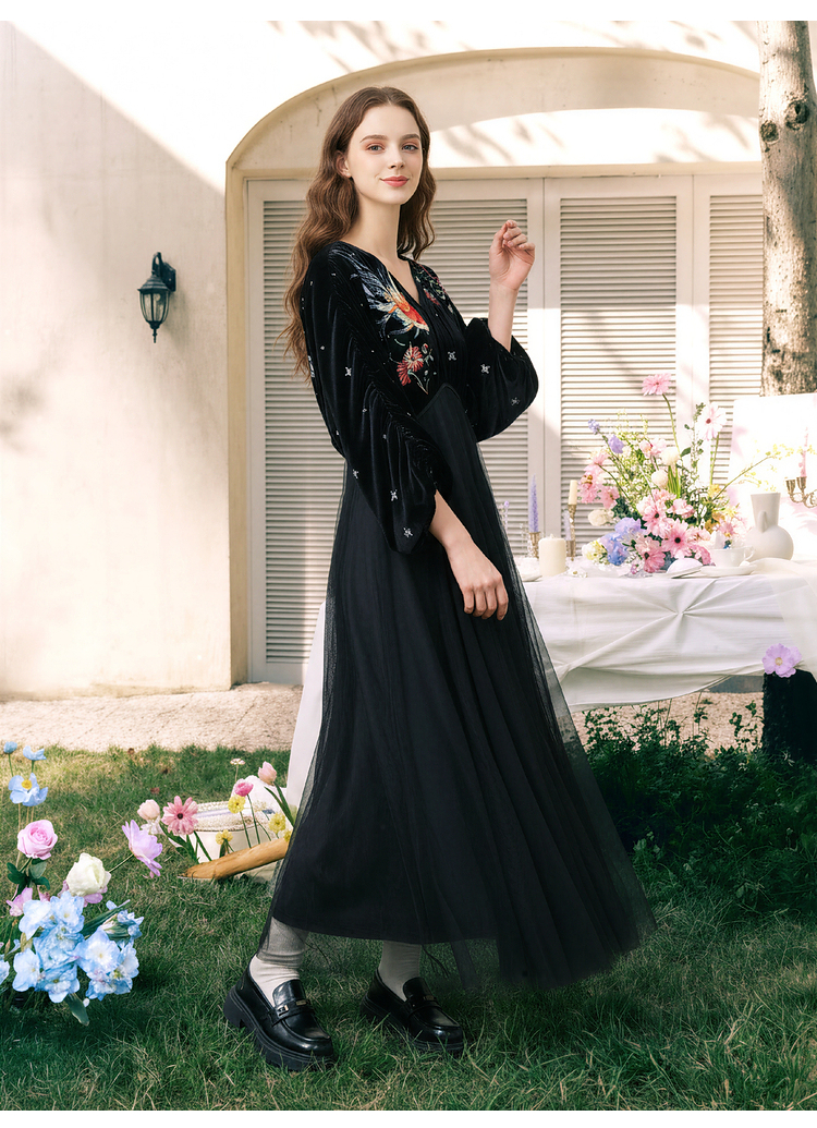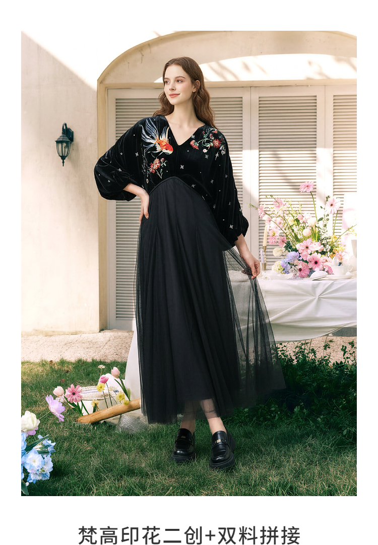 两三事梵高文艺 碧空云绒 2026春季新款复古印花贴布绣v领连衣裙