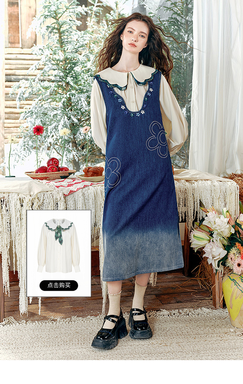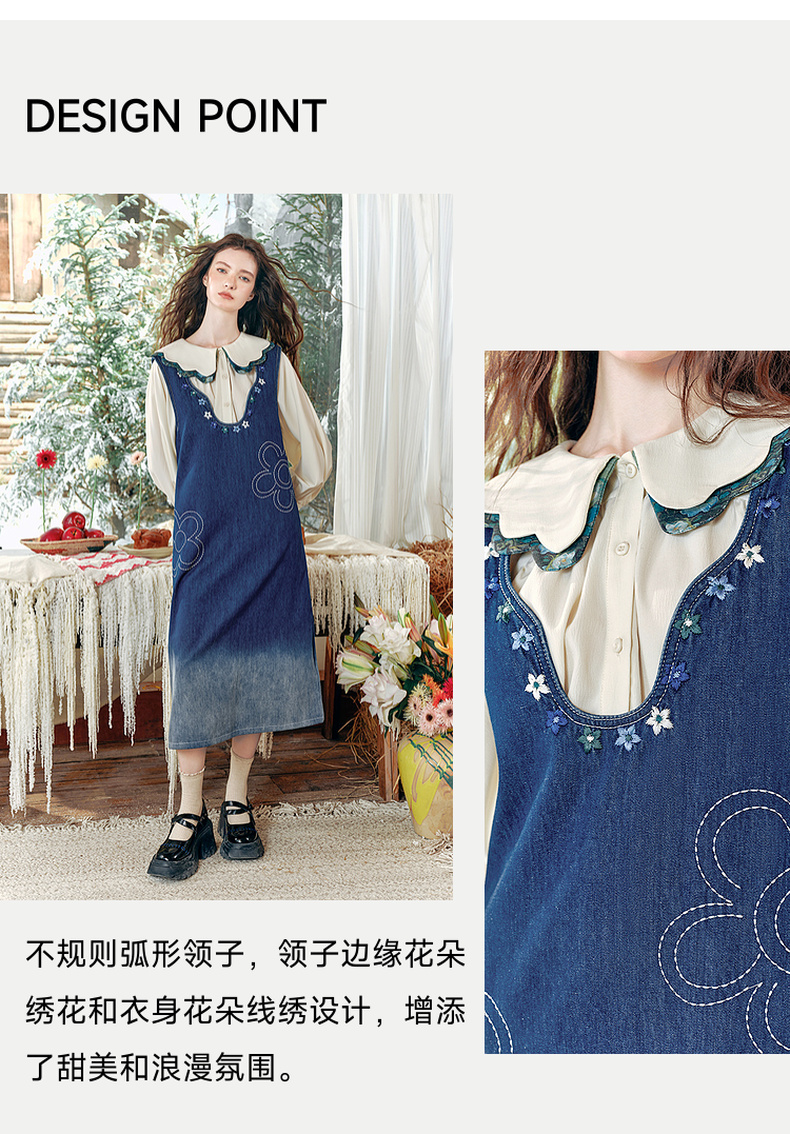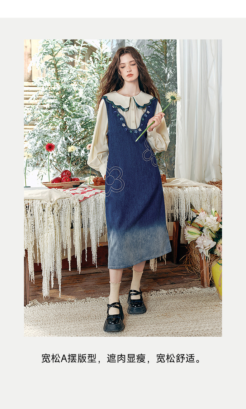 两三事浮光破晓2024冬季新款复古绣花渐变色加绒牛仔背带裙连衣裙