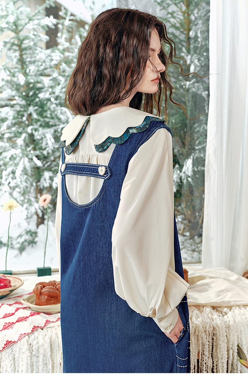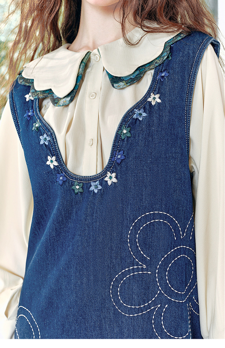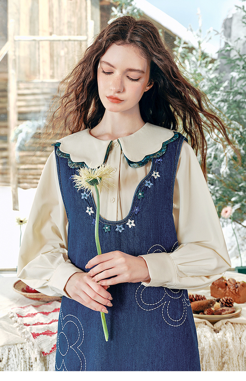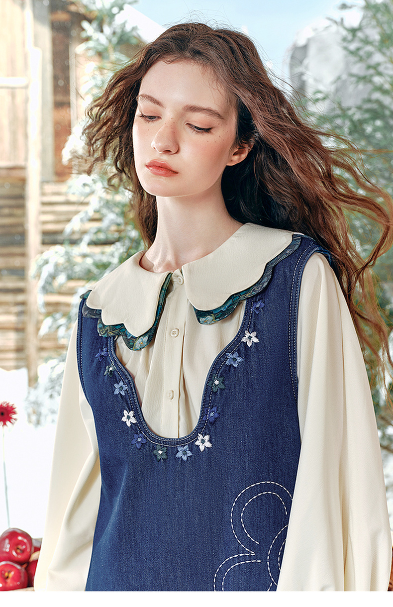 两三事浮光破晓2024冬季新款复古绣花渐变色加绒牛仔背带裙连衣裙