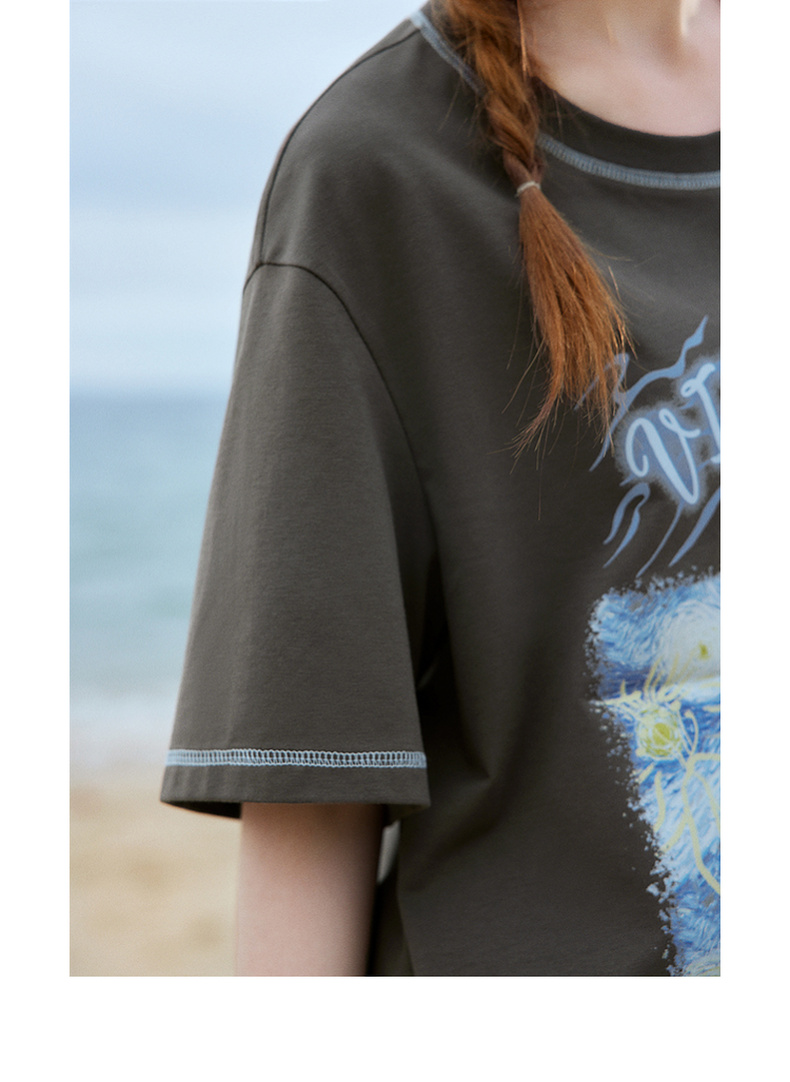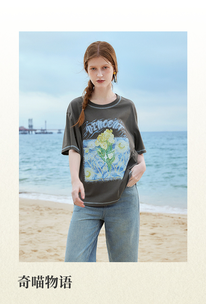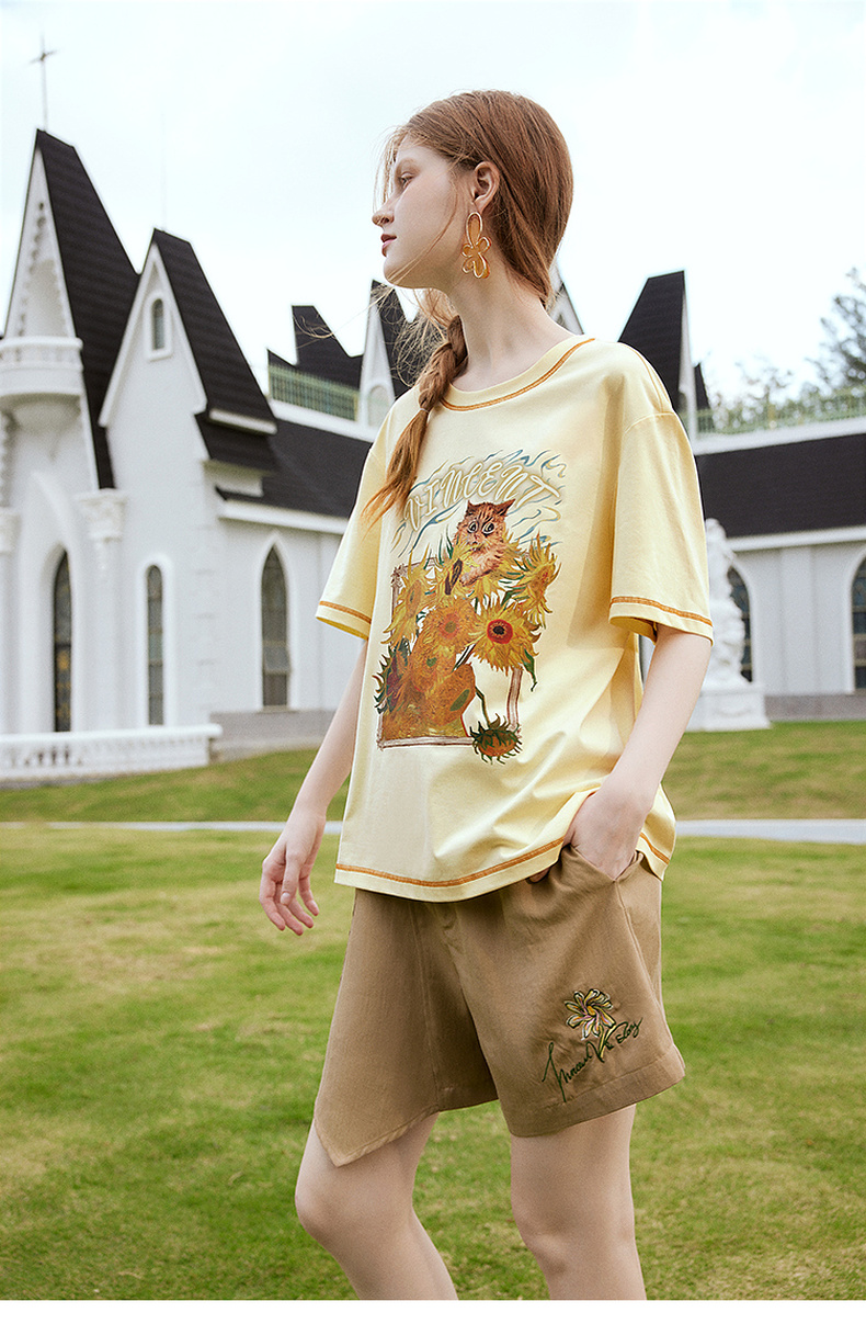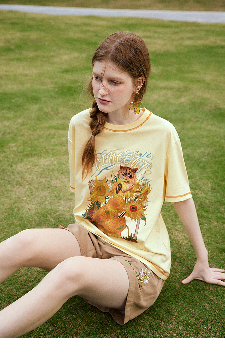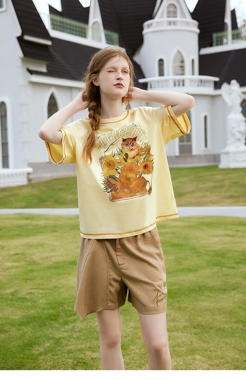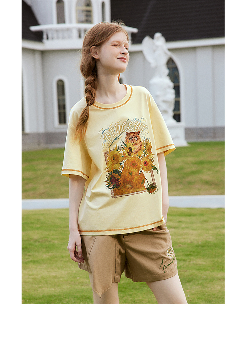 两三事梵高文艺奇喵物语2024春季新款复古油画印花棉质短袖t恤女