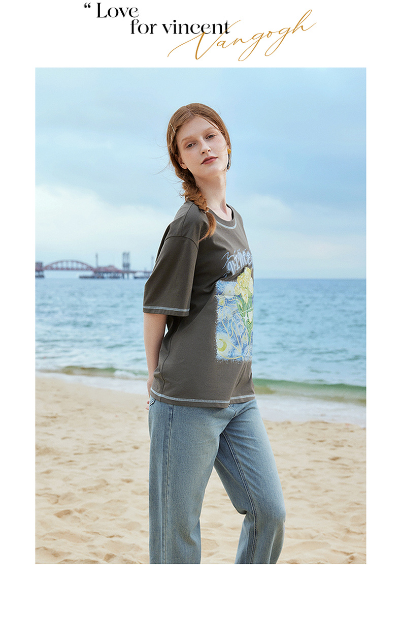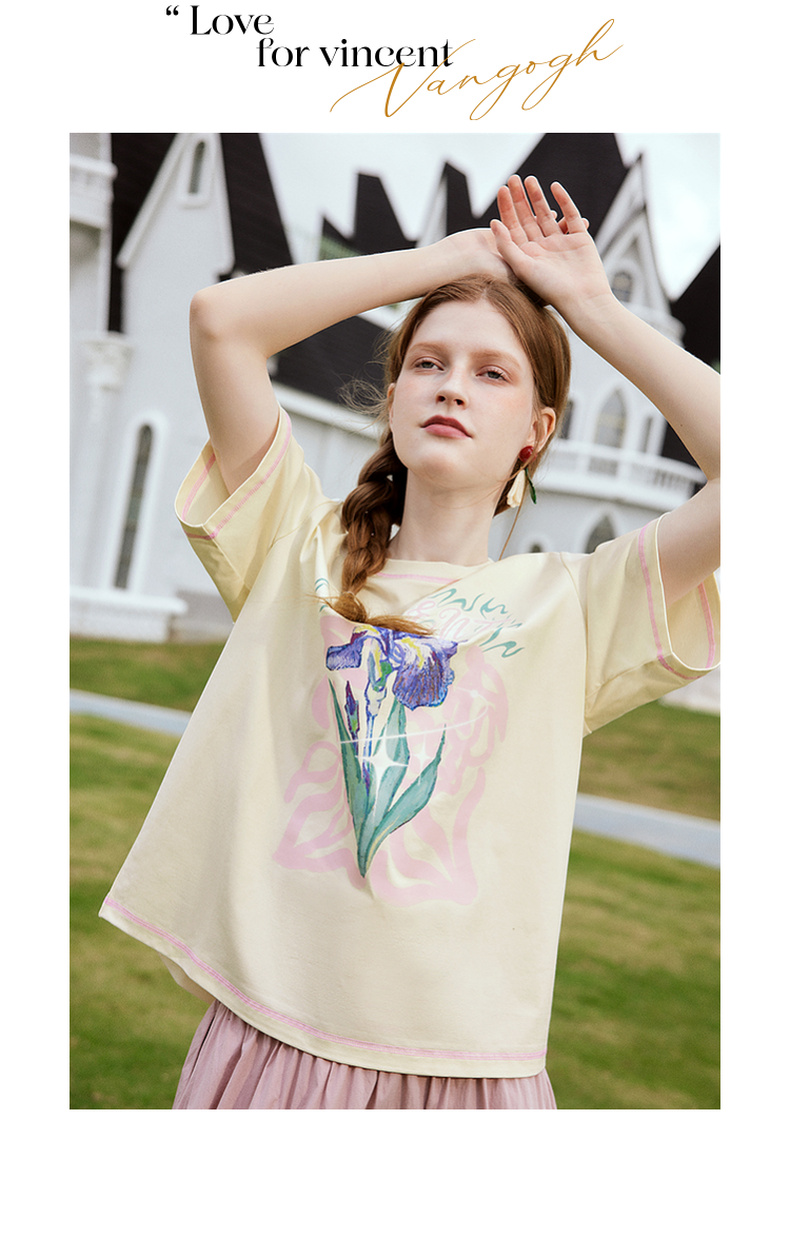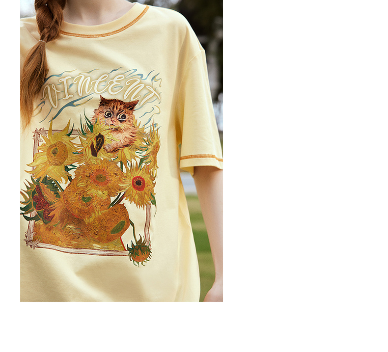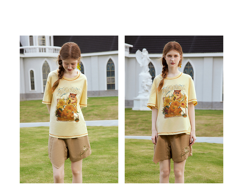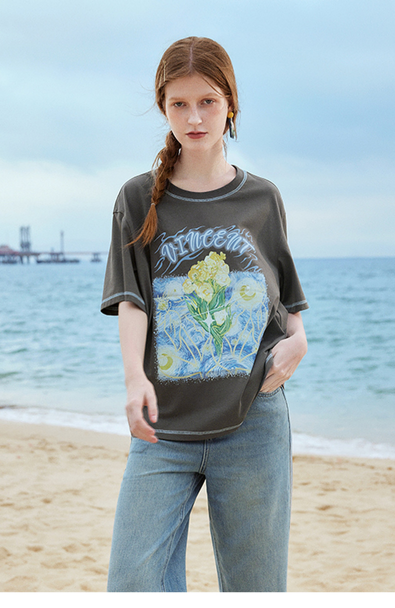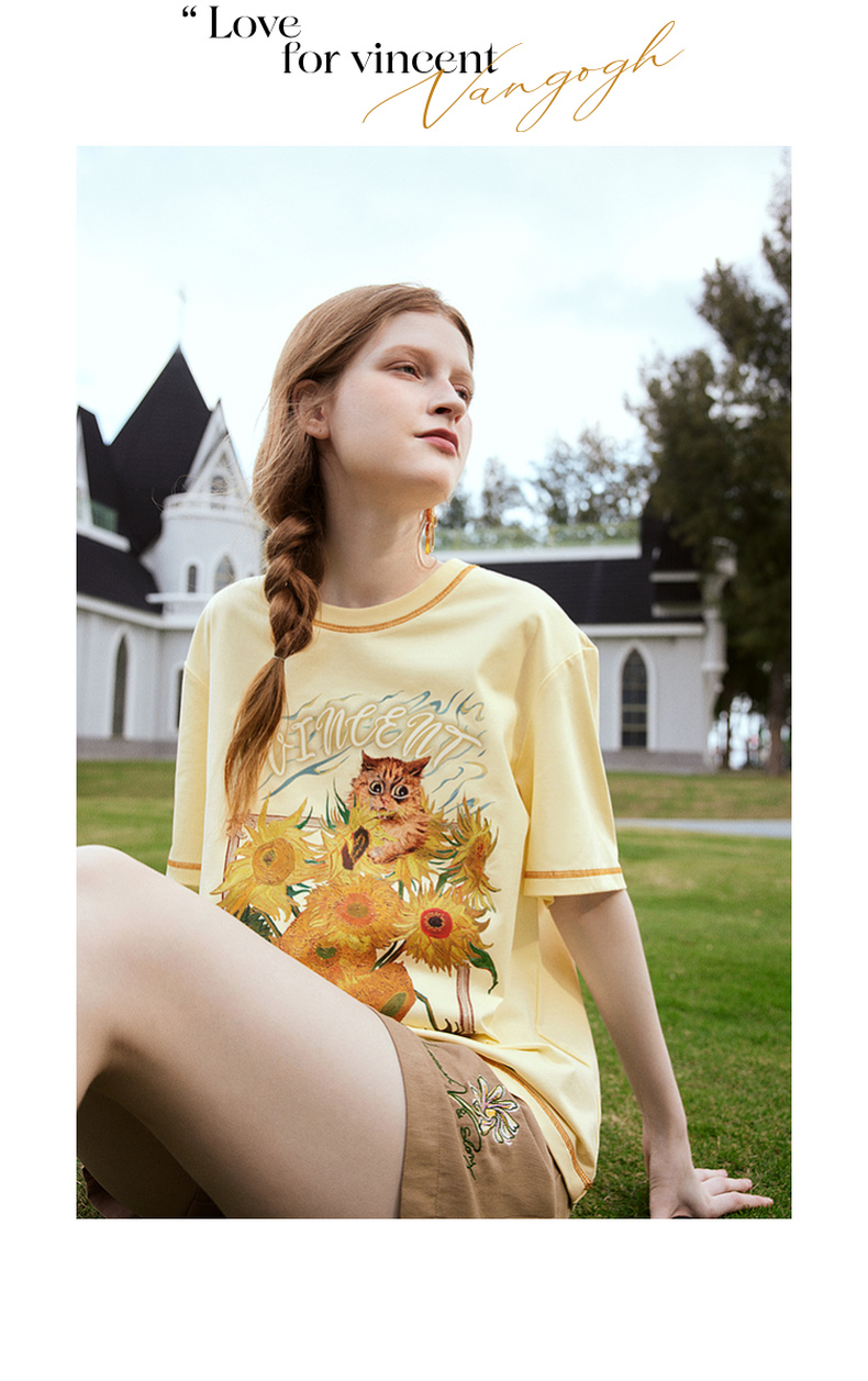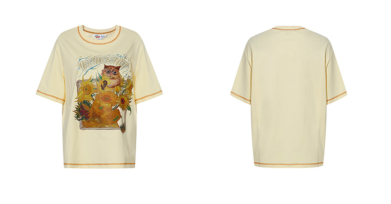 两三事梵高文艺奇喵物语2024春季新款复古油画印花棉质短袖t恤女