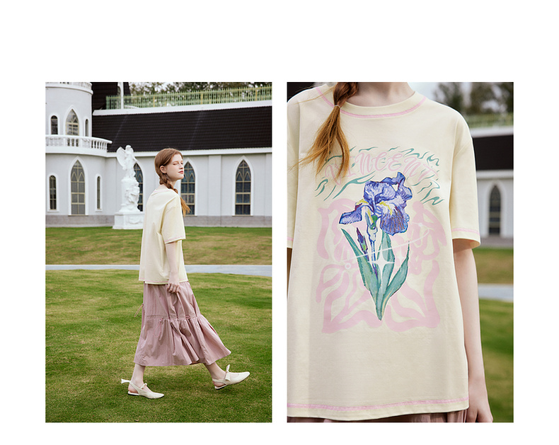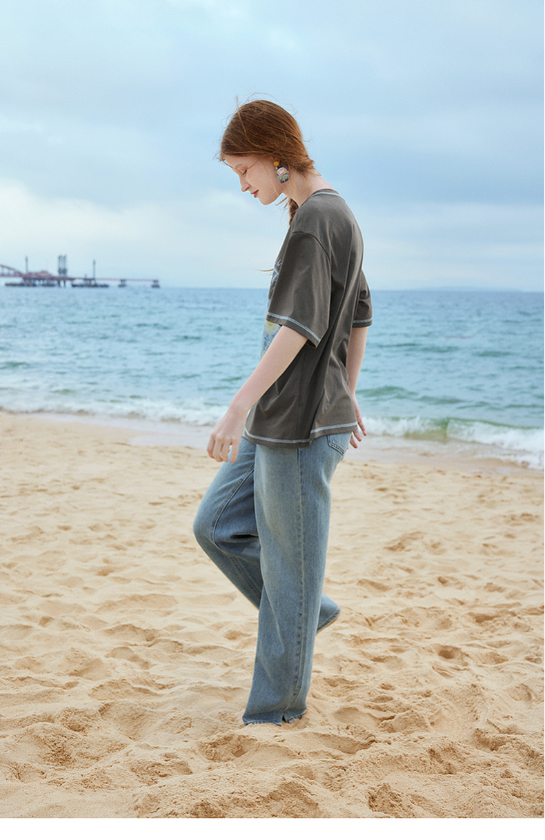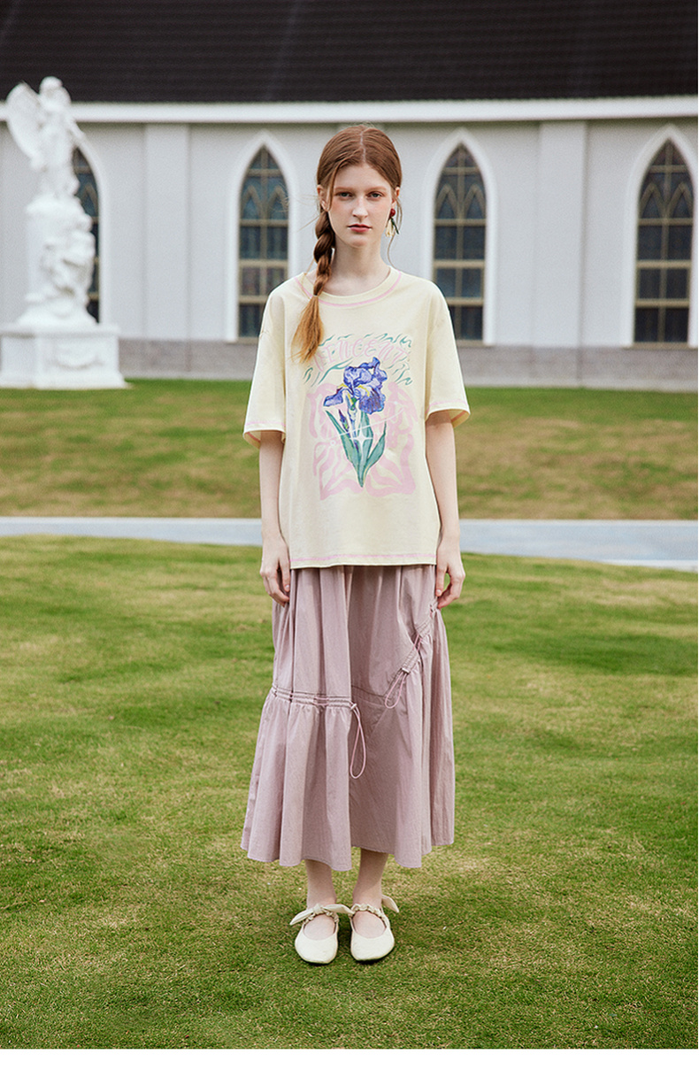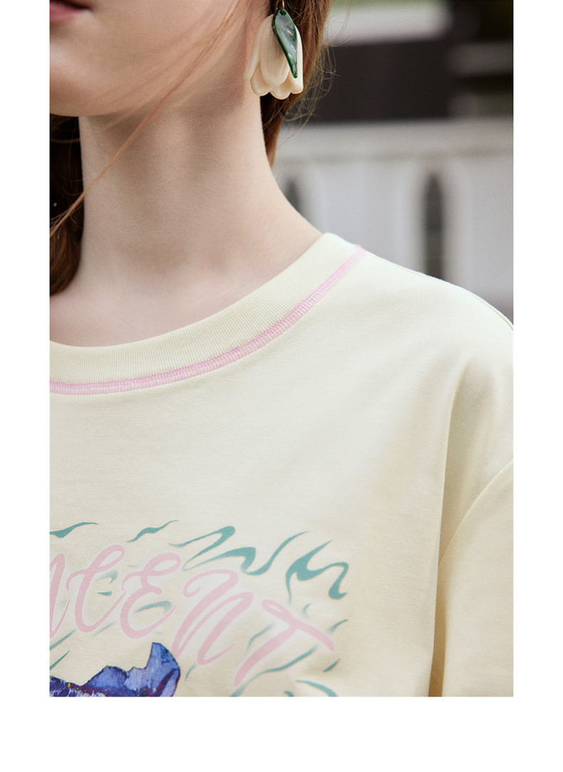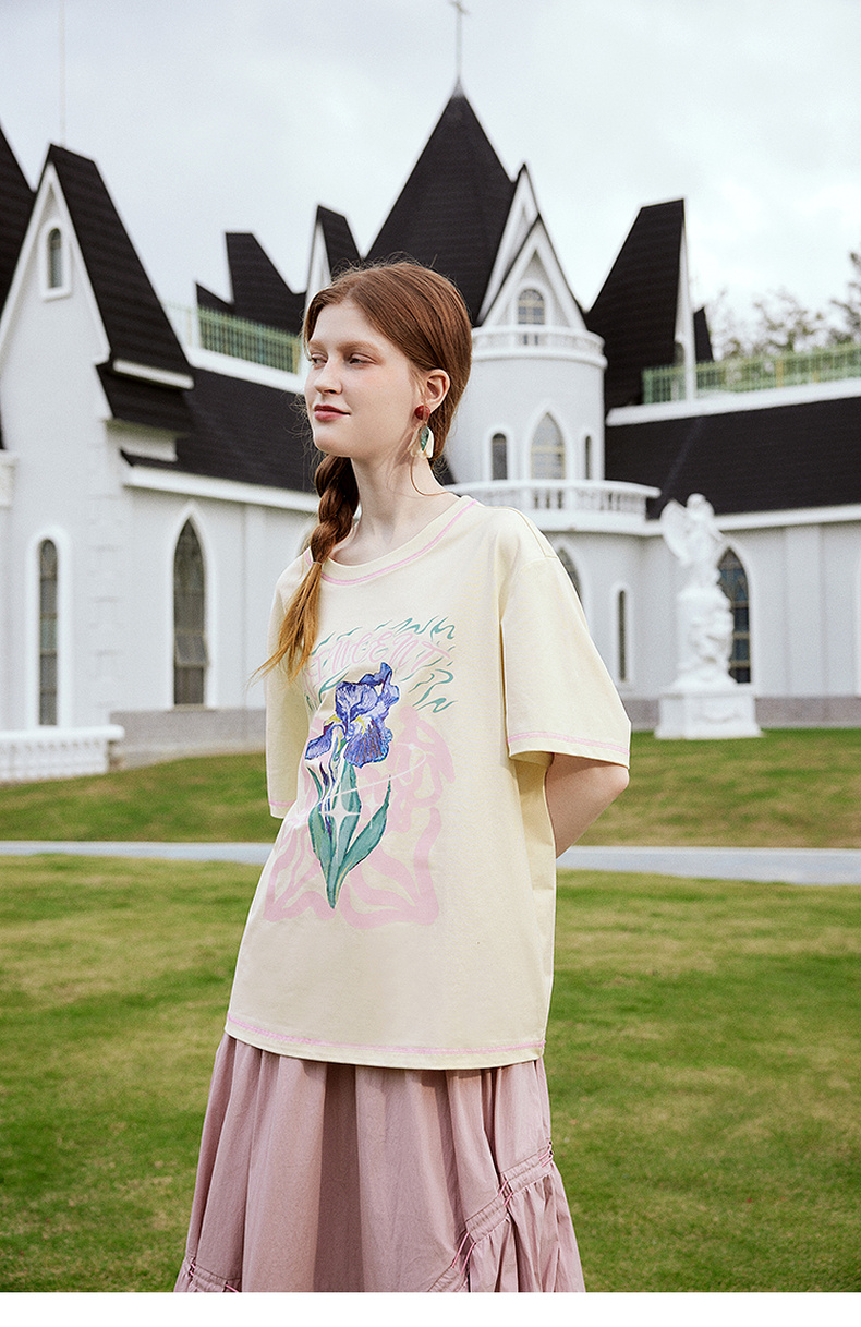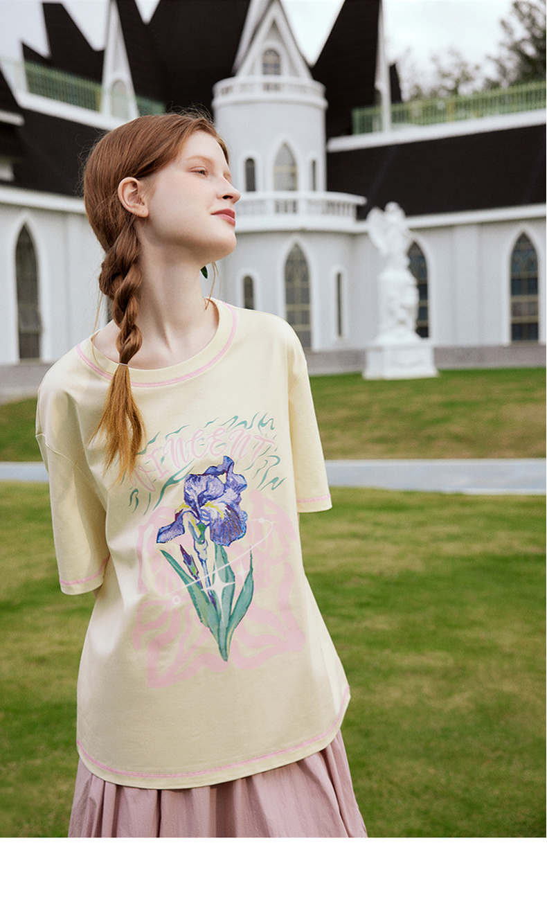 两三事梵高文艺奇喵物语2024春季新款复古油画印花棉质短袖t恤女