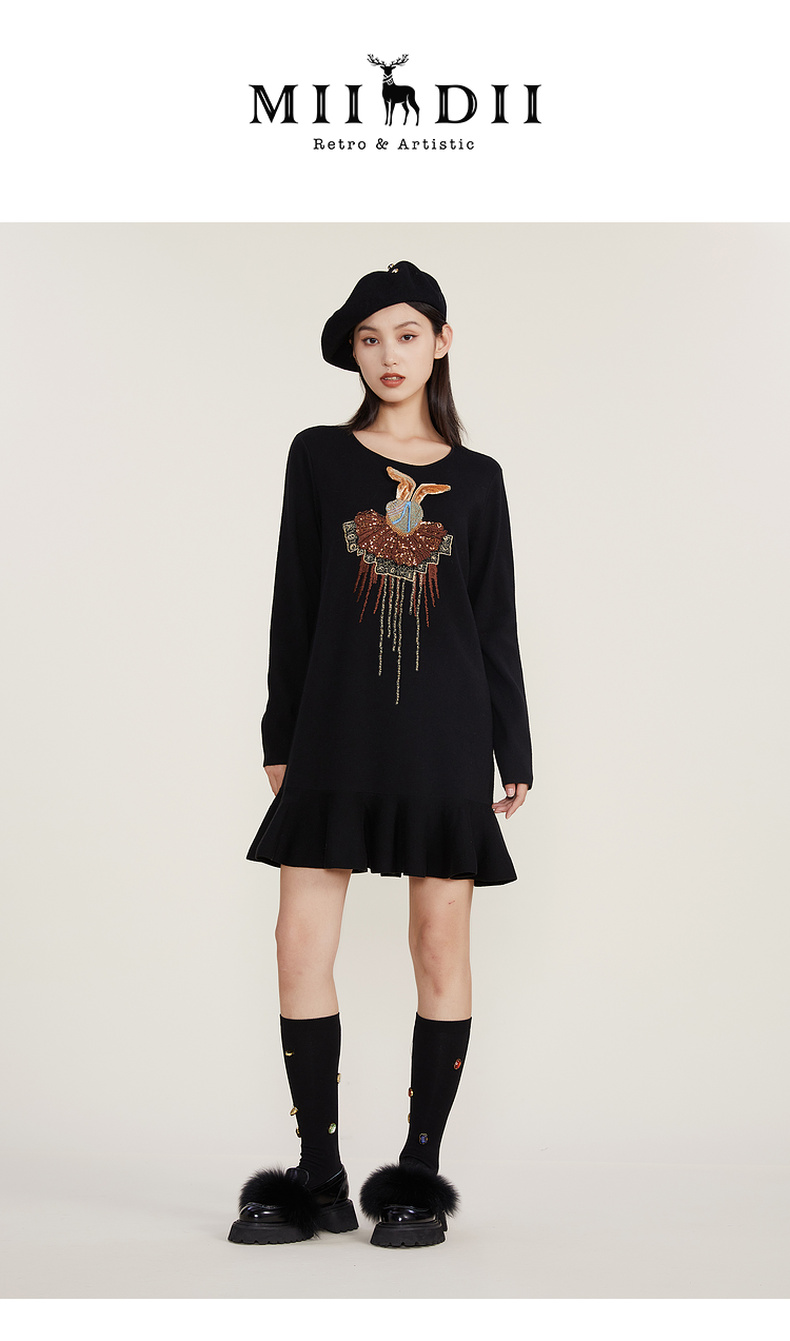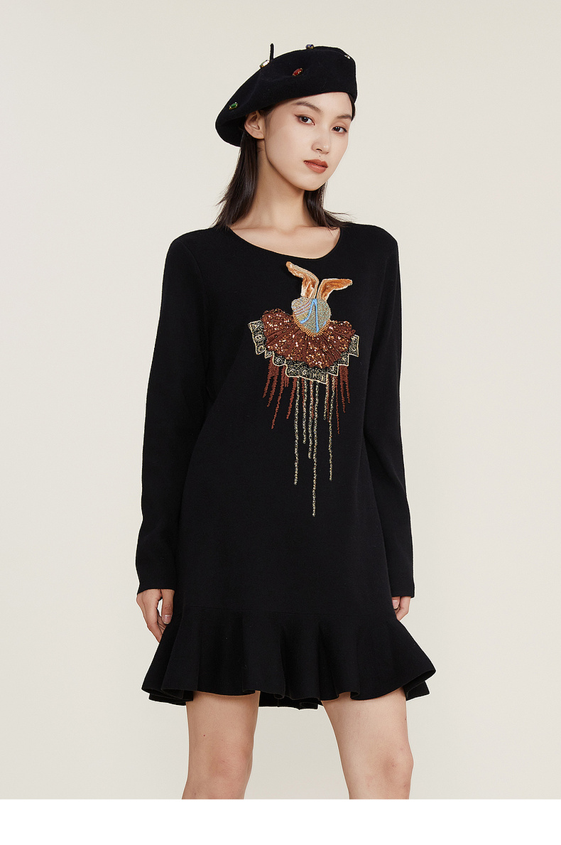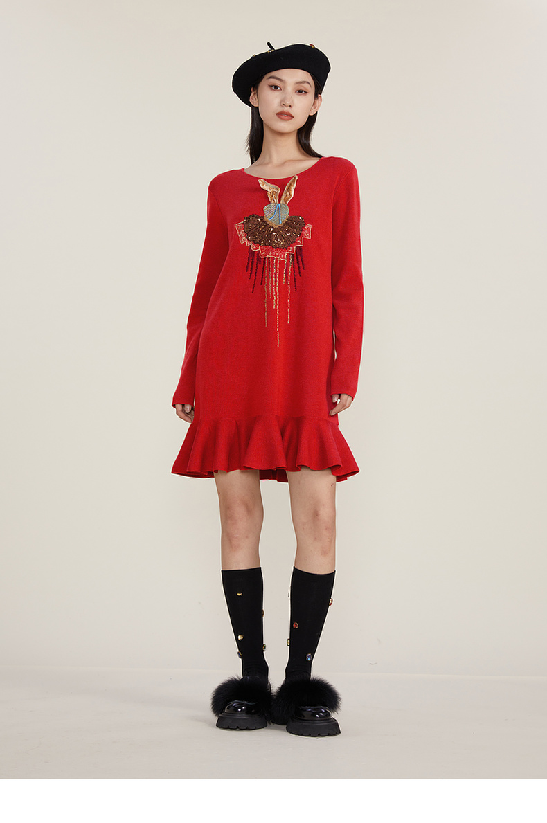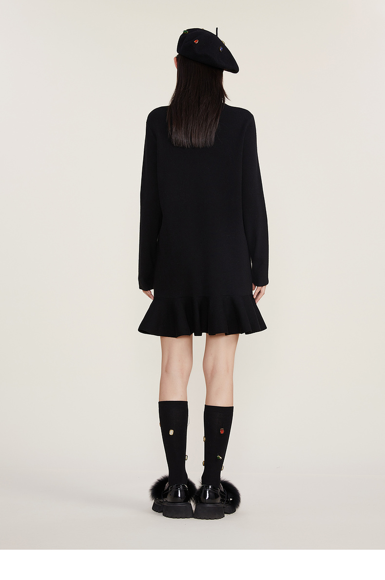 谜底中长款针织衫2022冬新款复古趣味绣花荷叶边连衣裙224MZ1932