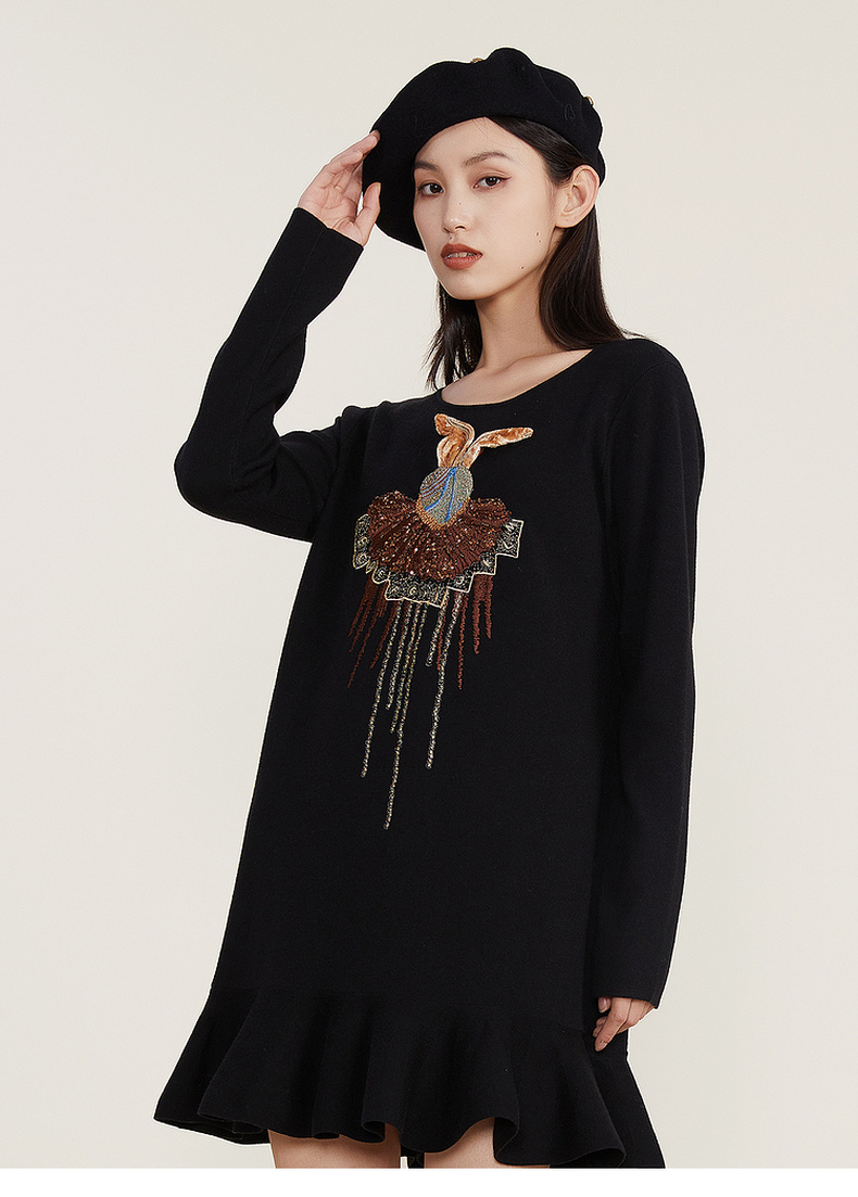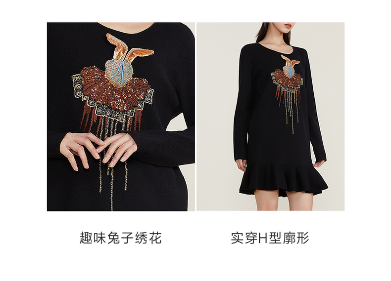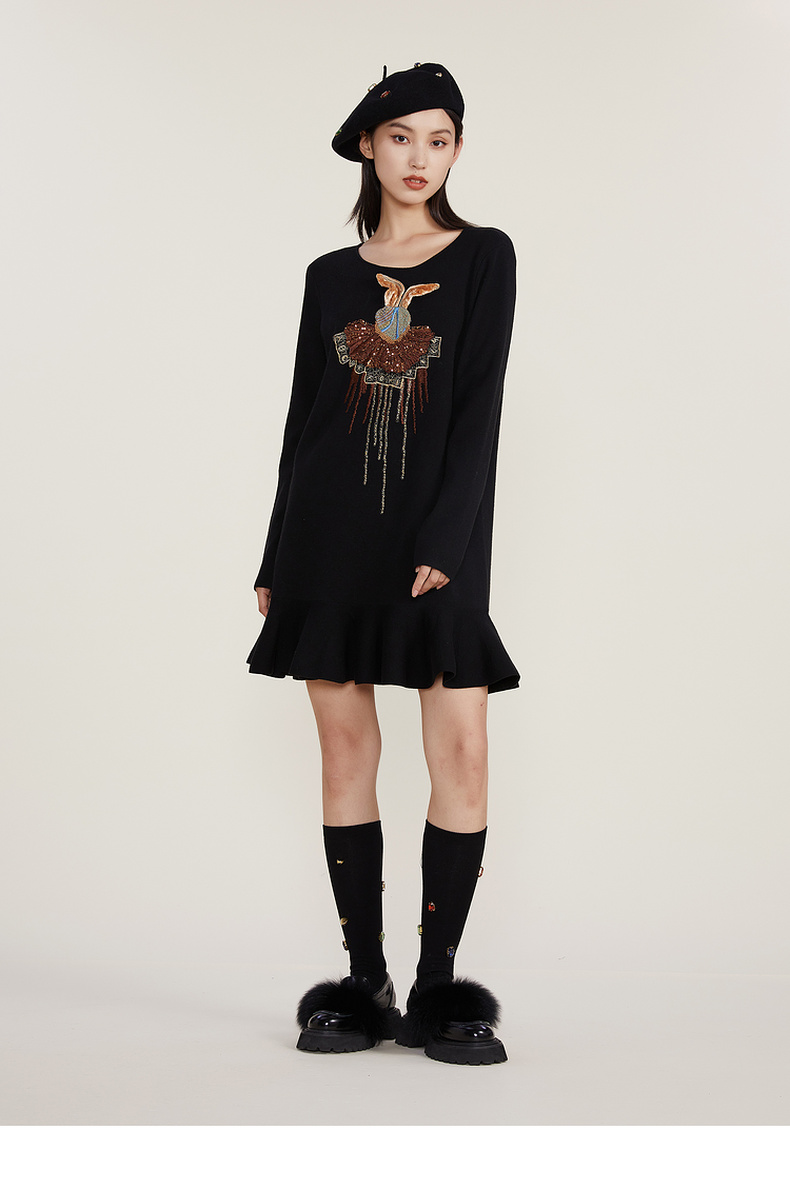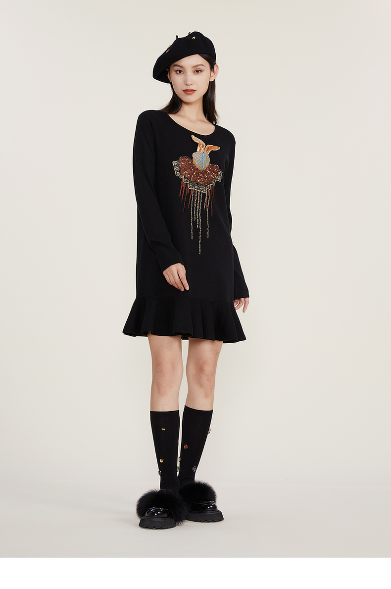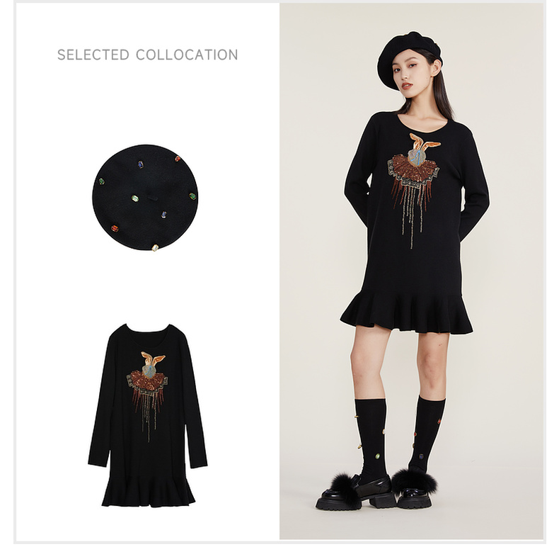 谜底中长款针织衫2022冬新款复古趣味绣花荷叶边连衣裙224MZ1932