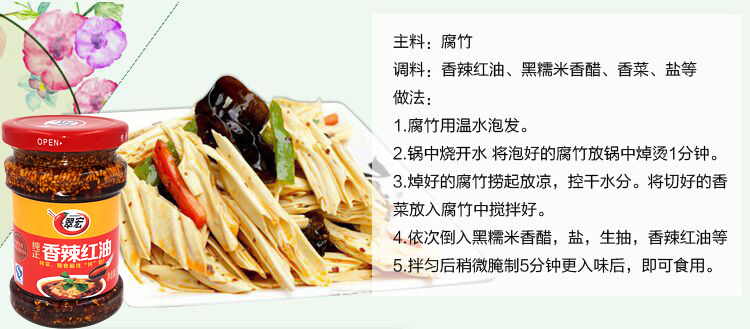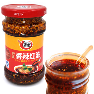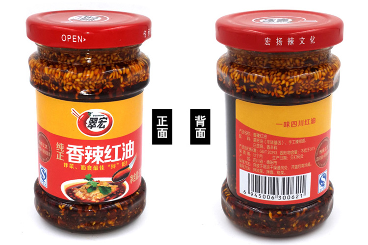 ![]() | 【产品名称】:翠宏香辣红油(辣椒油/油泼辣子) 【净含量】:200g</br> 【产品配料】菜籽油(非转基因)、手工辣椒面、白芝麻、香辛料等</br> 【保质期】:12个月</br> 【产地】:四川德阳</br> 【生产日期】:见盖子上方</br> 【储存条件】:存放于阴凉干燥通风处,开盖后需冷藏</br> |