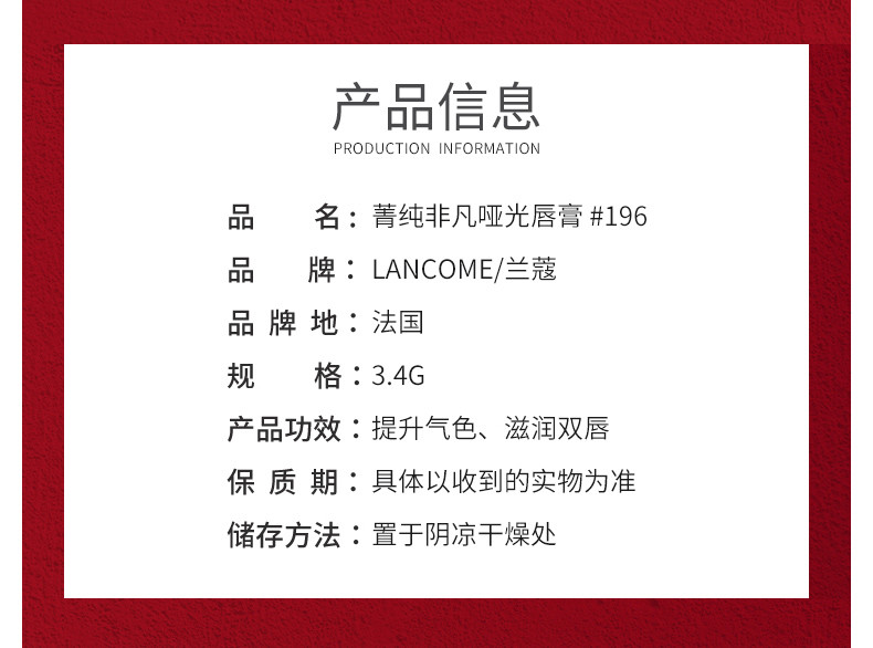 法国 LANCOME兰蔻 菁纯非凡哑光唇膏 #196 3.4G 朱砂橘 刘涛同款