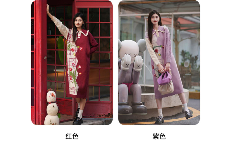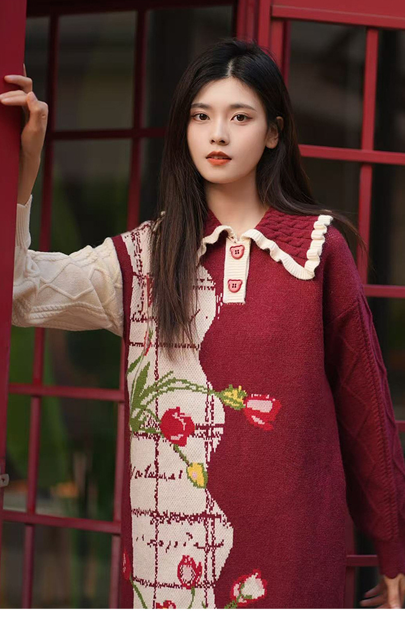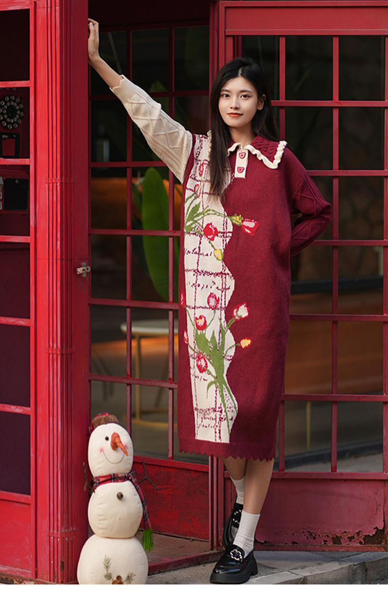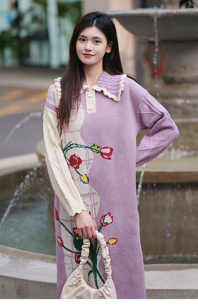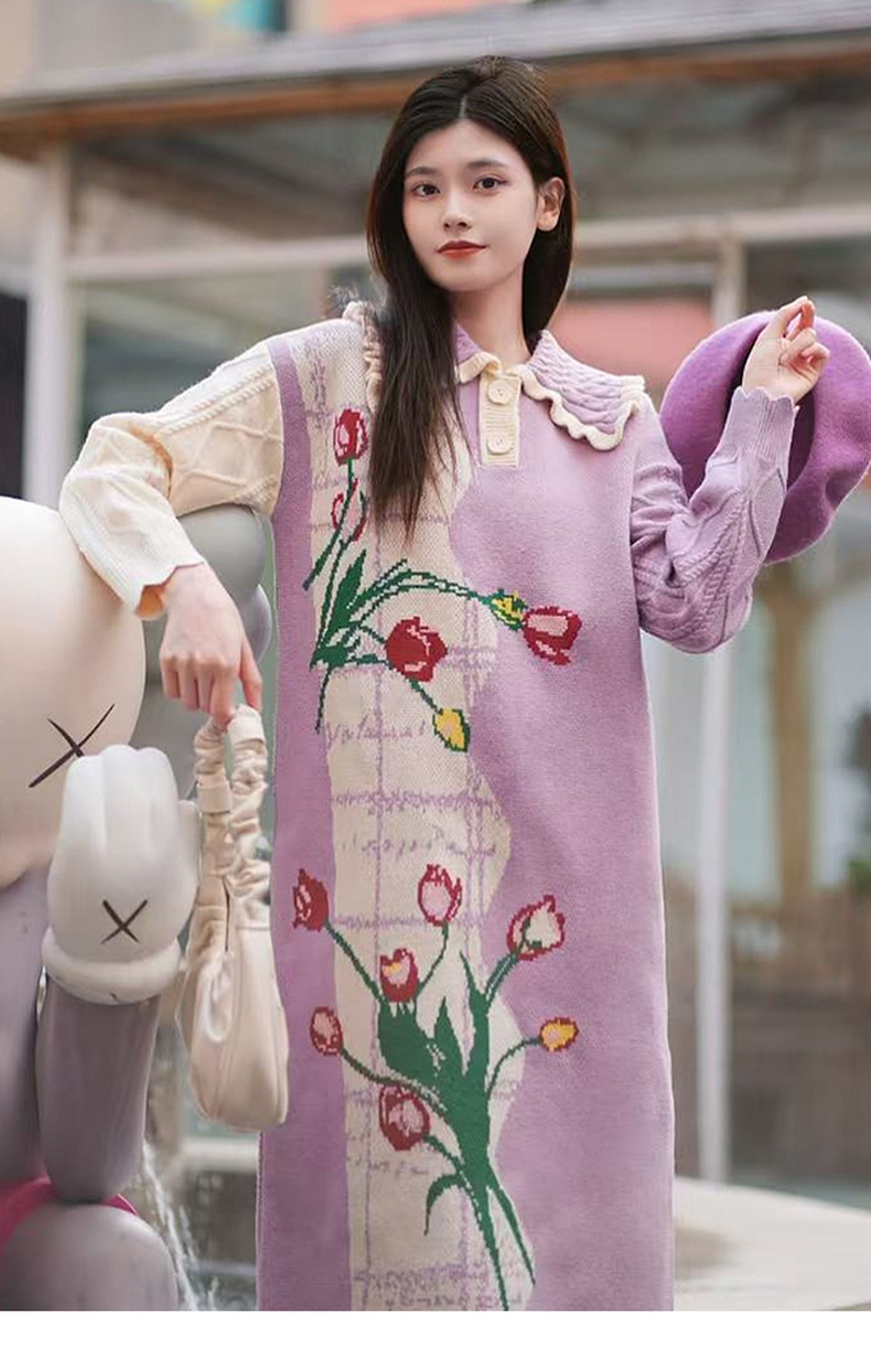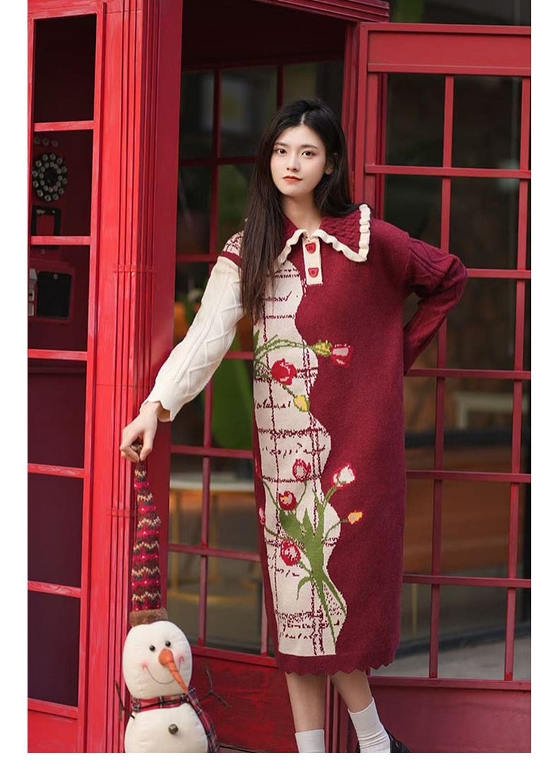 两三事 半晓花事 2024冬季新款森女风菱形格编织花色毛衣裙连衣裙