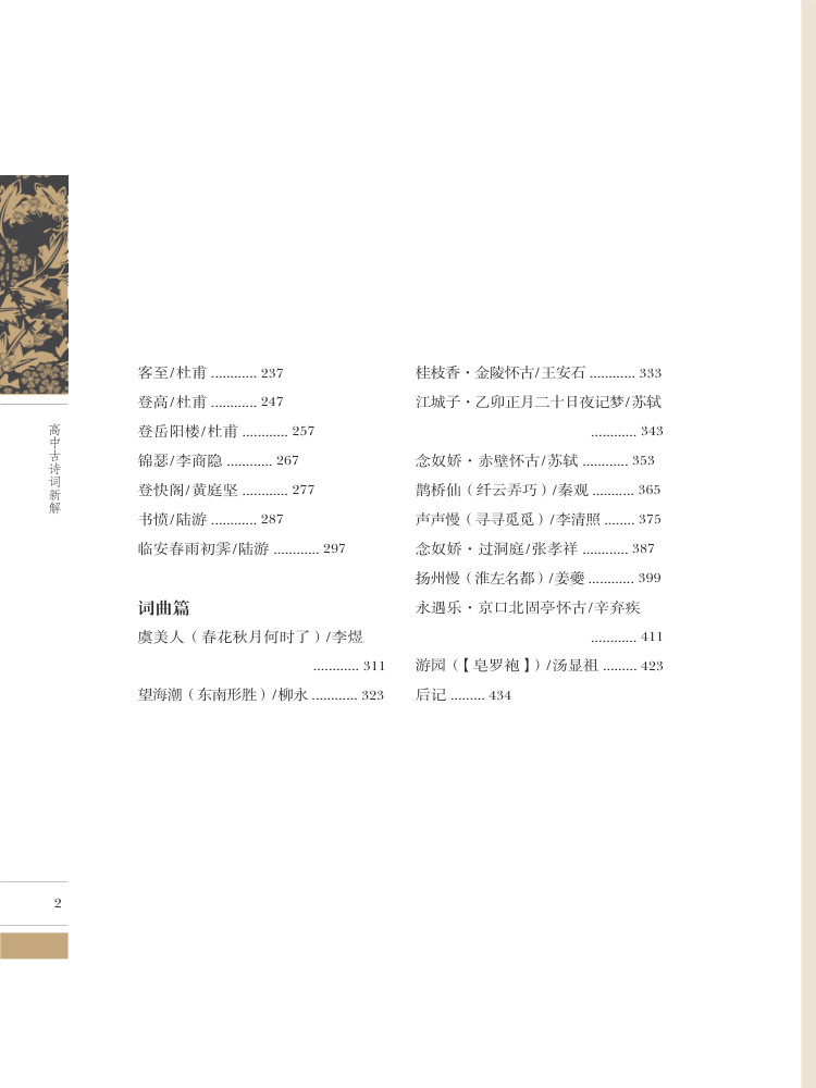 本书对高中语文教科书中的古代诗词曲进行新的解读,每篇古代诗词曲的解读分为“文本解读”“知识要点”“学习拓展”“教学建议”四部分。作者在专业研究和长期积累的基础上,吸收相关学术成果,选取影响作品理解的关键要点,对作品进行正本清源、深入浅出的解读,尝试解决高中语文古代诗词曲教学中长期存在的文本误读、偏读等问题,并提供相关拓展性知识。本书旨在为读者阅读高中语文古代诗词曲提供新视野和新思路,提升读者的文本解读能力,加深读者对这些经典诗词曲中所蕴含的宝贵的思想、情感、艺术及文化价值的理解,助力读者语文及人文素养的综合提升。