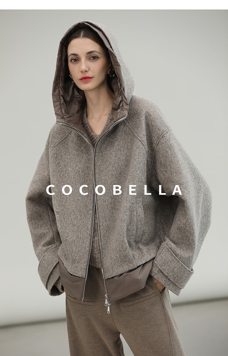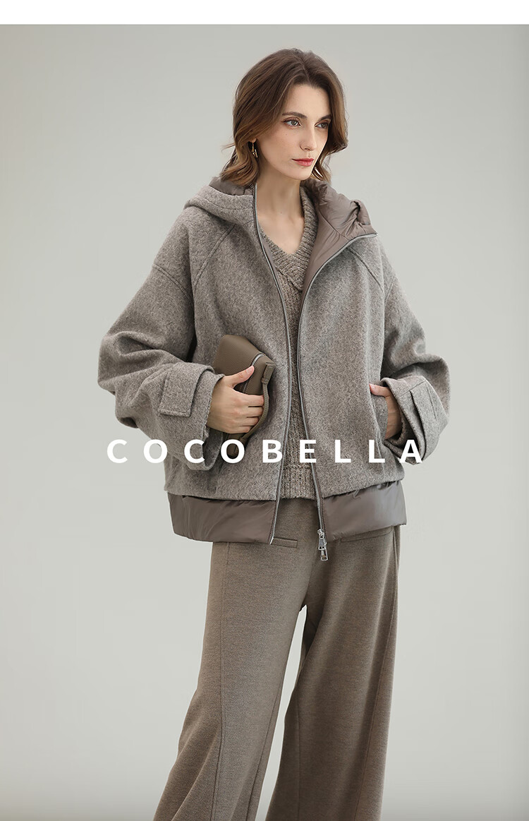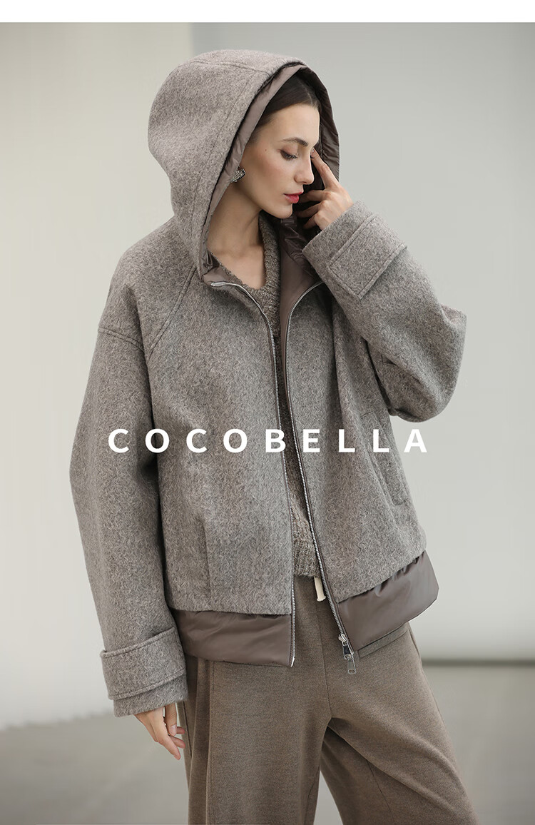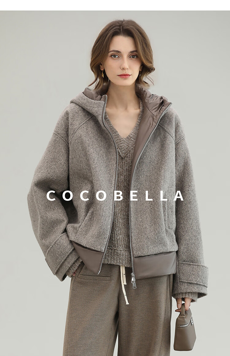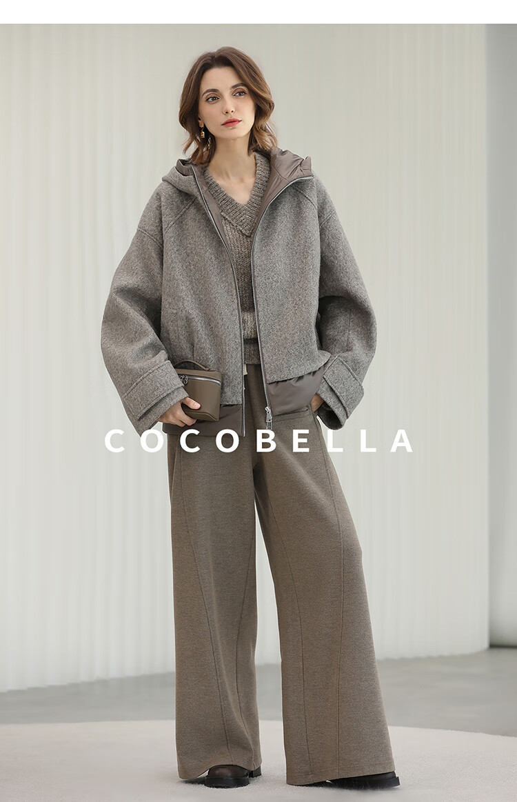 COCOBELLA假两件连帽毛呢外套女秋冬仿水波纹短款呢子大衣WL3205