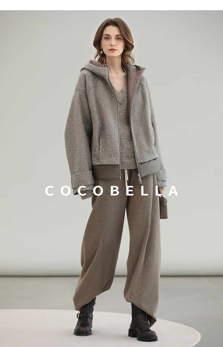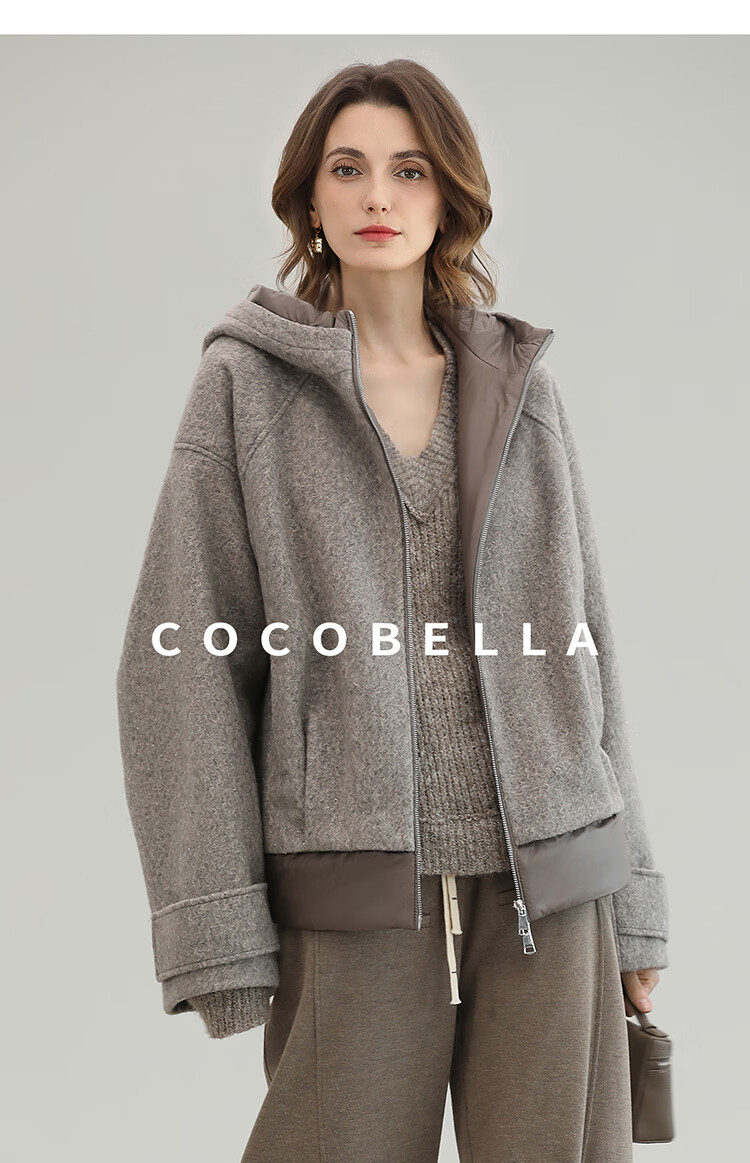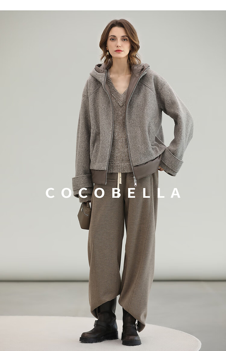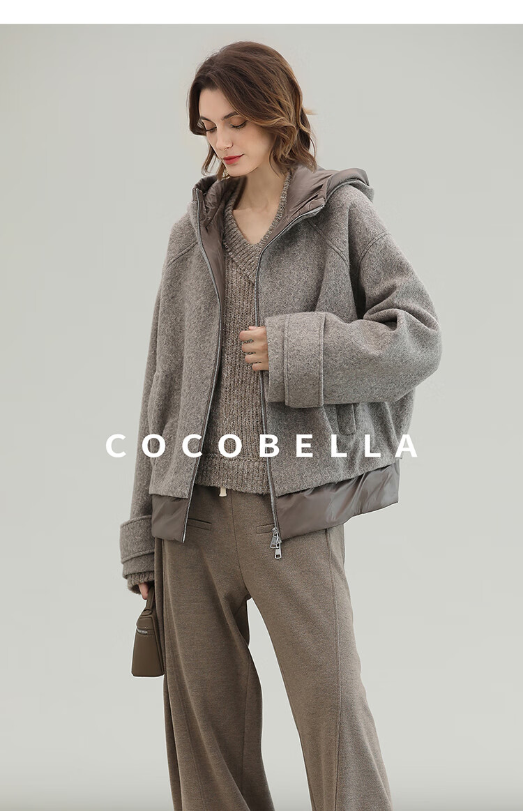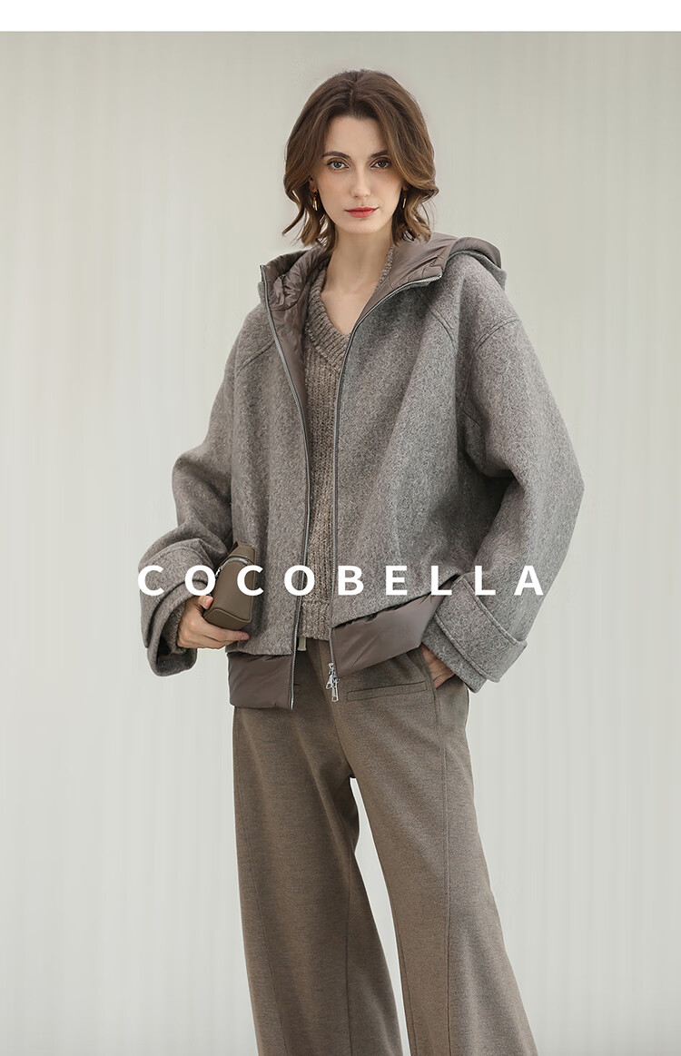 COCOBELLA假两件连帽毛呢外套女秋冬仿水波纹短款呢子大衣WL3205