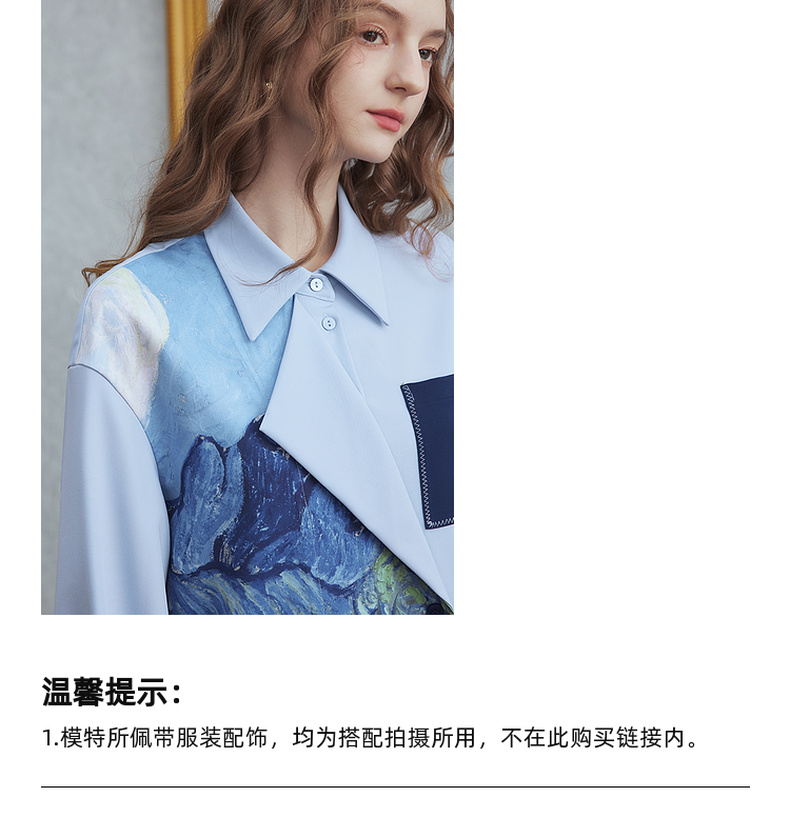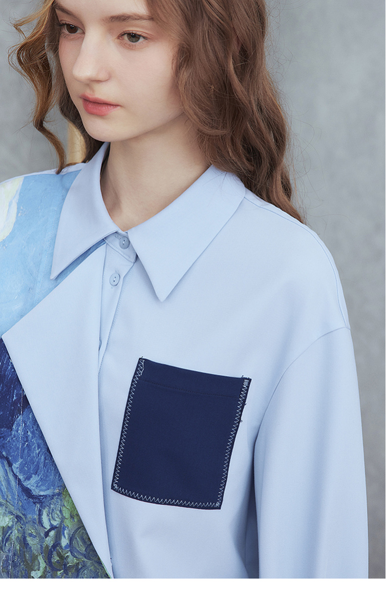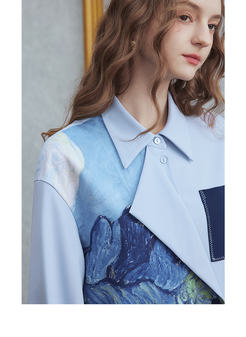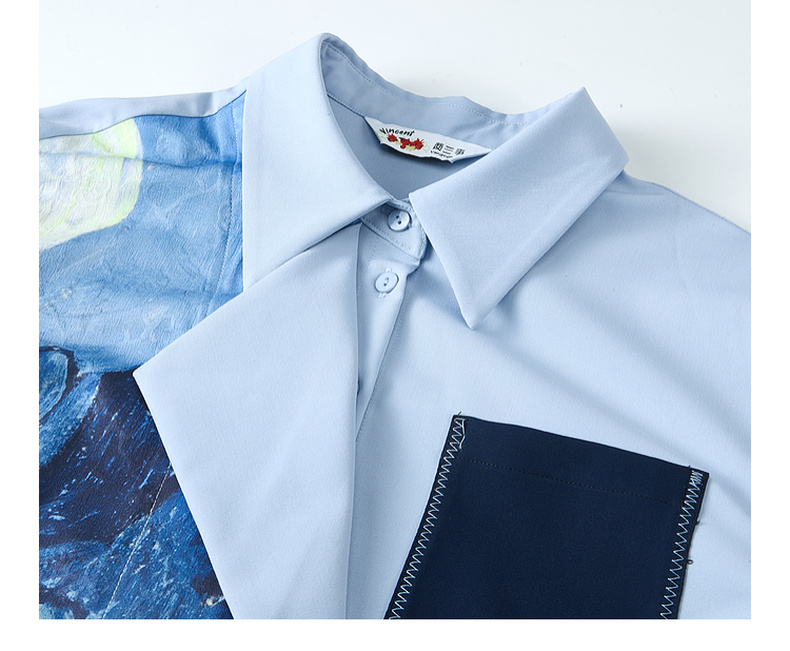 两三事梵高文艺异度野鸢2025秋季新款印花布拼接假两件长袖衬衫女